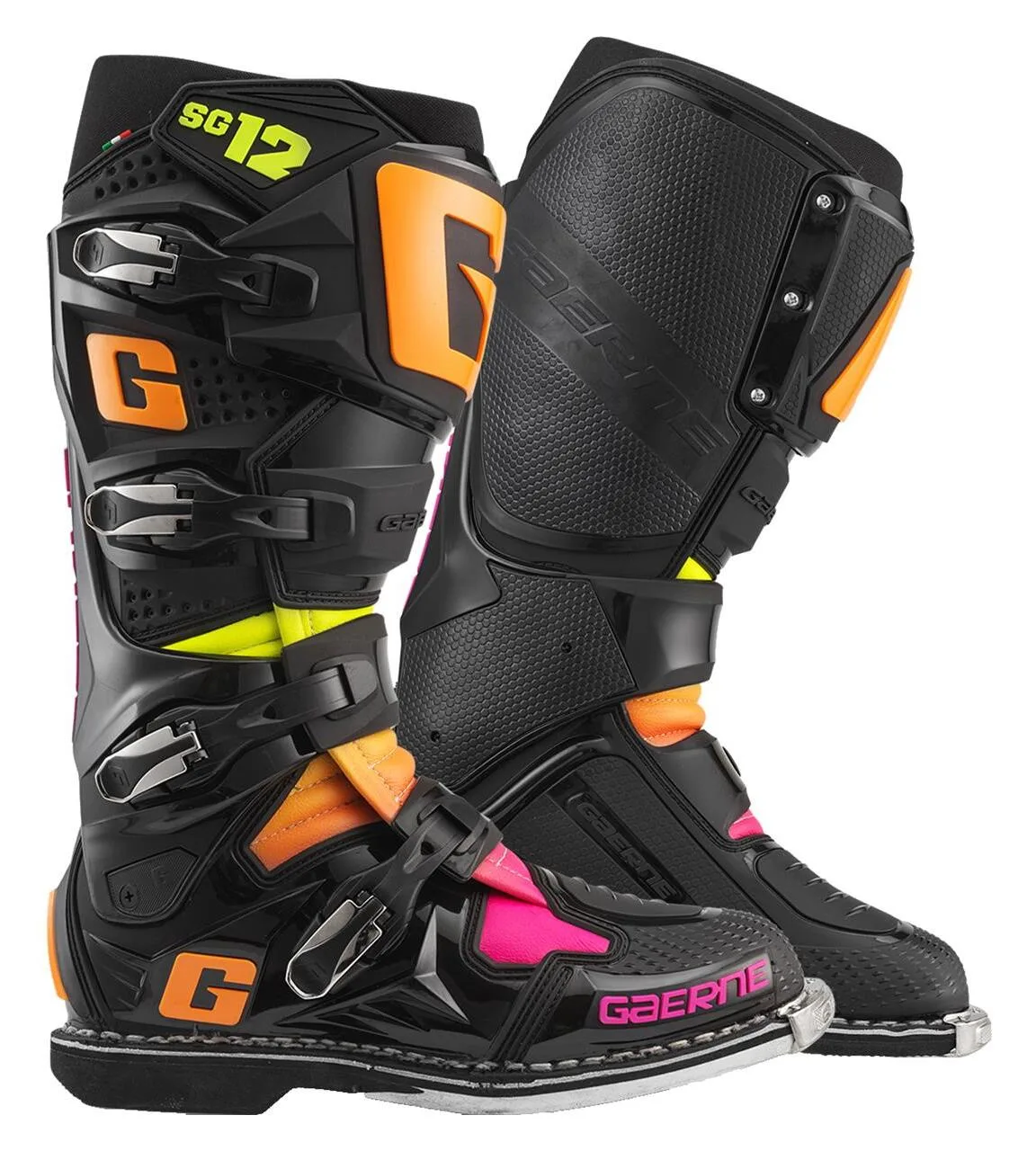 Gaerne продолжает покорять рынок своими ботинками для мотокросса профессионального уровня SG-12. Революционная конструкция двухступенчатой ​​поворотной системы запатентована и является эксклюзивной для Gaerne, что гарантирует ее успех. Первый шарнир прикреплен к «бритвенной спинке», которая обеспечивает жесткий компонент и надежную боковую поддержку, в то время как скользящая пластина удерживает верх в устойчивом вертикальном положении. В SG-12 используются четыре пряжки из легкого сплава, которые крепятся к регулируемому ремню. Это «Проверенная и надежная» система, которая обеспечивает райдеру безотказную систему «Легко войти» и «Легко выйти».