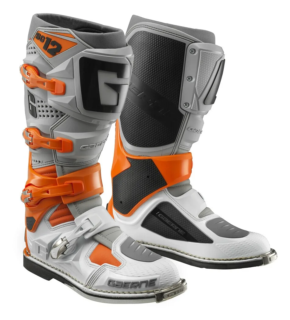 Gaerne продолжает покорять рынок своими ботинками для мотокросса профессионального уровня SG-12. Революционная конструкция двухступенчатой ​​поворотной системы запатентована и является эксклюзивной для Gaerne, что гарантирует ее успех. Первый шарнир прикреплен к «бритвенной спинке», которая обеспечивает жесткий компонент и надежную боковую поддержку, в то время как скользящая пластина удерживает верх в устойчивом вертикальном положении. В SG-12 используются четыре пряжки из легкого сплава, которые крепятся к регулируемому ремню. Это «Проверенная и надежная» система, которая обеспечивает райдеру безотказную систему «Легко войти» и «Легко выйти».