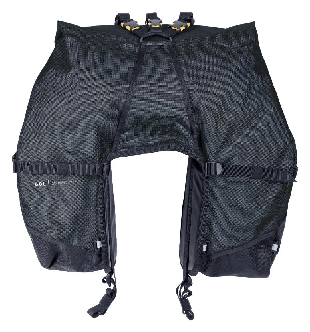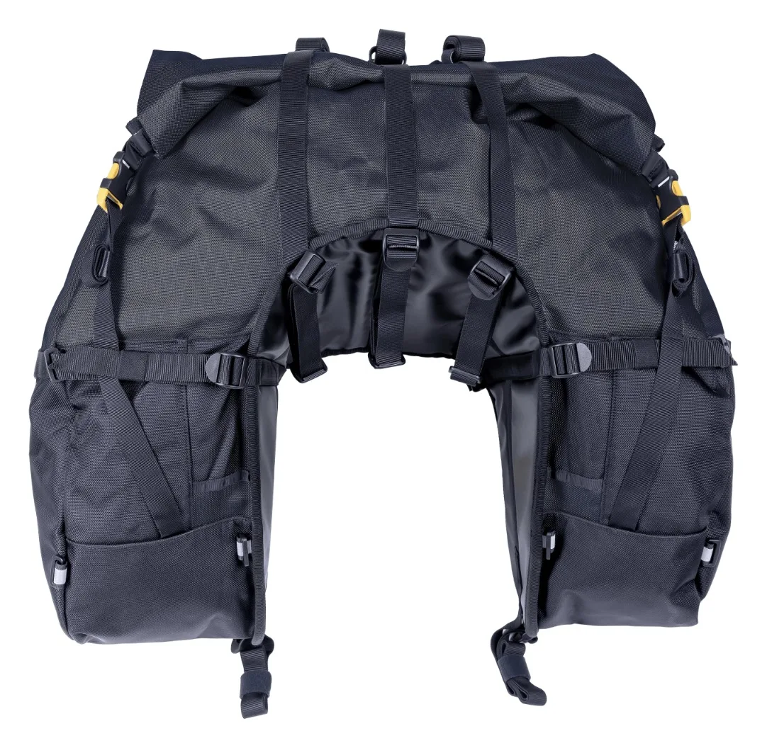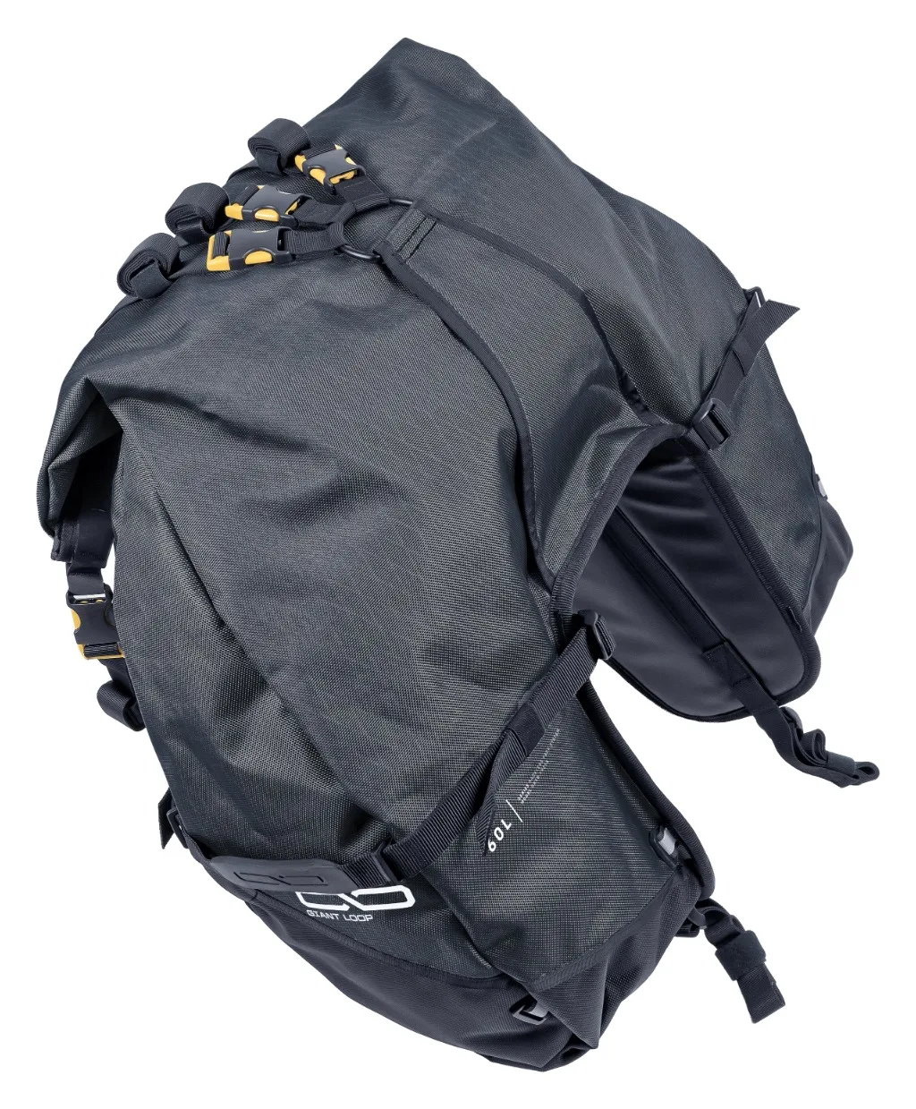 Может быть, это комплект седельных сумок-близнецов, соединенных вместе, или, может быть, это спортивная сумка, которая свисает с обеих сторон. Мы можем спорить друг с другом по поводу того, как это выглядит, но единственное, в чем мы можем согласиться, это то, что эта штука огромна. Обычно он вмещает целых 60 литров, но если вам действительно нужно дополнительное место для хранения, вы можете найти еще 8 литров, всего лишь один раз перевернув уплотнение (жертвуя первоначальной защитой от атмосферных воздействий в пользу объема хранения).