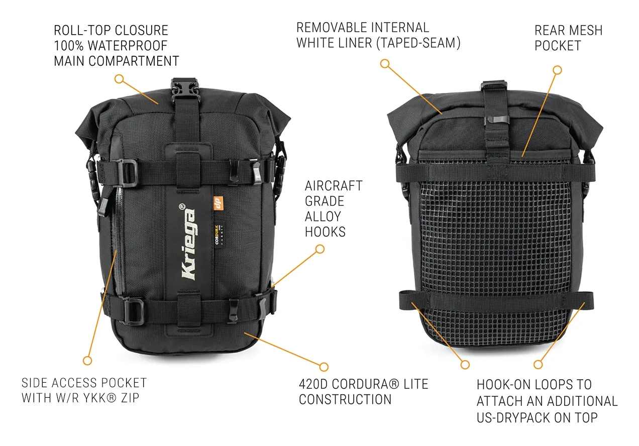 Серия сухих рюкзаков Kriega US на 100 % водонепроницаема и отлично подходит в качестве крыльевого рюкзака для эндуро или супермото (с болтовым креплением). Также его можно прикрепить к Hydro-3, R15, R20, R25, R30 или R35, увеличивая вместимость на 5 литров.