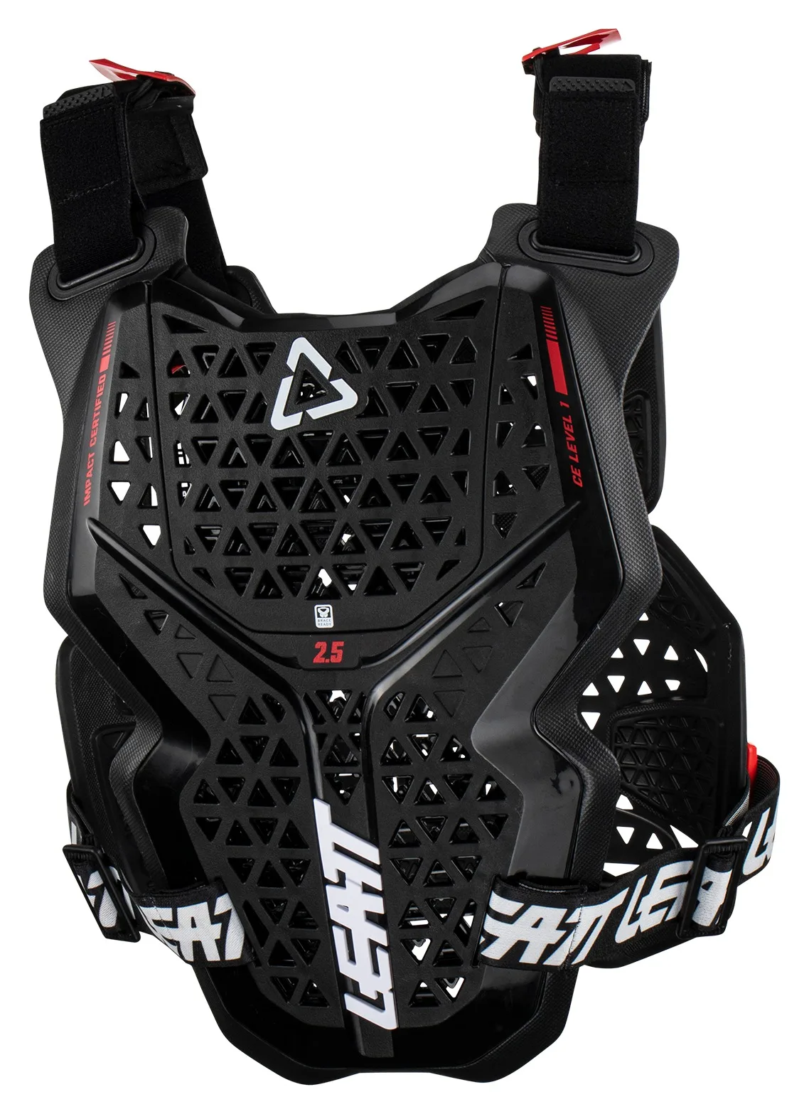 Защита груди 2.5 легкая и имеет прочную защиту для груди и сертифицированную CE защиту от ударов для спины. Трехмерный дизайн и регулируемые поясные ремни обеспечивают плотную, тонкую посадку, удобную и хорошо вентилируемую, а съемные пластины спереди и сзади означают, что он может работать как с шейным фиксатором Leatt, так и без него. Имеет оценку защиты Leatt 5 из 25, следующим шагом в уровне защиты груди является 3,5, который также обеспечивает защиту от ударов и груди.