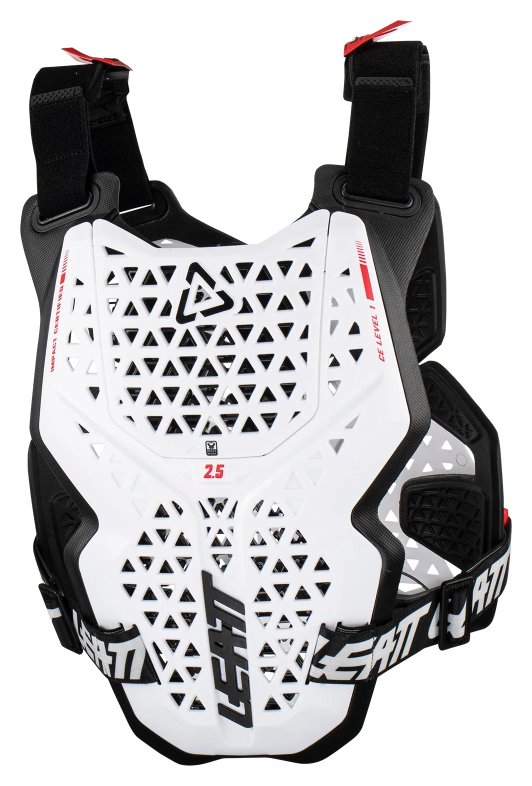 Защита груди 2.5 легкая и имеет прочную защиту для груди и сертифицированную CE защиту от ударов для спины. Трехмерный дизайн и регулируемые поясные ремни обеспечивают плотную, тонкую посадку, удобную и хорошо вентилируемую, а съемные пластины спереди и сзади означают, что он может работать как с шейным фиксатором Leatt, так и без него. Имеет оценку защиты Leatt 5 из 25, следующим шагом в уровне защиты груди является 3,5, который также обеспечивает защиту от ударов и груди.