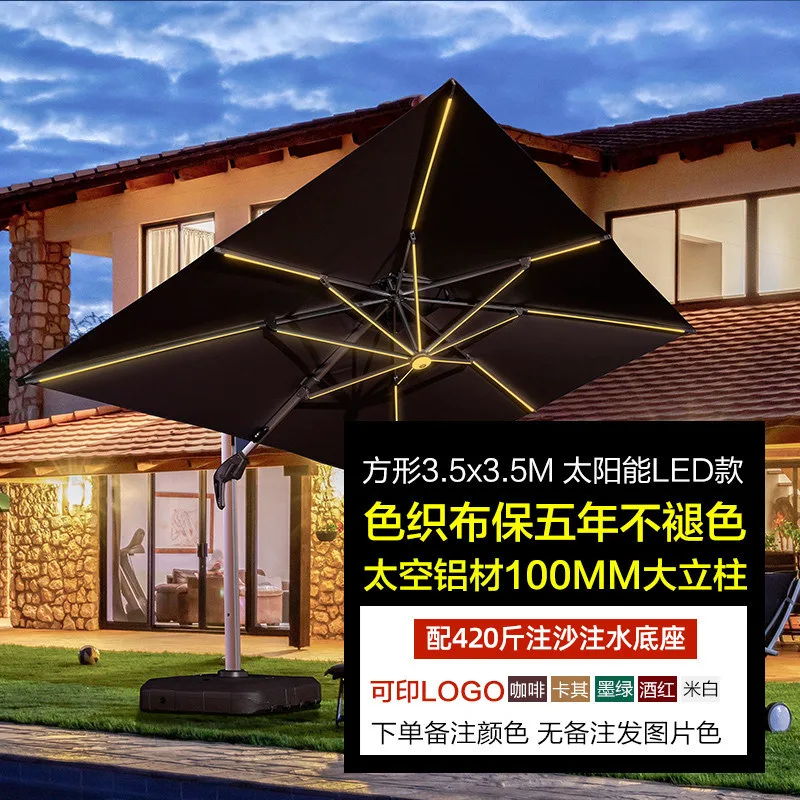 • Квадратный зонт 3.5х3.5 м с LED-подсветкой на солнечных батареях: Модель большого размера, оснащенная светодиодными лентами вдоль спиц, которые заряжаются от солнца.