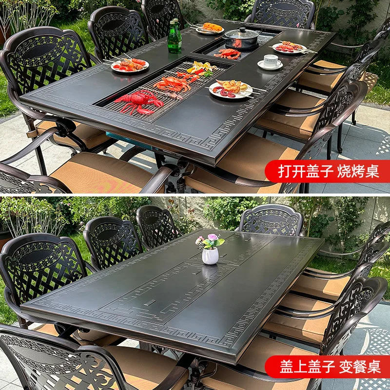 Состав: Прямоугольный стол для барбекю с двумя встроенными зонами для готовки и 8 стульев в стиле «Барокко» (巴克椅) из древесно-полимерного композита (ДПК).