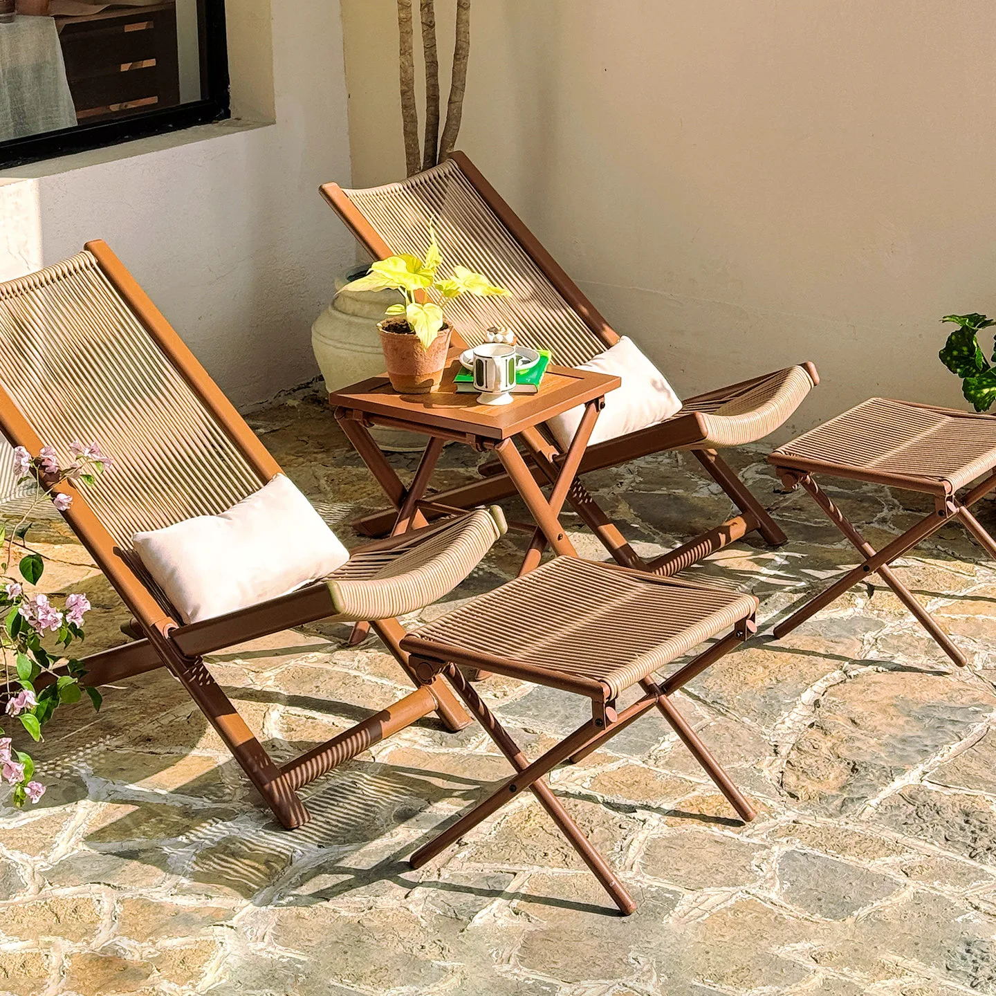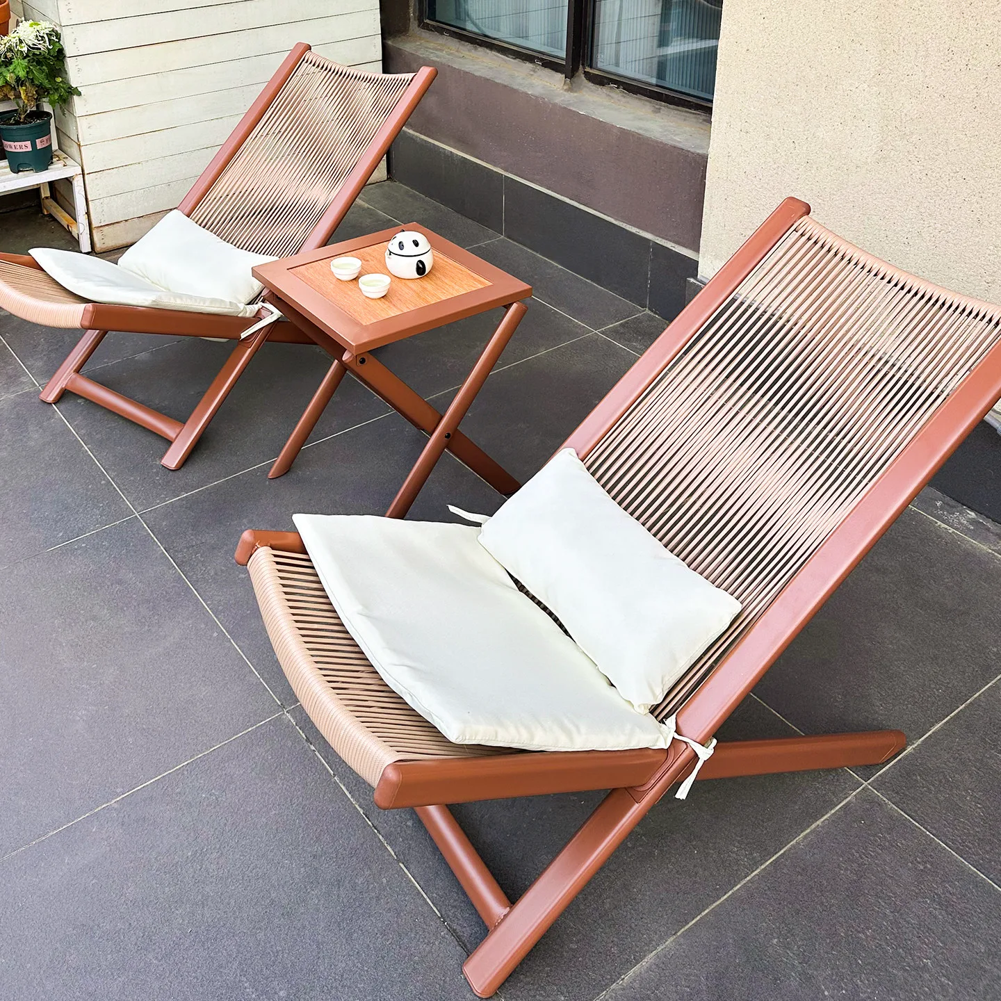 Элегантное складное кресло, сочетающее в себе современный минимализм и максимальный комфорт. Каркас из алюминиевого сплава в сочетании с износостойким веревочным плетением делает эту модель идеальной для отдыха на террасе, у бассейна или в лаунж-зоне сада.