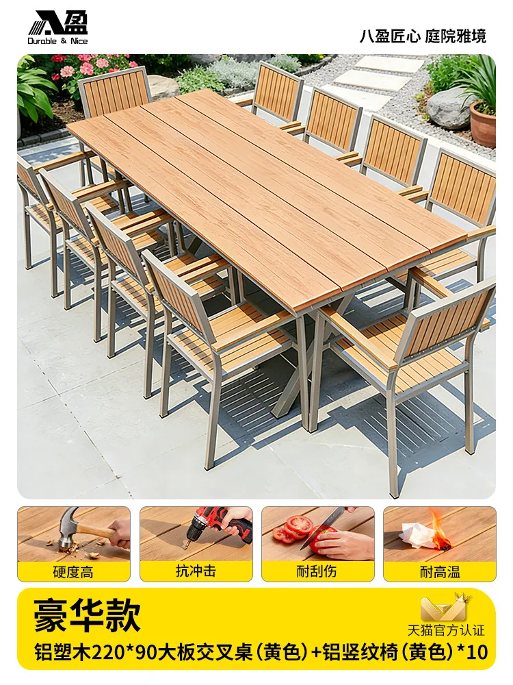 Комплект садовой мебели: 10 стульев, стол деревянный с крестообразными ножками, 220x90 см
