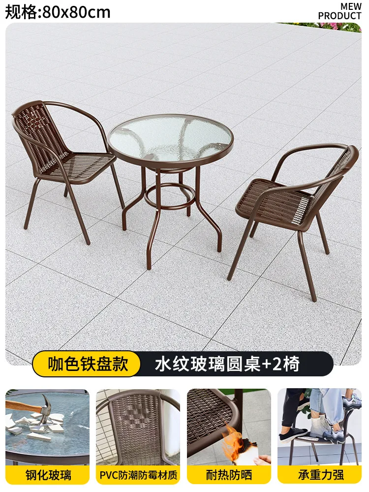 Этот элегантный гарнитур в стиле «легкая роскошь» создан для тех, кто ценит уют и долговечность. Центральный элемент набора — круглый стол диаметром 80 см с изысканной столешницей из закаленного стекла, дополненный двумя комфортабельными плетеными стульями. Благородный кофейный оттенок и имитация натурального ротанга позволяют комплекту гармонично смотреться как в классическом интерьере балкона, так и на открытой террасе ресторана или во внутреннем дворе загородного дома.