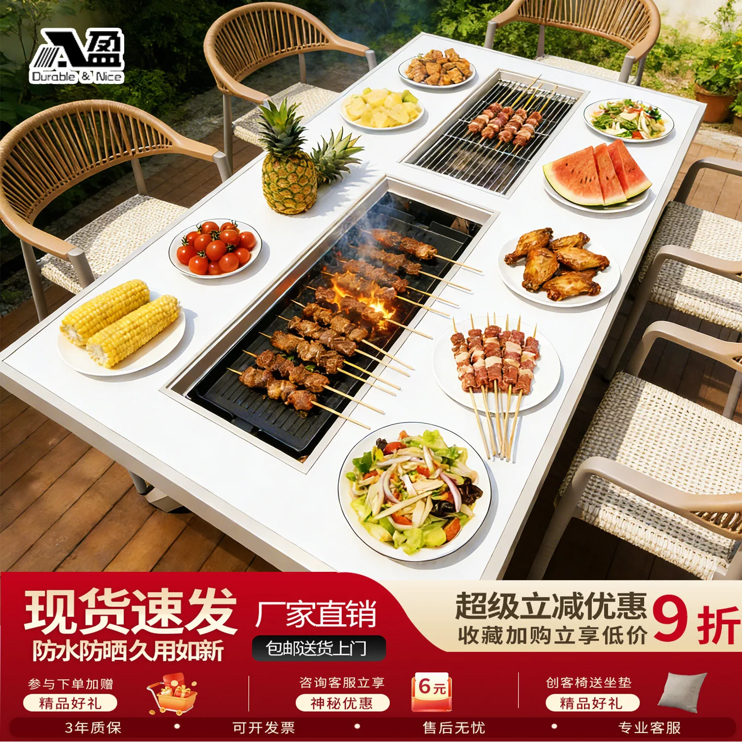 Комплект садовой мебели: 4 алюминиевых стула Danton, поднос, гриль-стол, 150x90 см