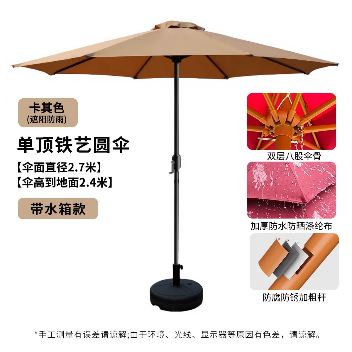 Солнцезащитный зонт Baying, 270 см, высота 240 см, одинарный верх, круглое основание, утолщенная ткань, хаки/черный
