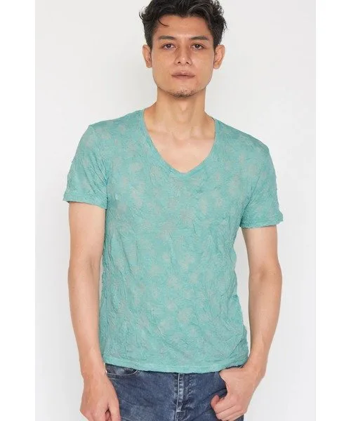 Топ с короткими рукавами, сшитый из жаккардовой ткани с растительным рисунком и жатой отделкой, дополненный фирменным V-образным вырезом бренда.