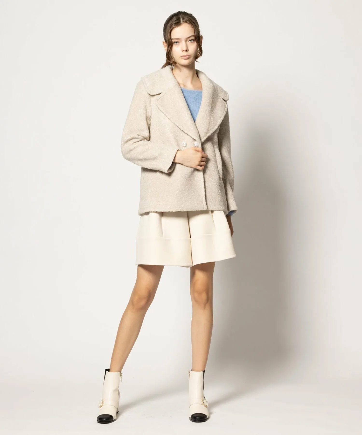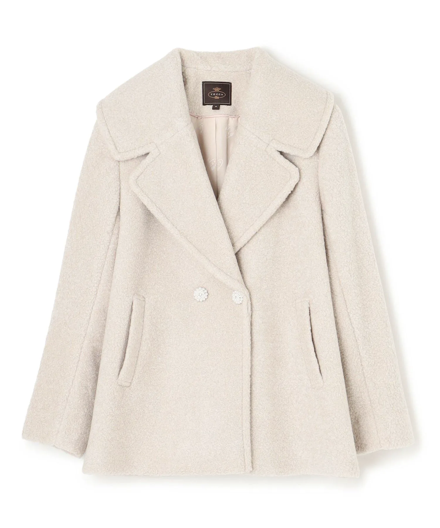 Модная, легкая ткань украшена фирменными жемчужными пуговицами TOCCA. Большой воротник добавляет гламура.