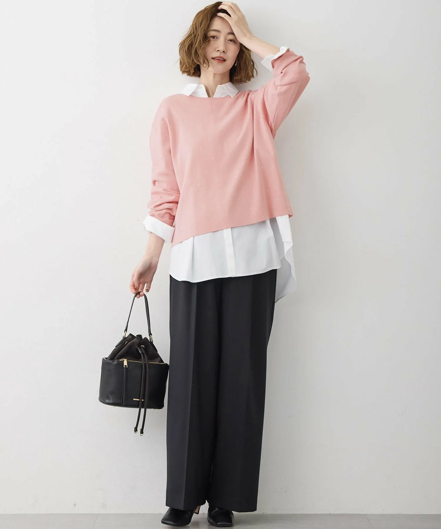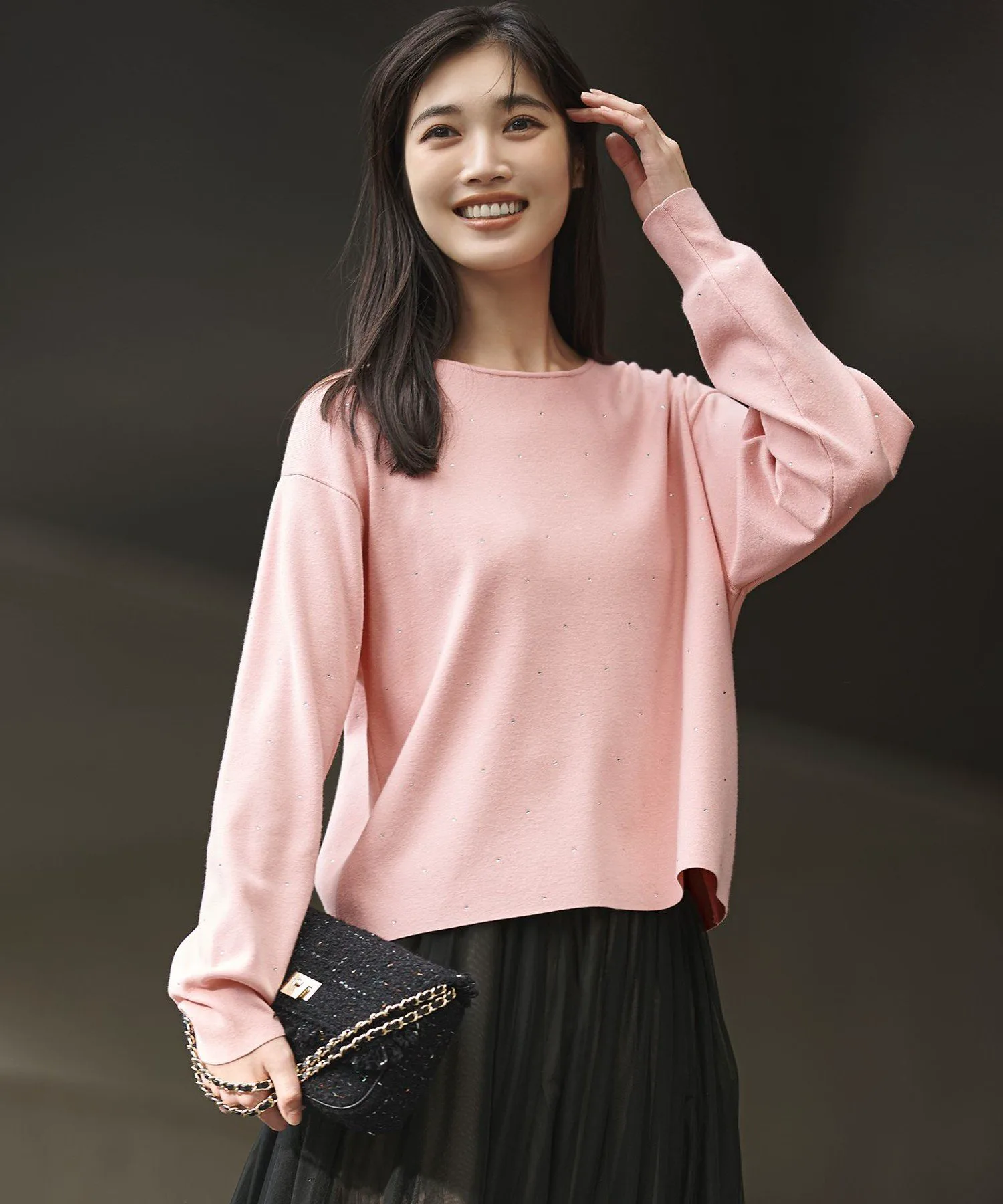 Этот вязаный пуловер имеет кристально-розовый фасон, расположенный спереди, что добавляет образу гламура. Умеренно свободный крой и плотная вязка обеспечивают комфортную посадку, не облегая тело. Длина оптимальна, поэтому его можно носить заправленным или навыпуск, что позволяет легко сочетать его с различными вариантами низа. Сочетайте его с простыми брюками или юбкой для изысканного и утонченного образа. Сверкающие кристаллы добавляют нотку гламура, делая его идеальным для праздничного сезона или особых осенних и зимних выходов. Доступен в четырех цветах: чистый и элегантный белый (#001), шикарный и утонченный черный (#005), мягкий и яркий розовый (#012) — доступен только онлайн и в избранных магазинах — и освежающий и утонченный синий (#070). Черный цвет (#005) особенно выделяется благодаря акцентам кремового цвета на воротнике и манжетах, добавляющим тонкий штрих.