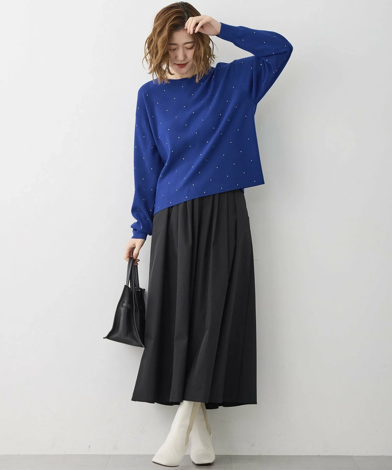 Этот вязаный пуловер имеет кристально-розовый фасон, расположенный спереди, что добавляет образу гламура. Умеренно свободный крой и плотная вязка обеспечивают комфортную посадку, не облегая тело. Длина оптимальна, поэтому его можно носить заправленным или навыпуск, что позволяет легко сочетать его с различными вариантами низа. Сочетайте его с простыми брюками или юбкой для изысканного и утонченного образа. Сверкающие кристаллы добавляют нотку гламура, делая его идеальным для праздничного сезона или особых осенних и зимних выходов. Доступен в четырех цветах: чистый и элегантный белый (#001), шикарный и утонченный черный (#005), мягкий и яркий розовый (#012) — доступен только онлайн и в избранных магазинах — и освежающий и утонченный синий (#070). Черный цвет (#005) особенно выделяется благодаря акцентам кремового цвета на воротнике и манжетах, добавляющим тонкий штрих.