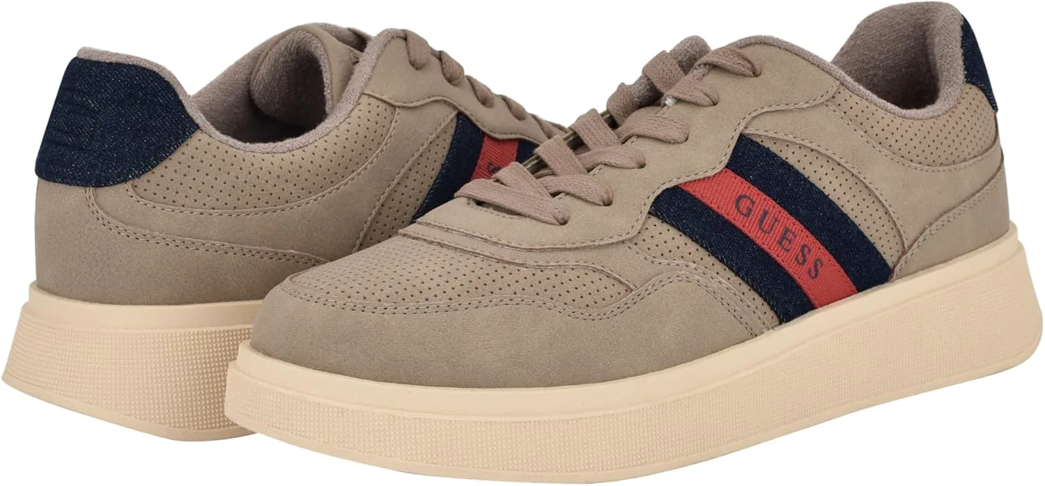Эти модные кроссовки GUESS демонстрируют современный стиль с приподнятой подошвой, полосатой боковой панелью и перфорированными деталями. Эти кроссовки можно носить как в повседневной, так и в более нарядной обстановке. Основанный в 1981 году, Guess - это глобальный бренд образа жизни и символ молодого, авантюрного стиля. Круглый носок; шнуровка; верх из искусственной кожи/текстиля