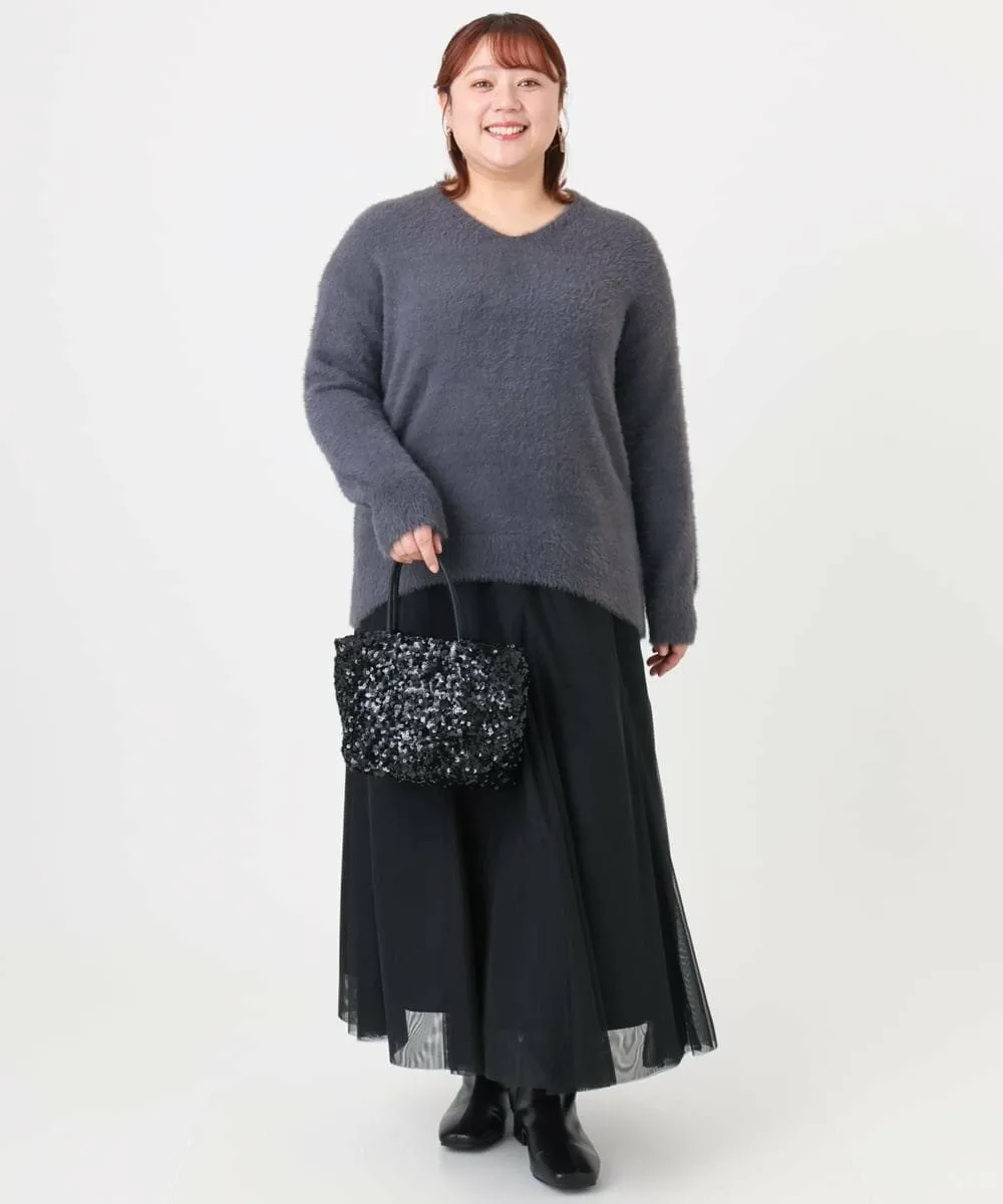 Аккуратный V-образный вырез и свободный крой со спущенными плечами.