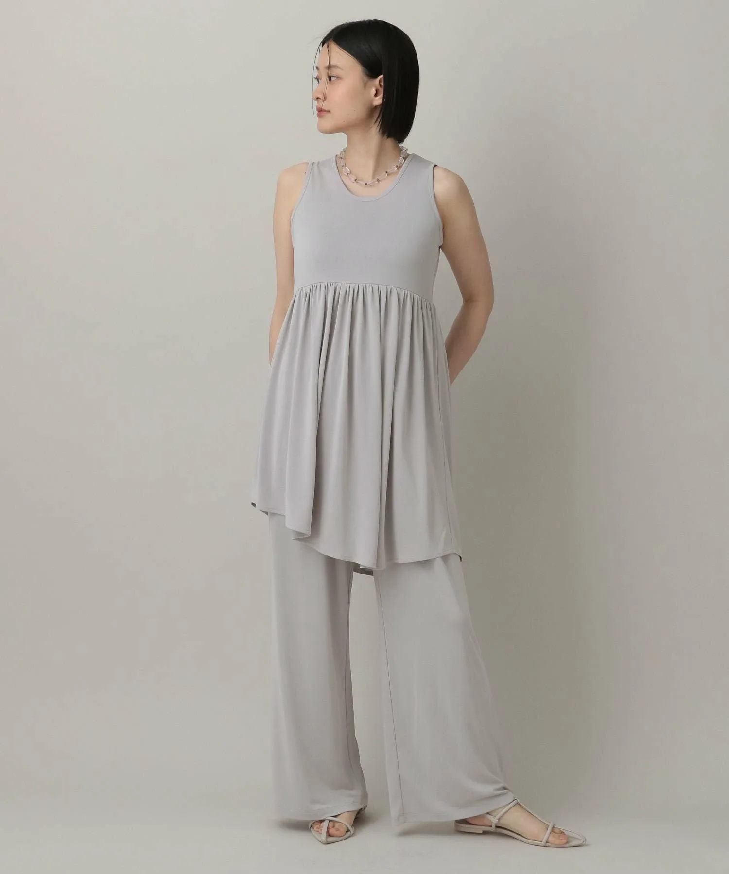 Комплект состоит из туники с асимметричным подолом и брюк свободного кроя с полурасклешенным силуэтом.