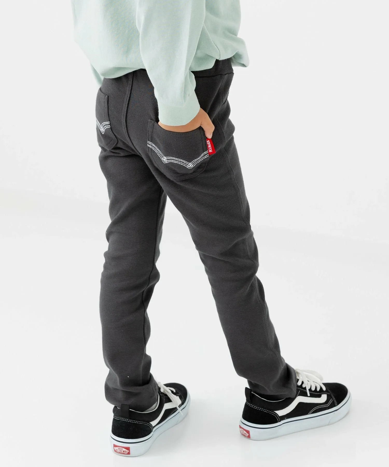 Продано более 150 000 единиц! Эти эластичные штаны идеально подходят для активных детей, позволяя им свободно двигаться! Популярные эластичные штаны Edwin представлены в широком ассортименте цветов! Прошивка карманов добавляет стильный штрих!