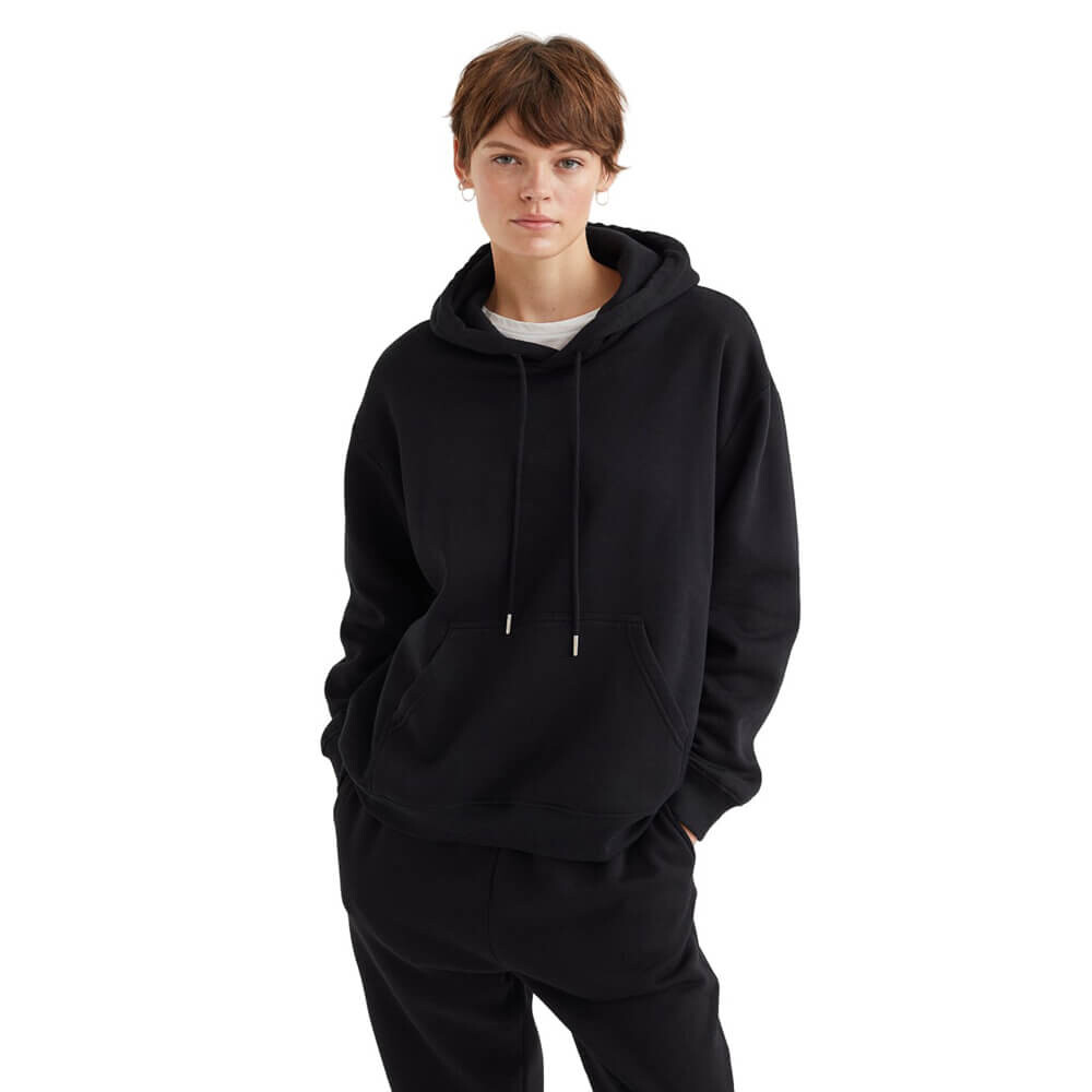 Толстовка широкого кроя с капюшоном на подкладке и кулиске, карманом-кенгуру и трикотажной резинкой на манжетах и по низу.