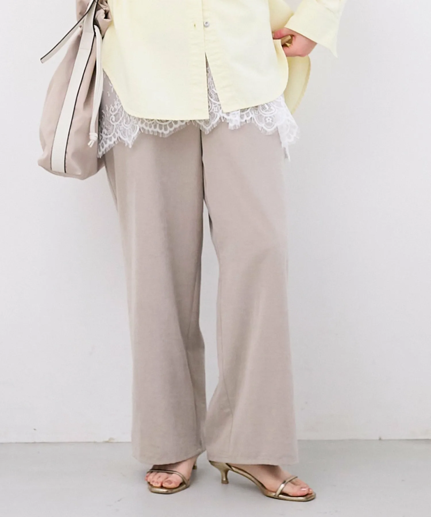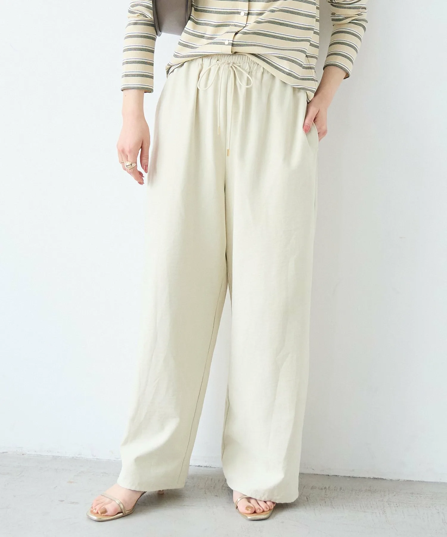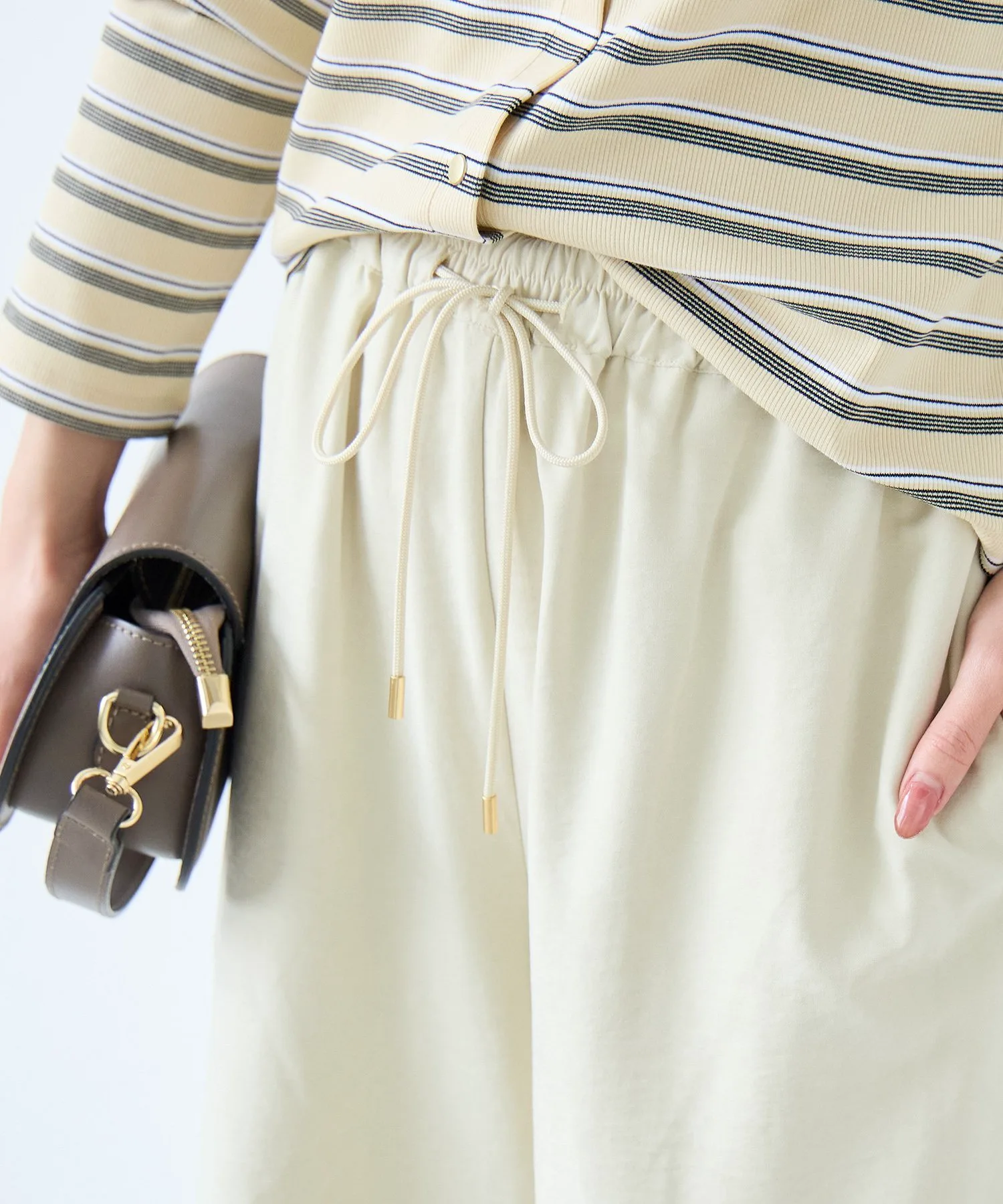 Эти удобные брюки изготовлены из слегка ворсистой ткани, имитирующей персиковую кожу, которая приятна на ощупь. Мягкая текстура создает элегантное впечатление, и эти брюки можно носить как в расслабленном, так и в элегантном стиле. Это универсальная вещь, идеально подходящая для перехода между сезонами и легко вписывающаяся в ваш гардероб. ◎