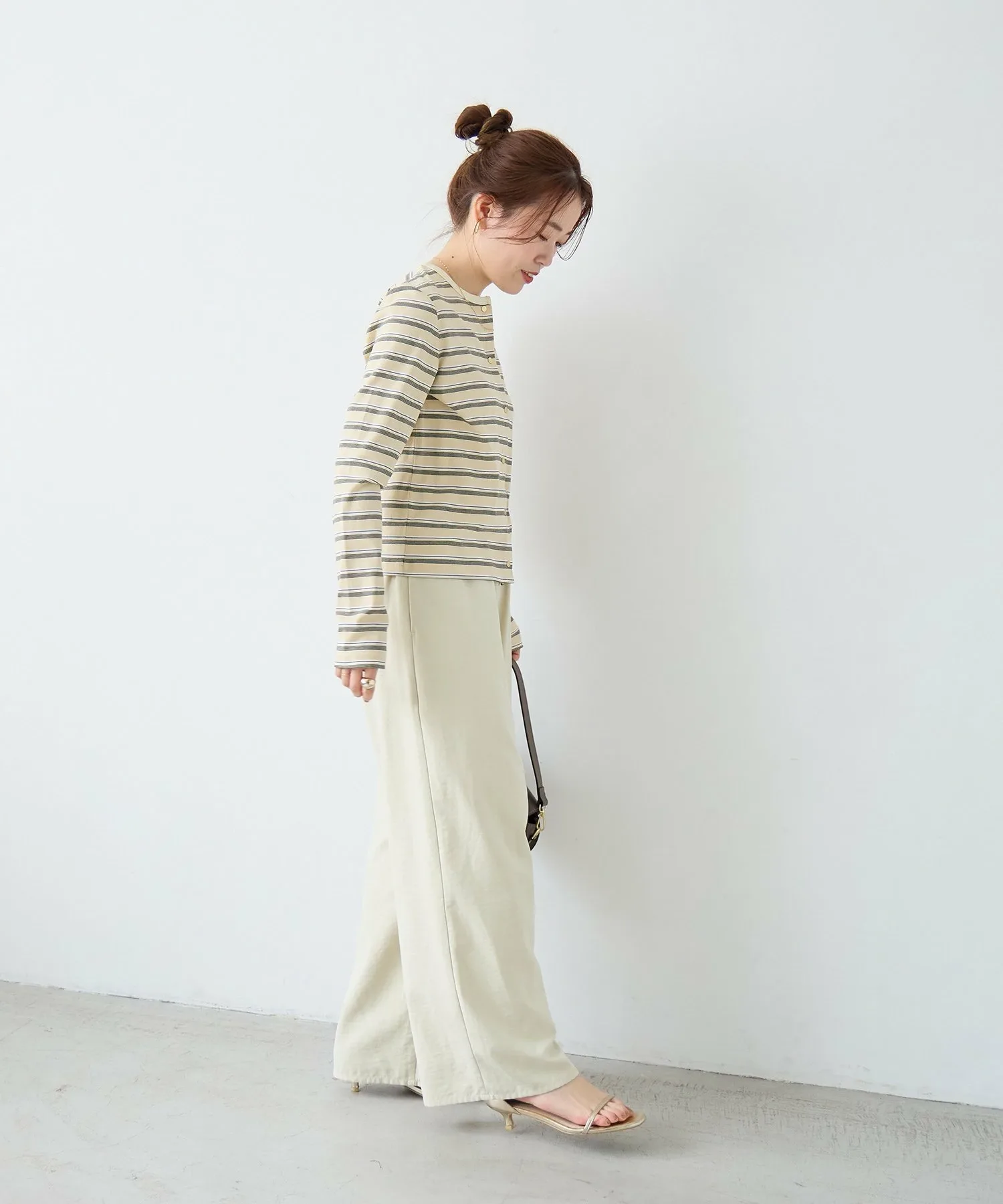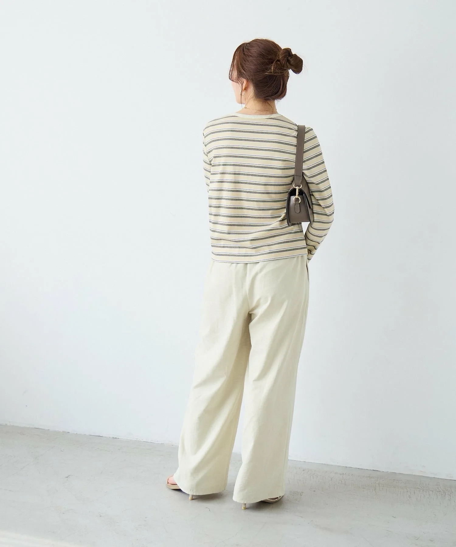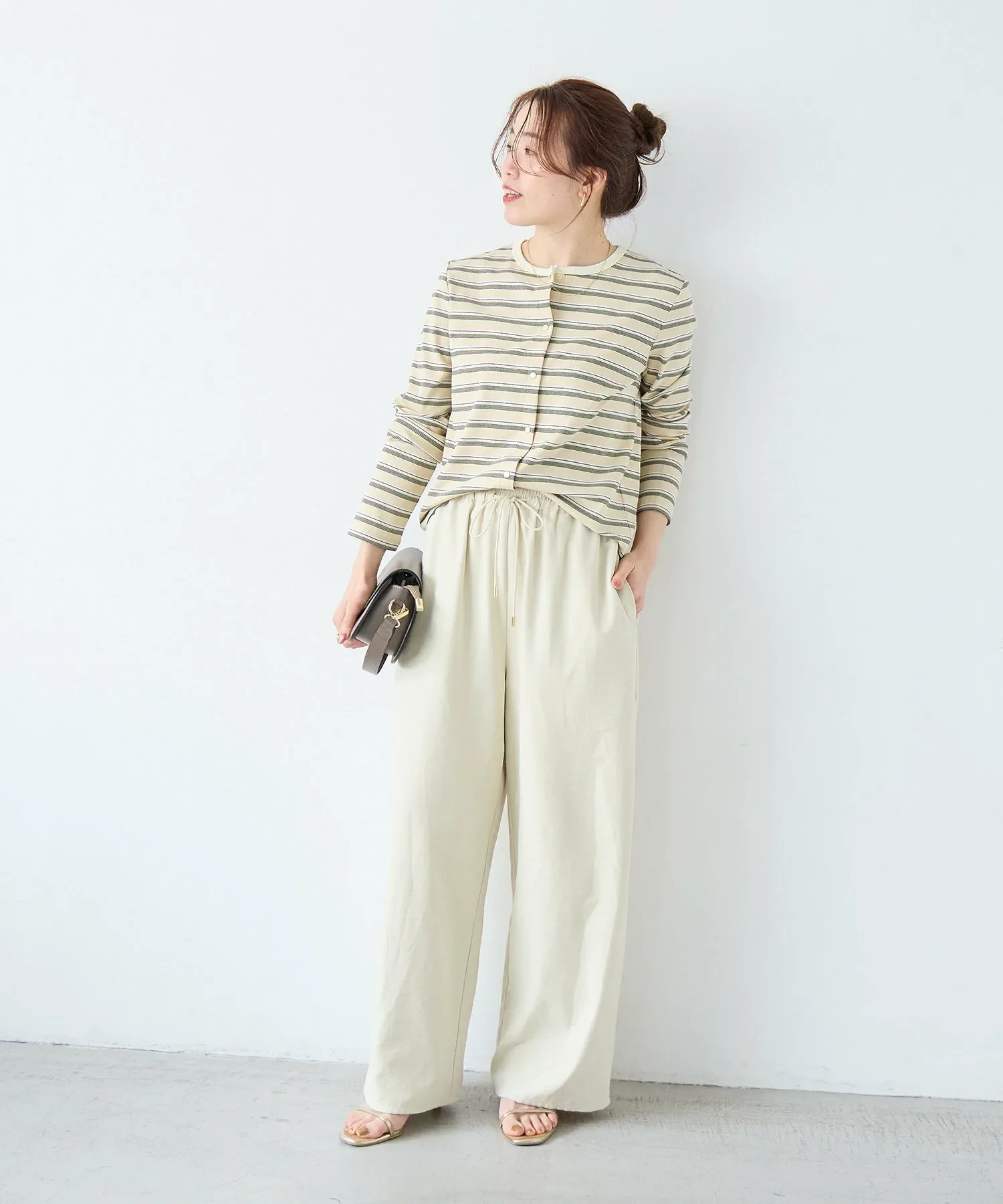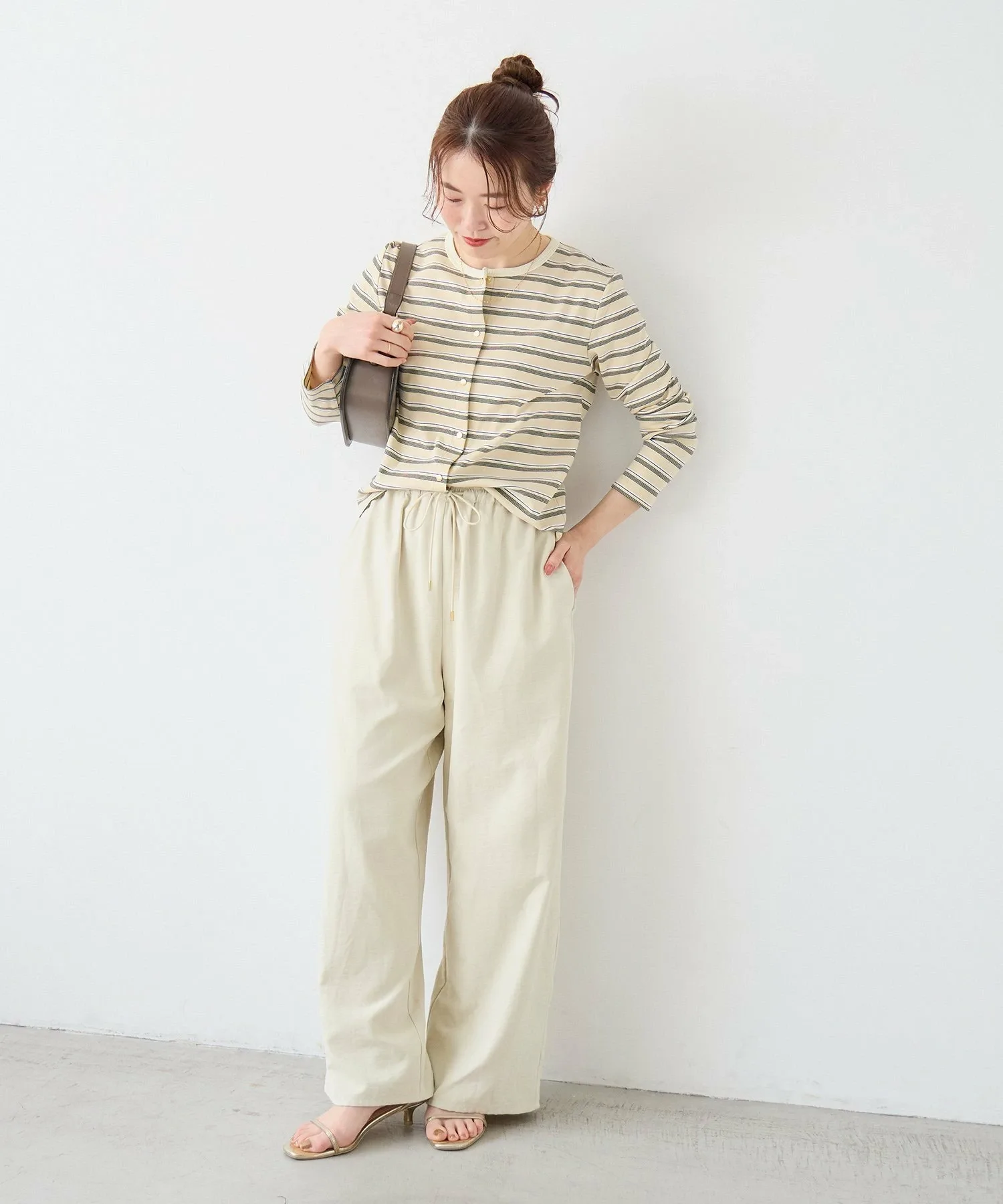 Эти удобные брюки изготовлены из слегка ворсистой ткани, имитирующей персиковую кожу, которая приятна на ощупь. Мягкая текстура создает элегантное впечатление, и эти брюки можно носить как в расслабленном, так и в элегантном стиле. Это универсальная вещь, идеально подходящая для перехода между сезонами и легко вписывающаяся в ваш гардероб. ◎