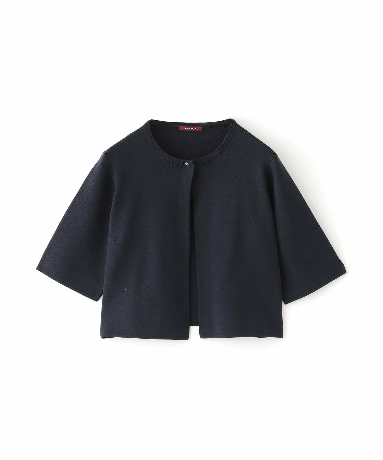 Болеро, напоминающее жакет, изготовлено из эластичной ткани. Имеет слегка расклешенный силуэт и рукава 5/4. Спереди расположены вытачки на груди, выполненные методом флешажного вязания, создающие трехмерный узор, несмотря на то, что это вязаный материал.