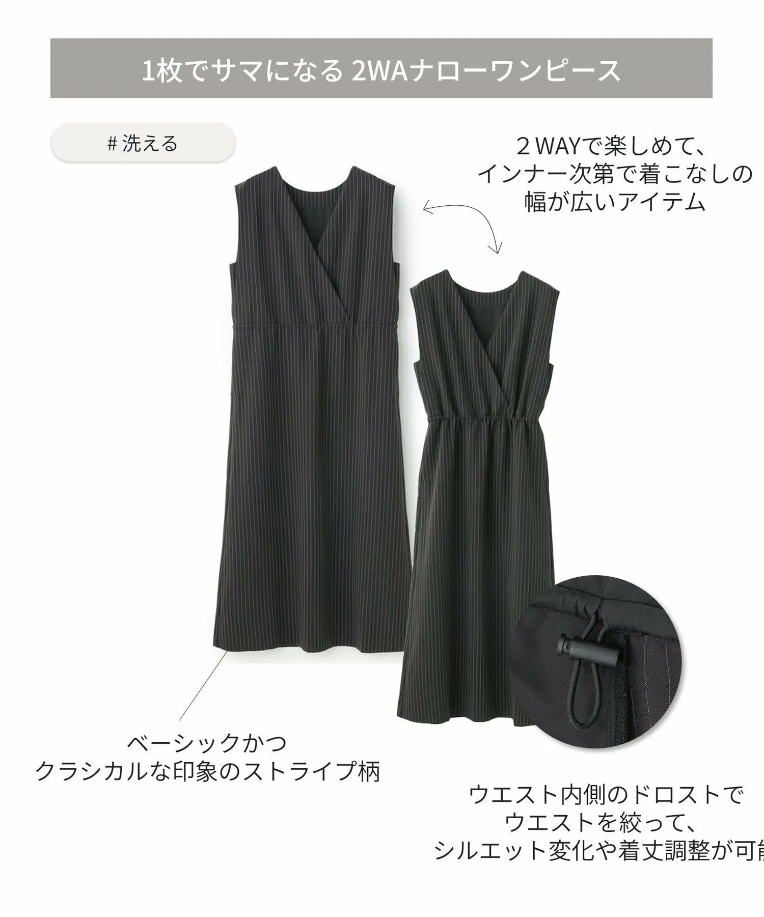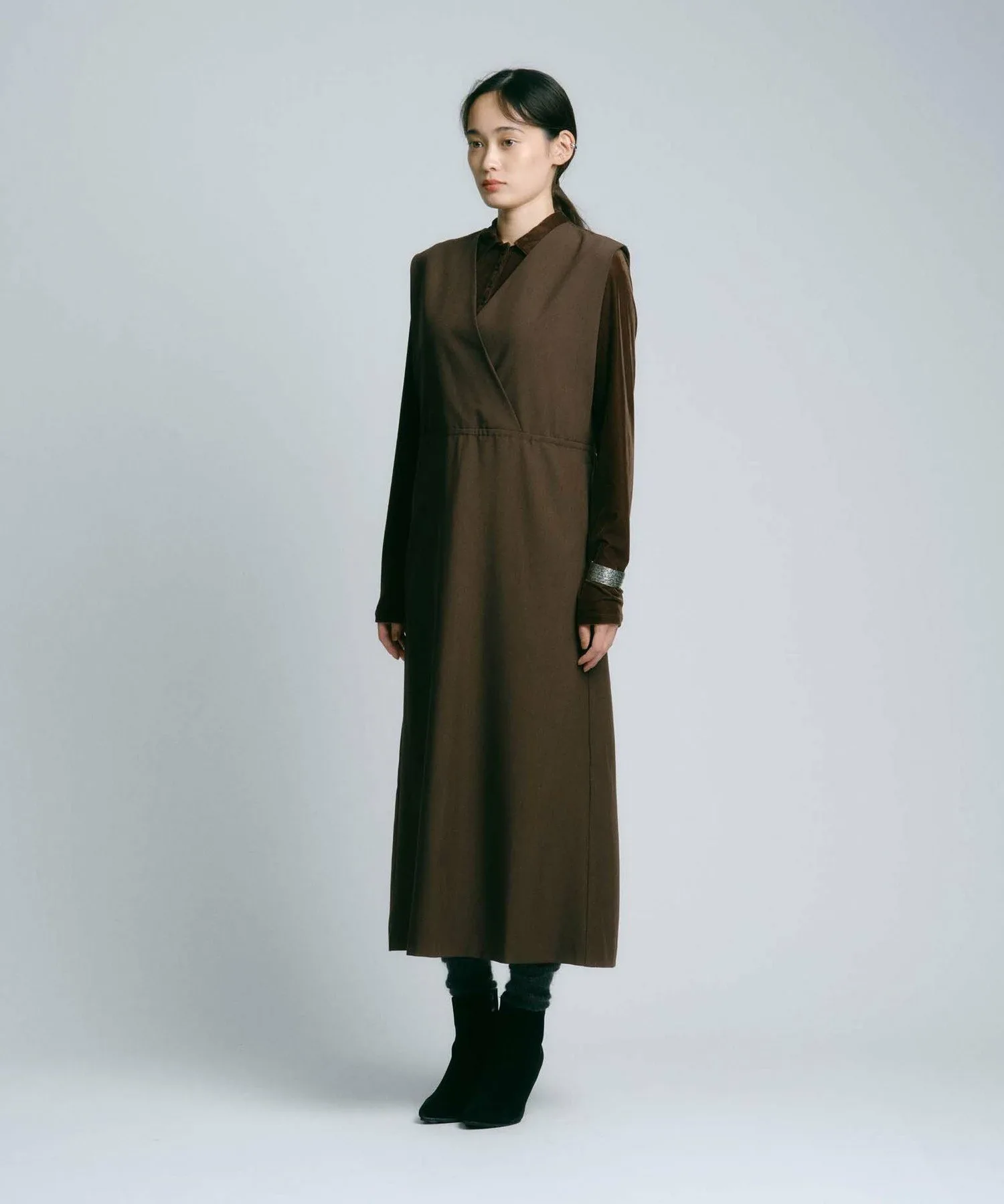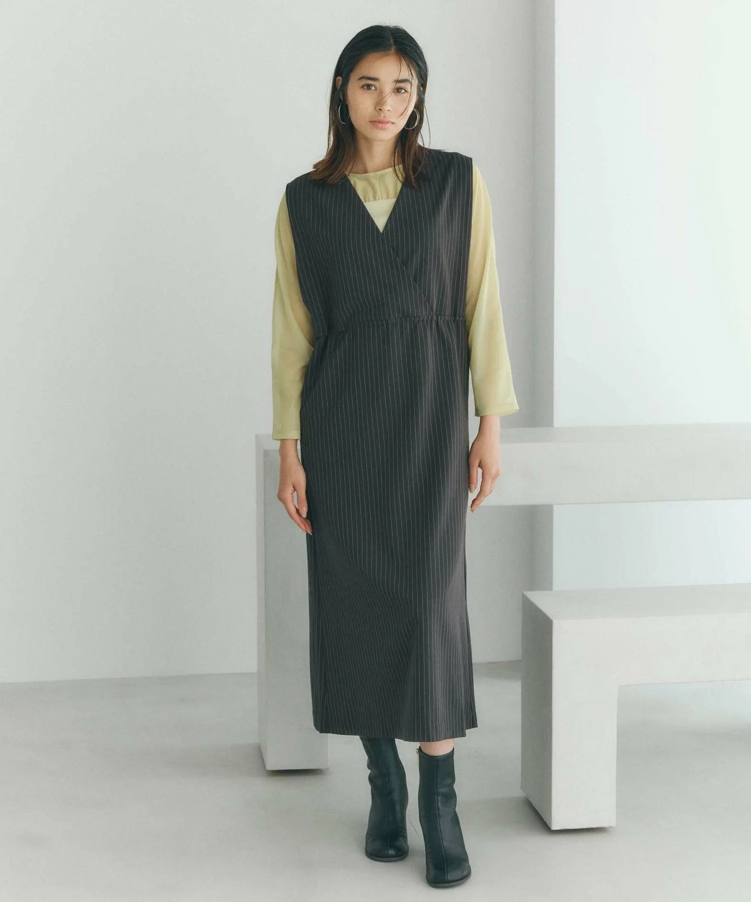 Это узкое платье выполнено в аккуратном полосатом дизайне и однотонном темно-коричневом цвете, каждый из которых придает элегантный вид. Его можно носить как спереди, так и сзади, что позволяет создавать образ с запахом или с круглым вырезом в зависимости от настроения и случая. Силуэт I-образной формы обеспечивает необходимую поддержку, не стесняя движений, что делает его универсальным вариантом как для формальной, так и для повседневной носки. Внутренняя завязка на поясе позволяет регулировать длину, поправляя талию. Подкладка только на верхней части изделия, что делает его непрозрачным и удобным для надевания и снимания, независимо от типа нижнего белья.