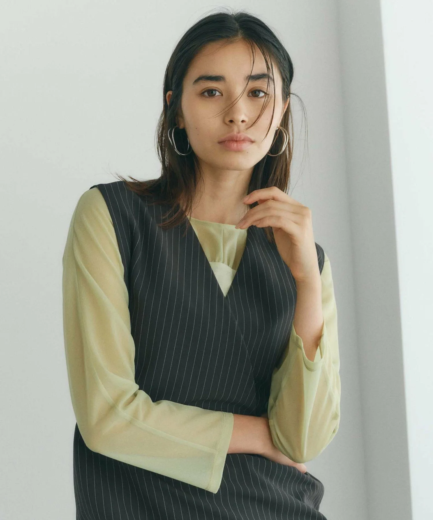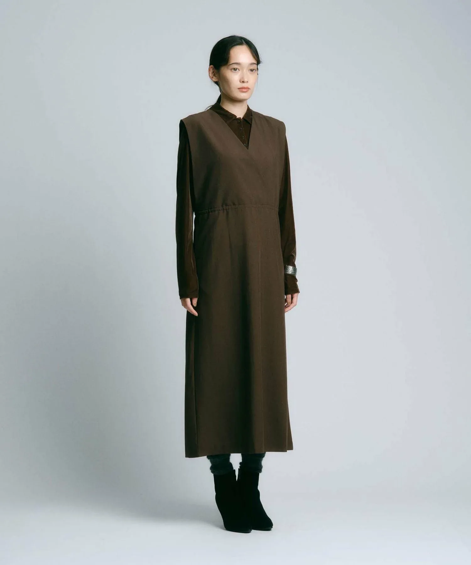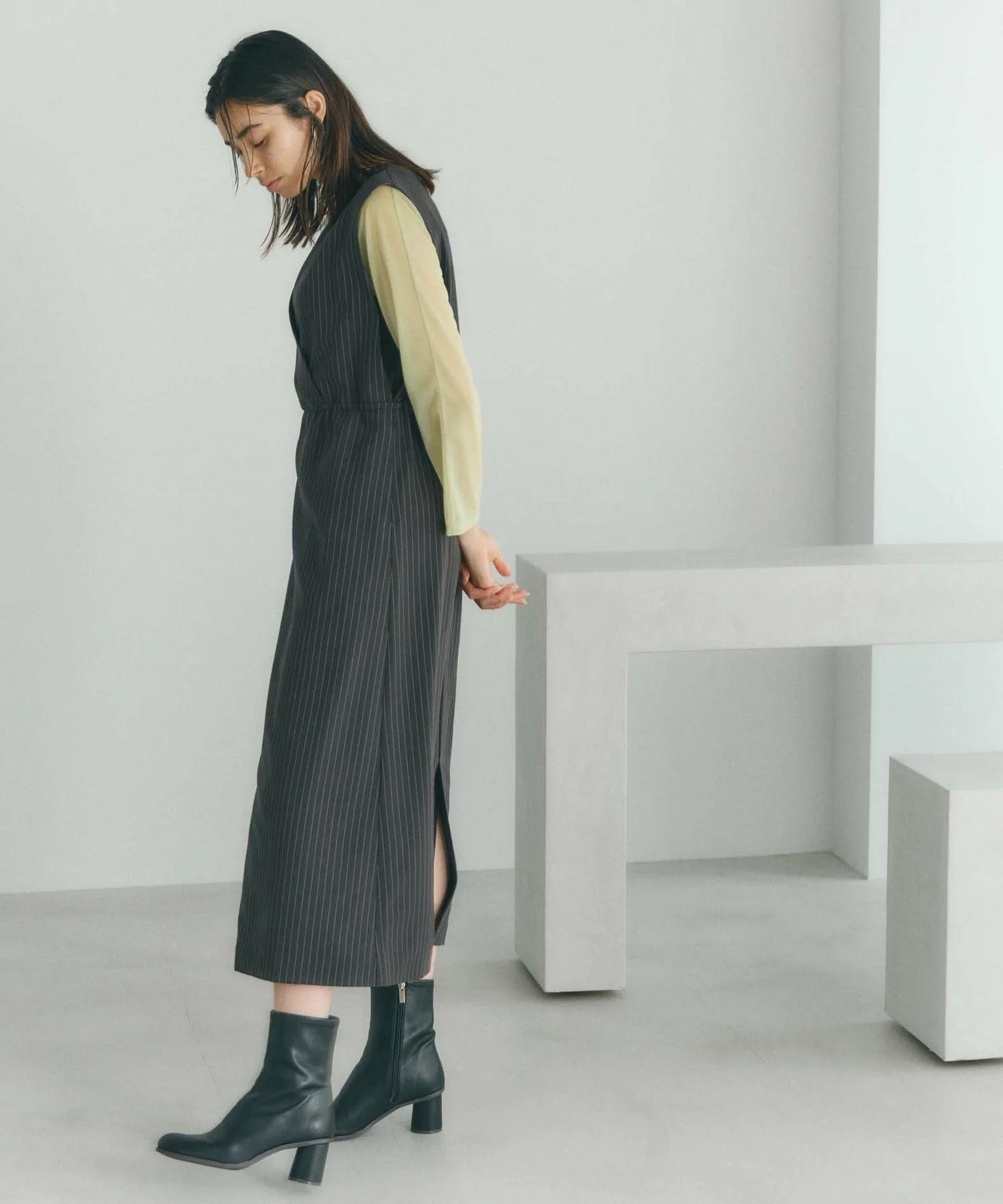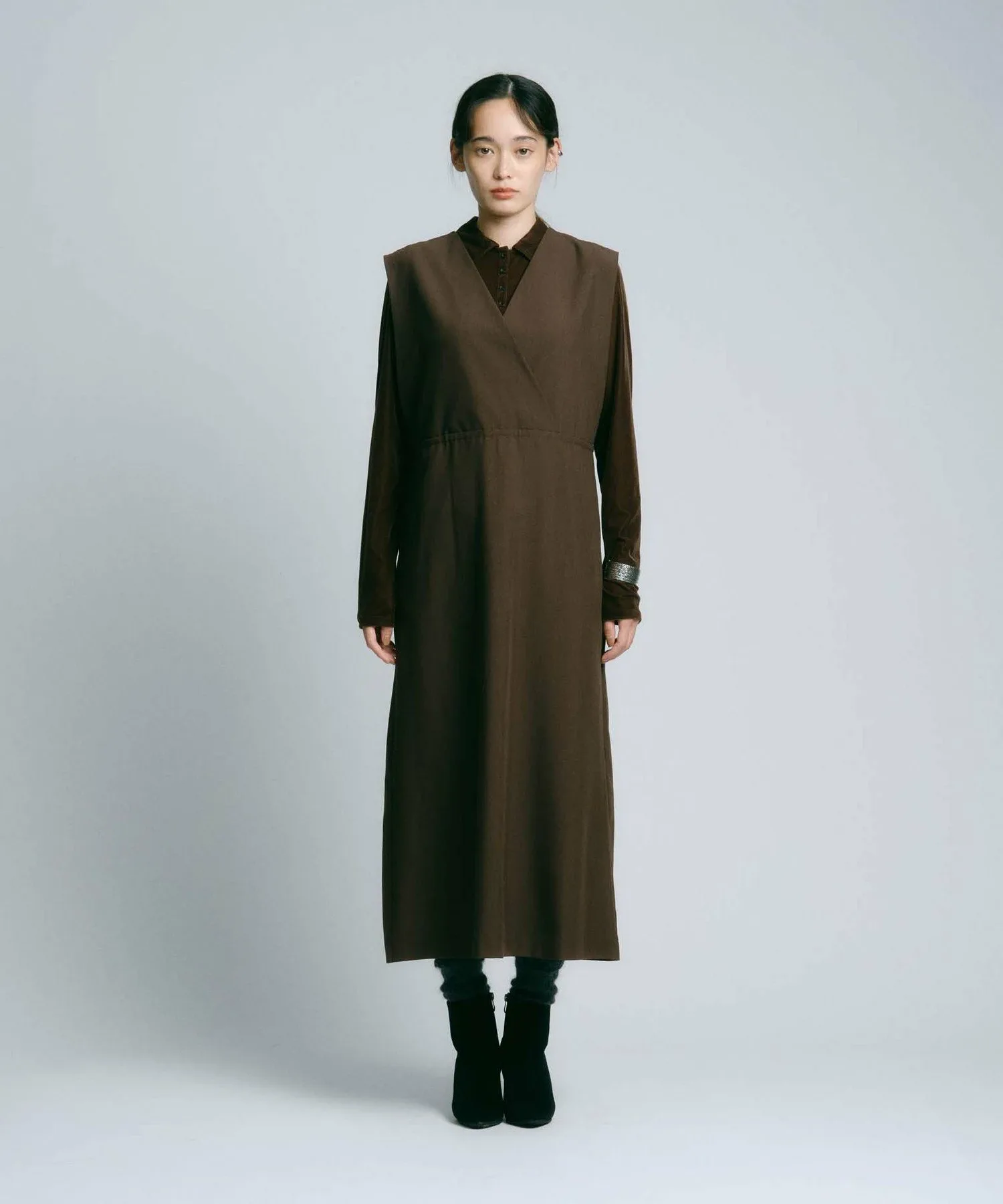 Это узкое платье выполнено в аккуратном полосатом дизайне и однотонном темно-коричневом цвете, каждый из которых придает элегантный вид. Его можно носить как спереди, так и сзади, что позволяет создавать образ с запахом или с круглым вырезом в зависимости от настроения и случая. Силуэт I-образной формы обеспечивает необходимую поддержку, не стесняя движений, что делает его универсальным вариантом как для формальной, так и для повседневной носки. Внутренняя завязка на поясе позволяет регулировать длину, поправляя талию. Подкладка только на верхней части изделия, что делает его непрозрачным и удобным для надевания и снимания, независимо от типа нижнего белья.