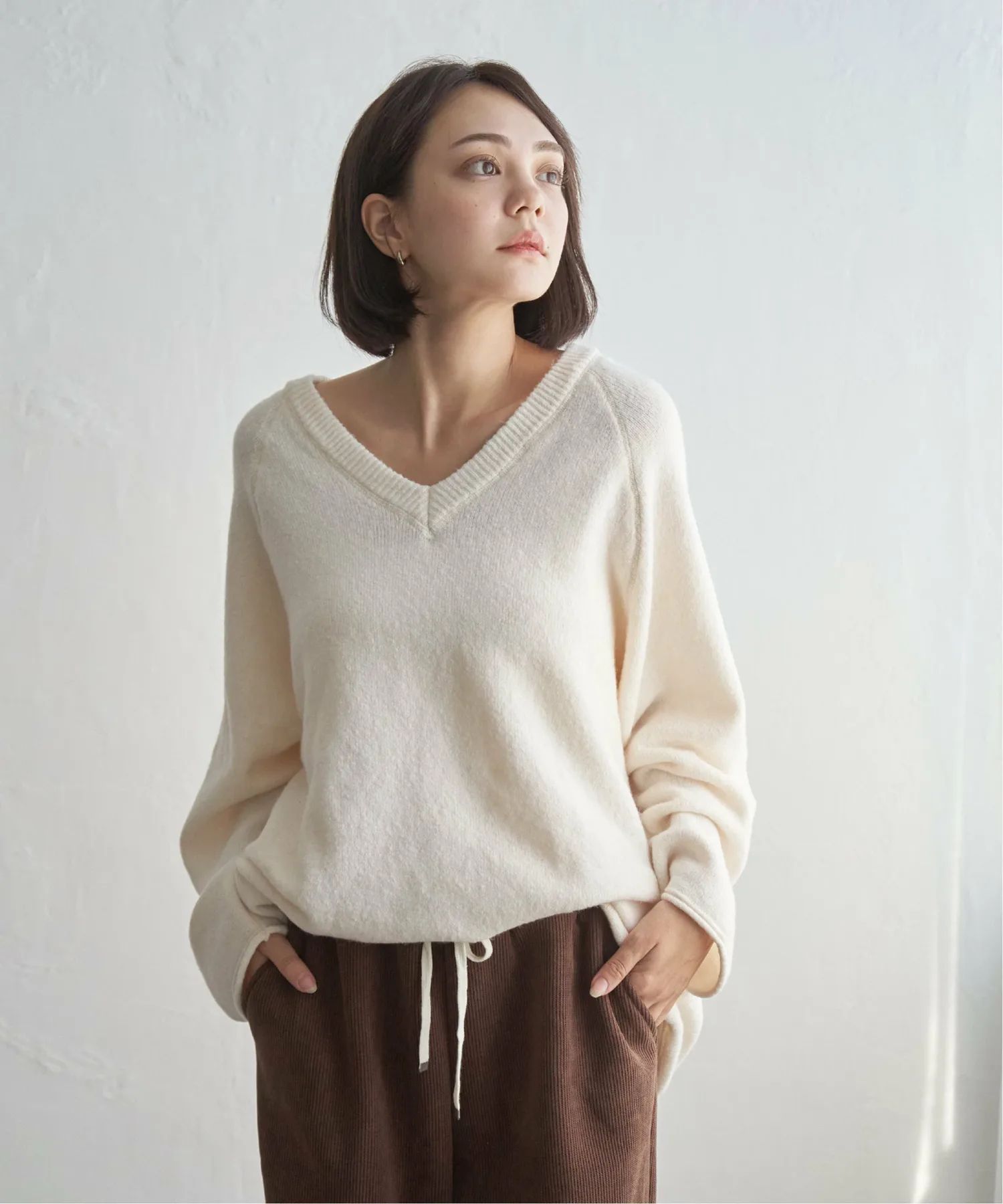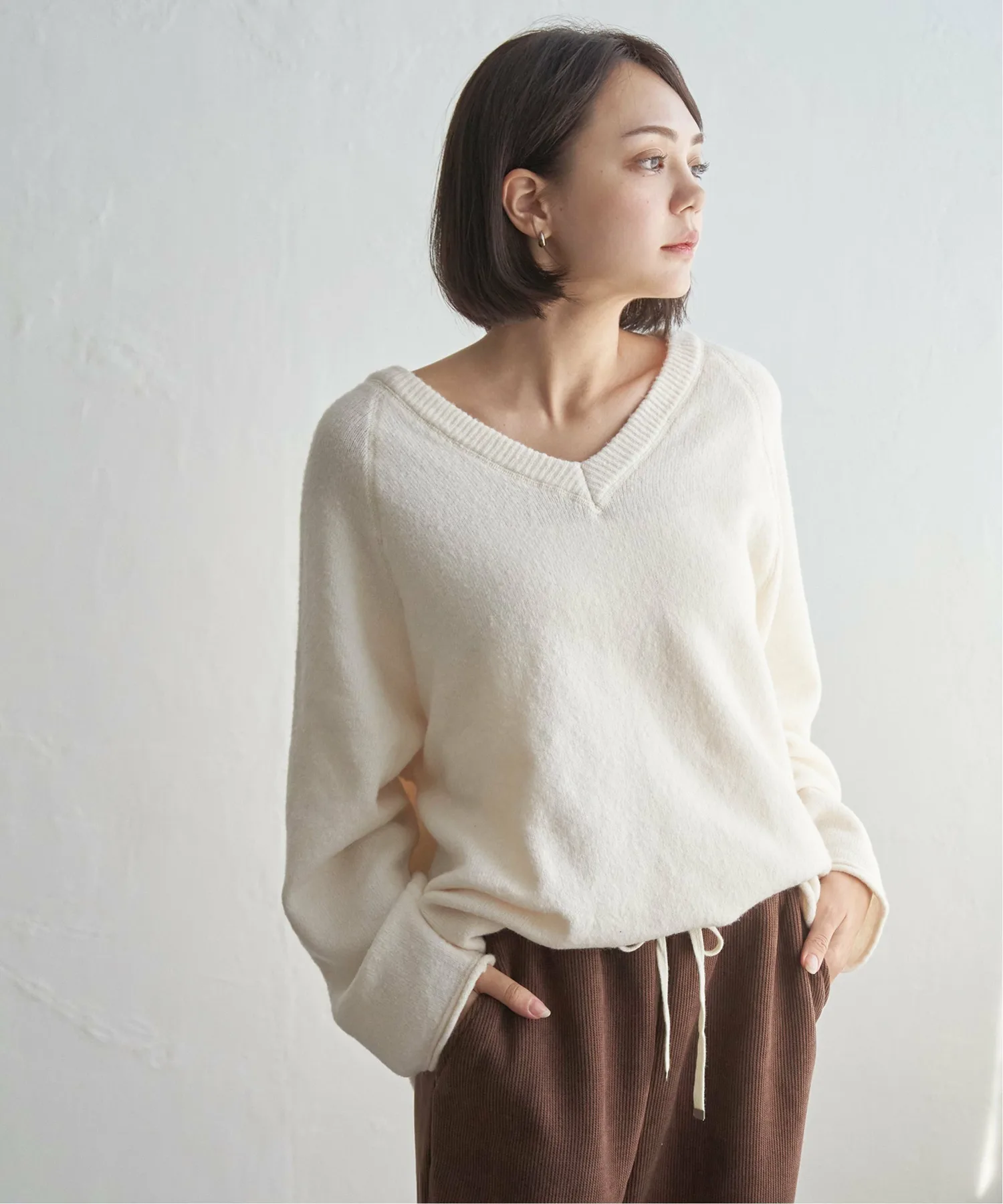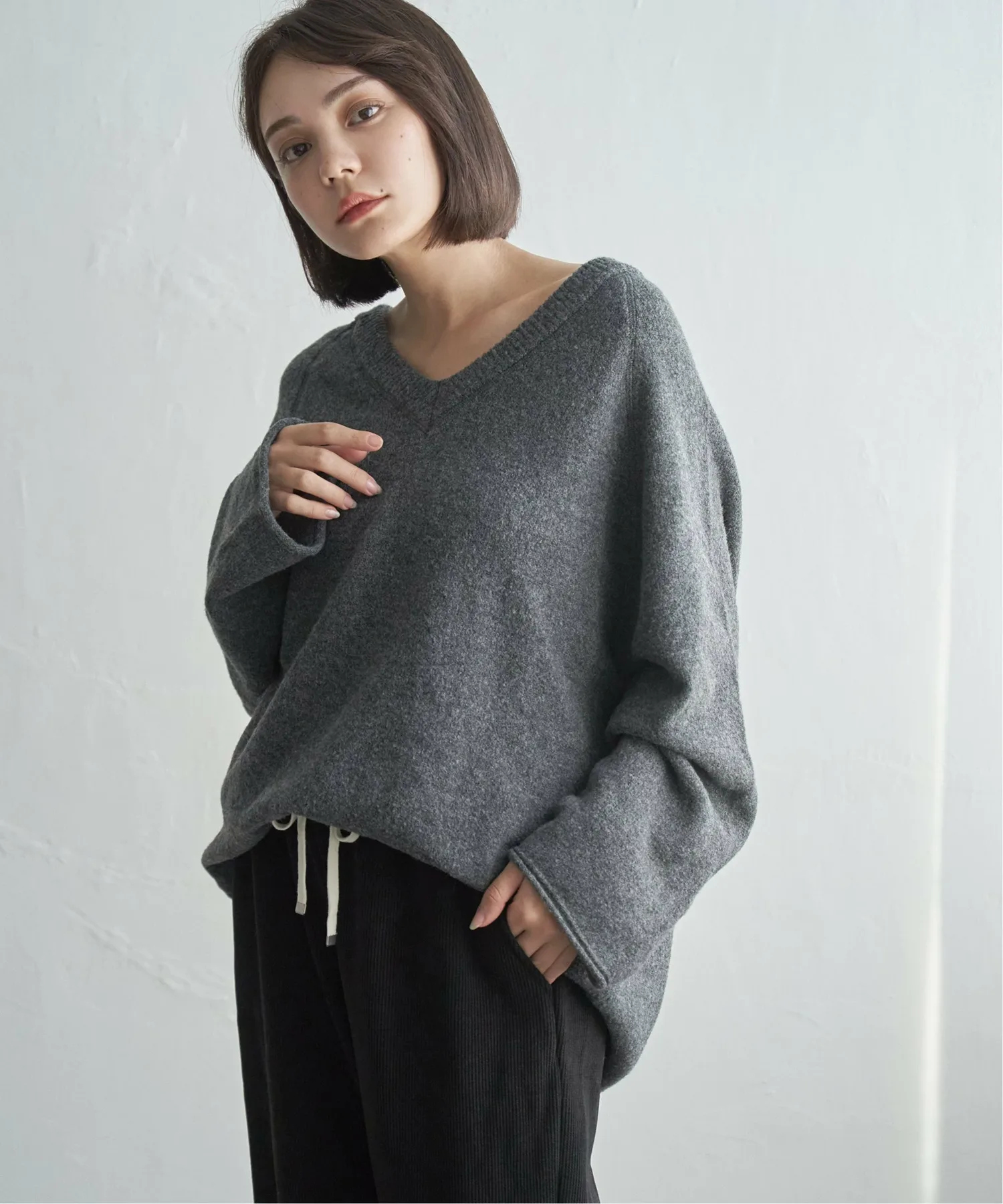 Простой вязаный пуловер с удлиненным низом и широким V-образным вырезом.