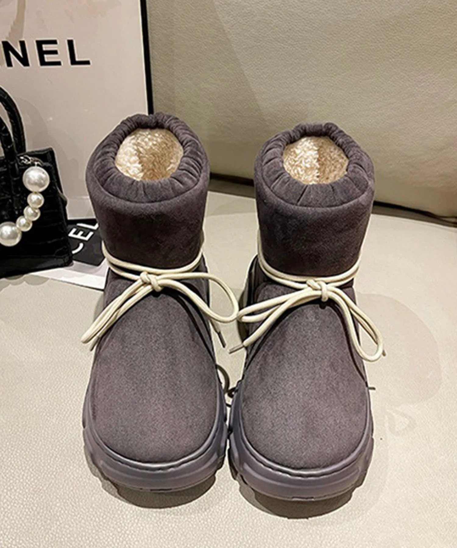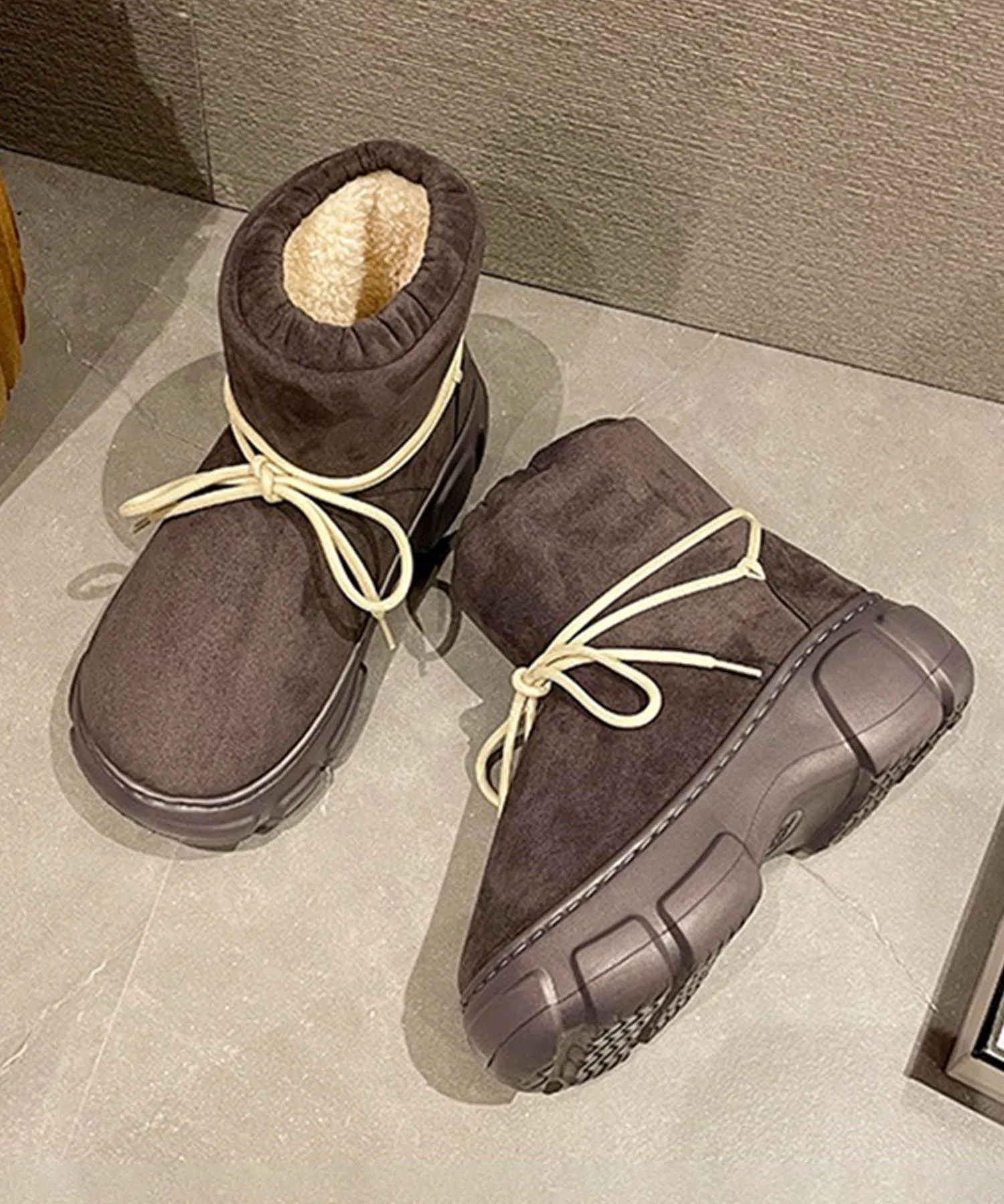 Эти сапоги на толстой подошве, выполненные в стиле овчины, имеют милую, округлую и пухлую форму.