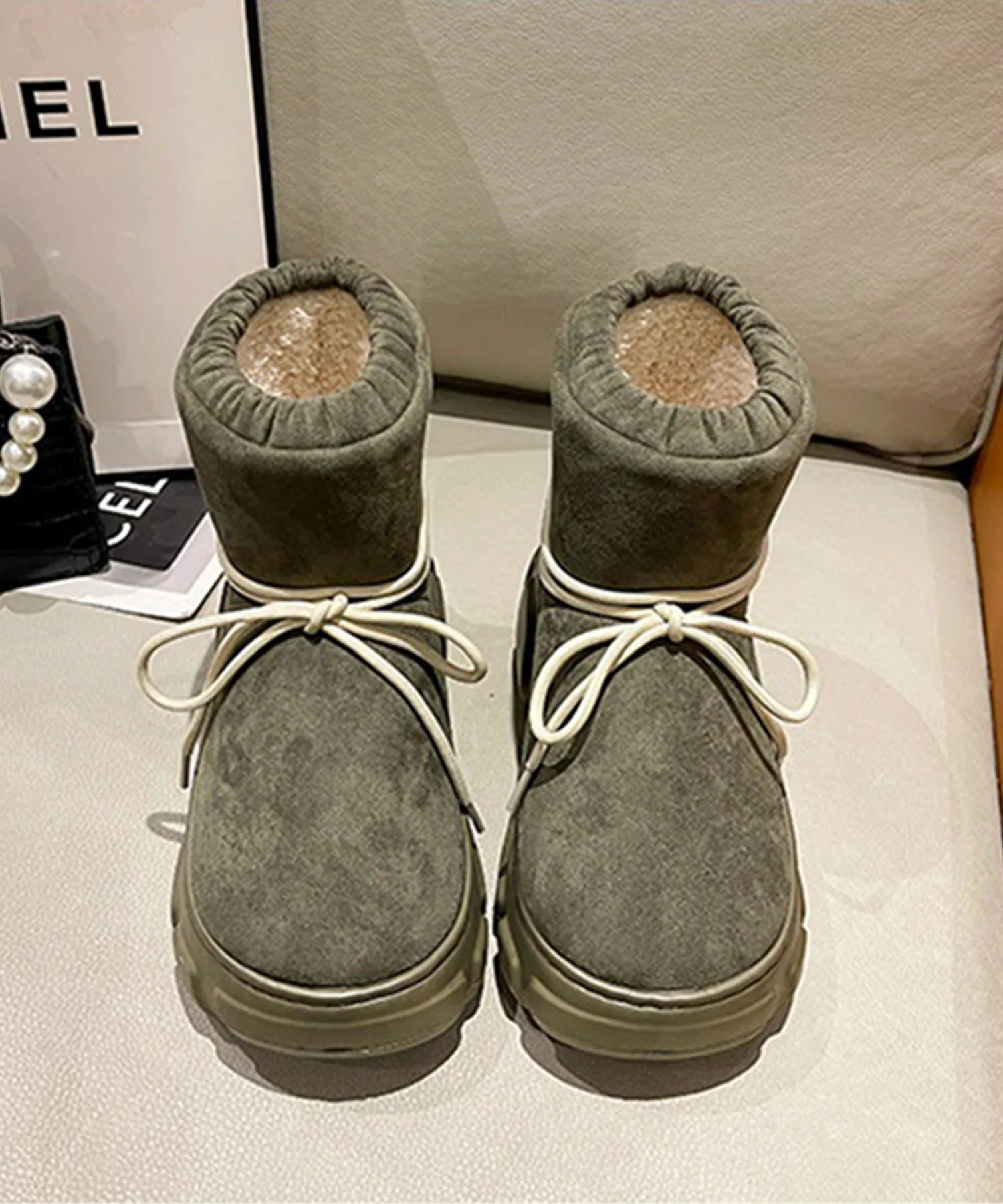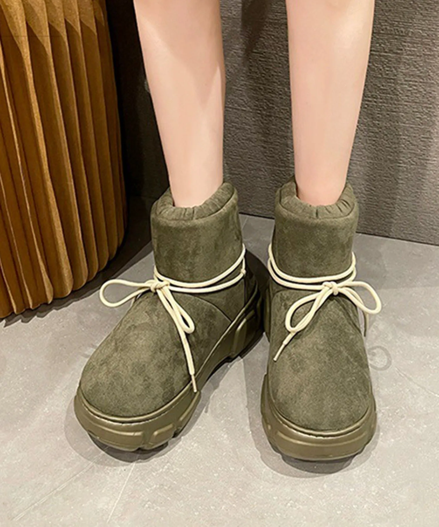 Эти сапоги на толстой подошве, выполненные в стиле овчины, имеют милую, округлую и пухлую форму.