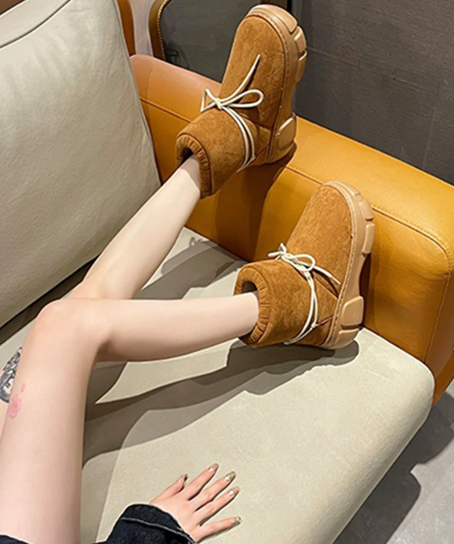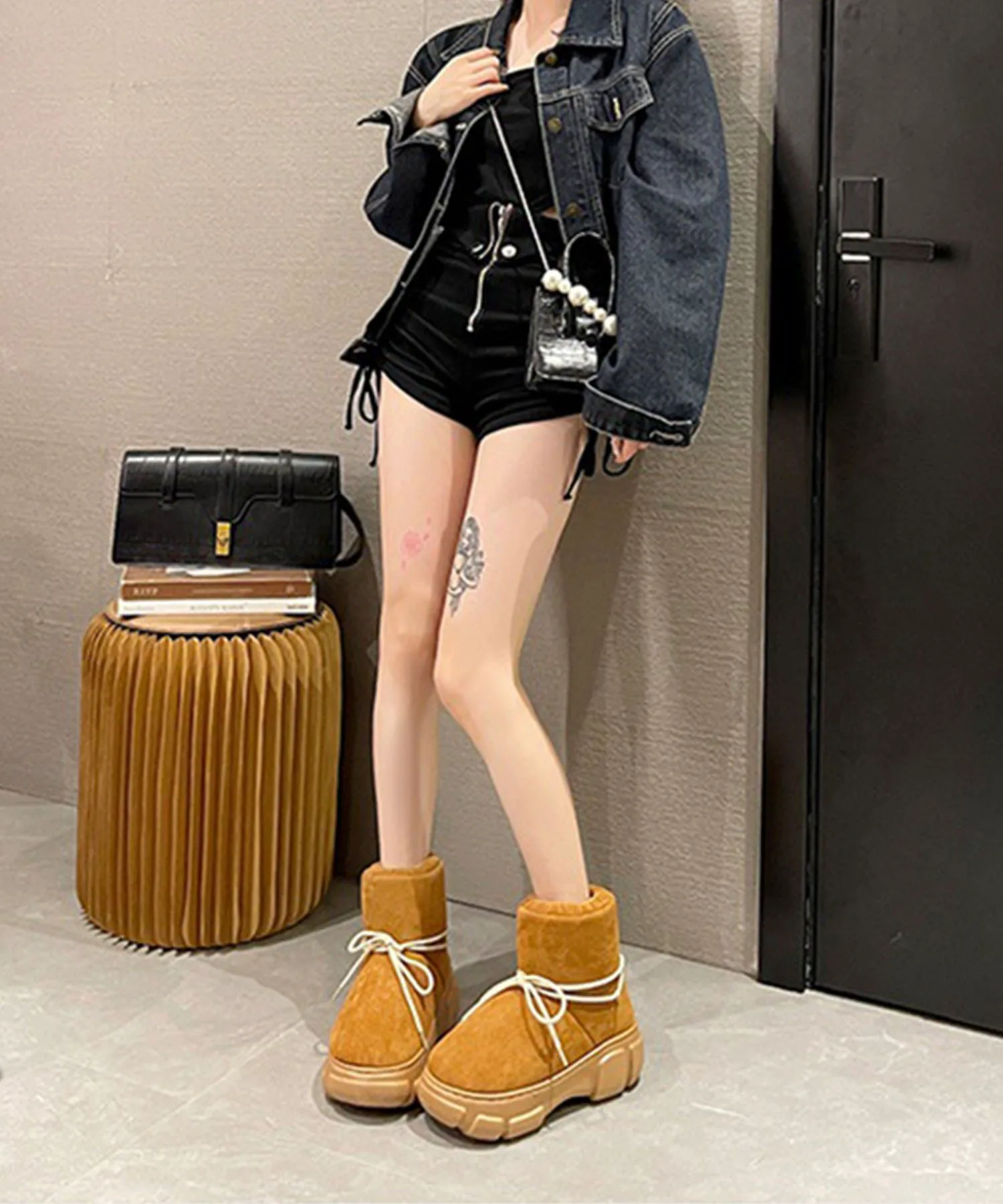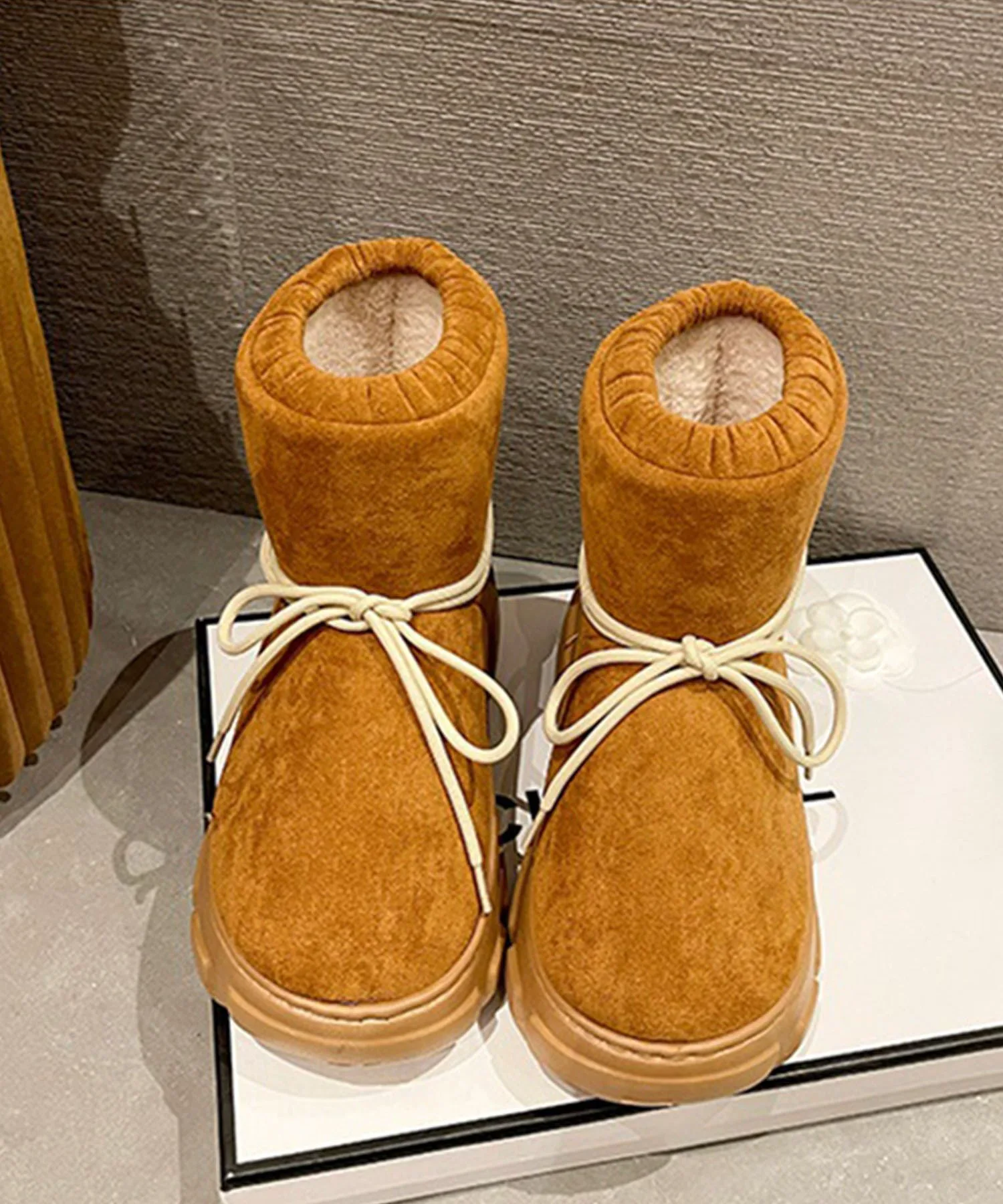 Эти сапоги на толстой подошве, выполненные в стиле овчины, имеют милую, округлую и пухлую форму.
