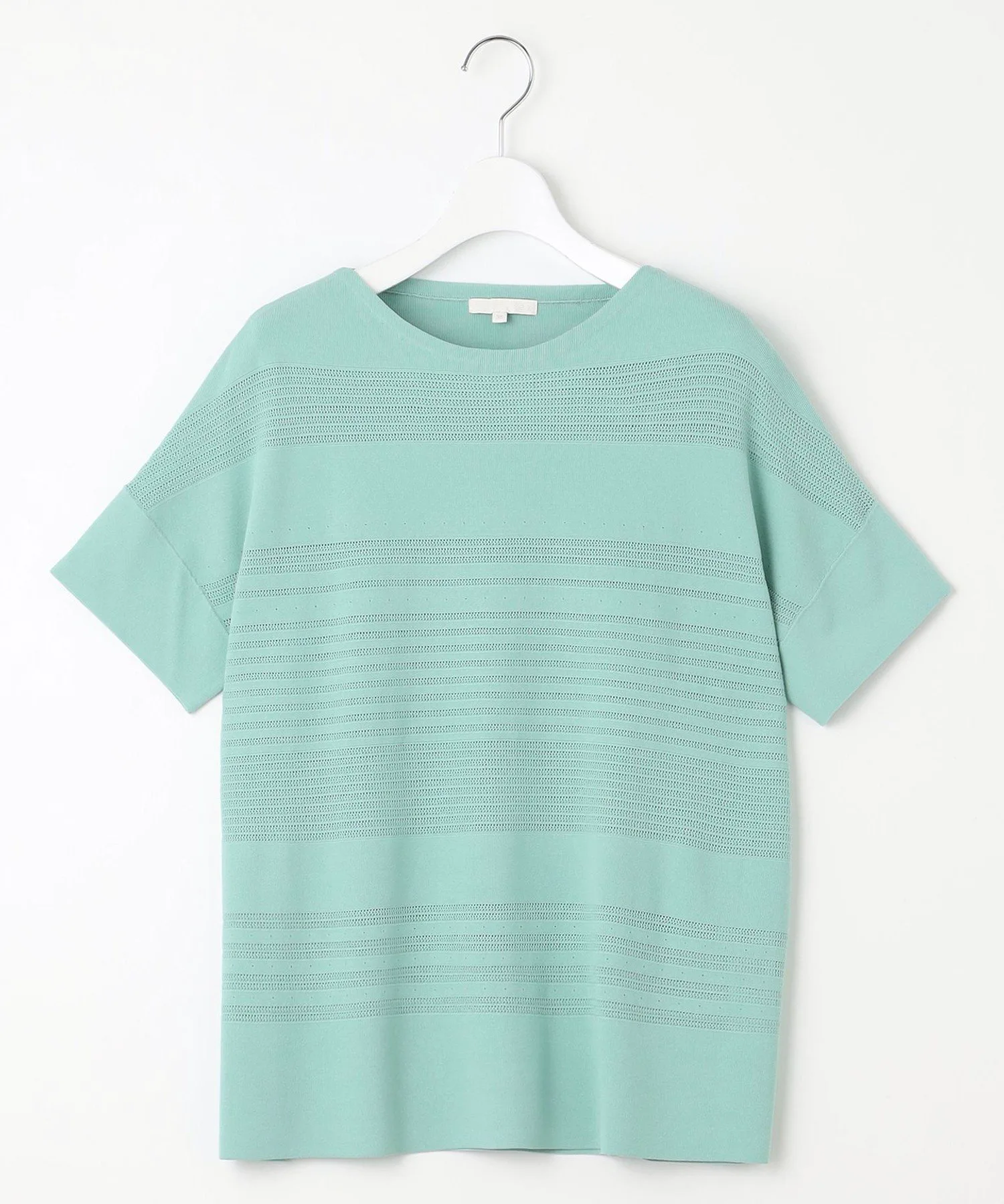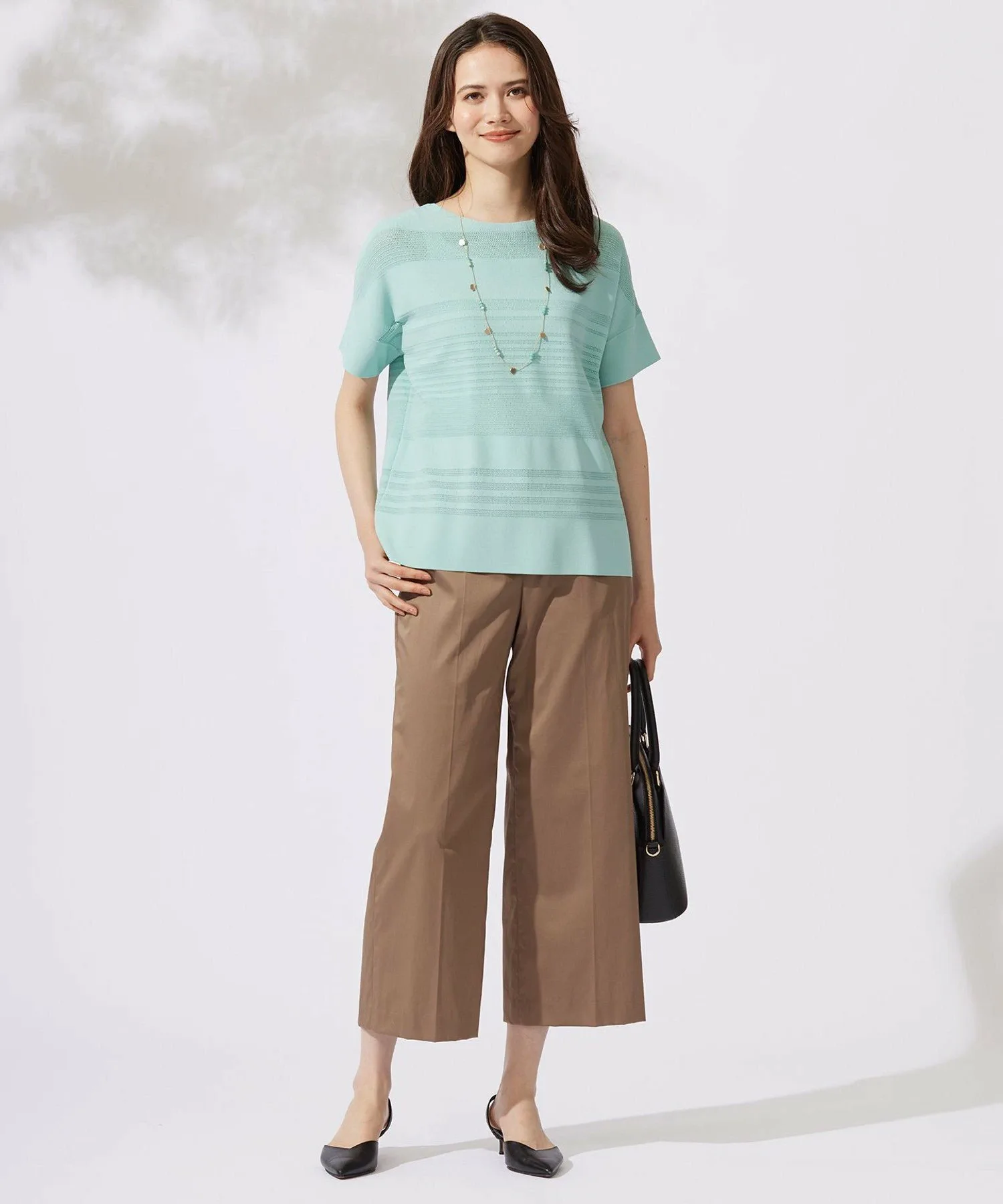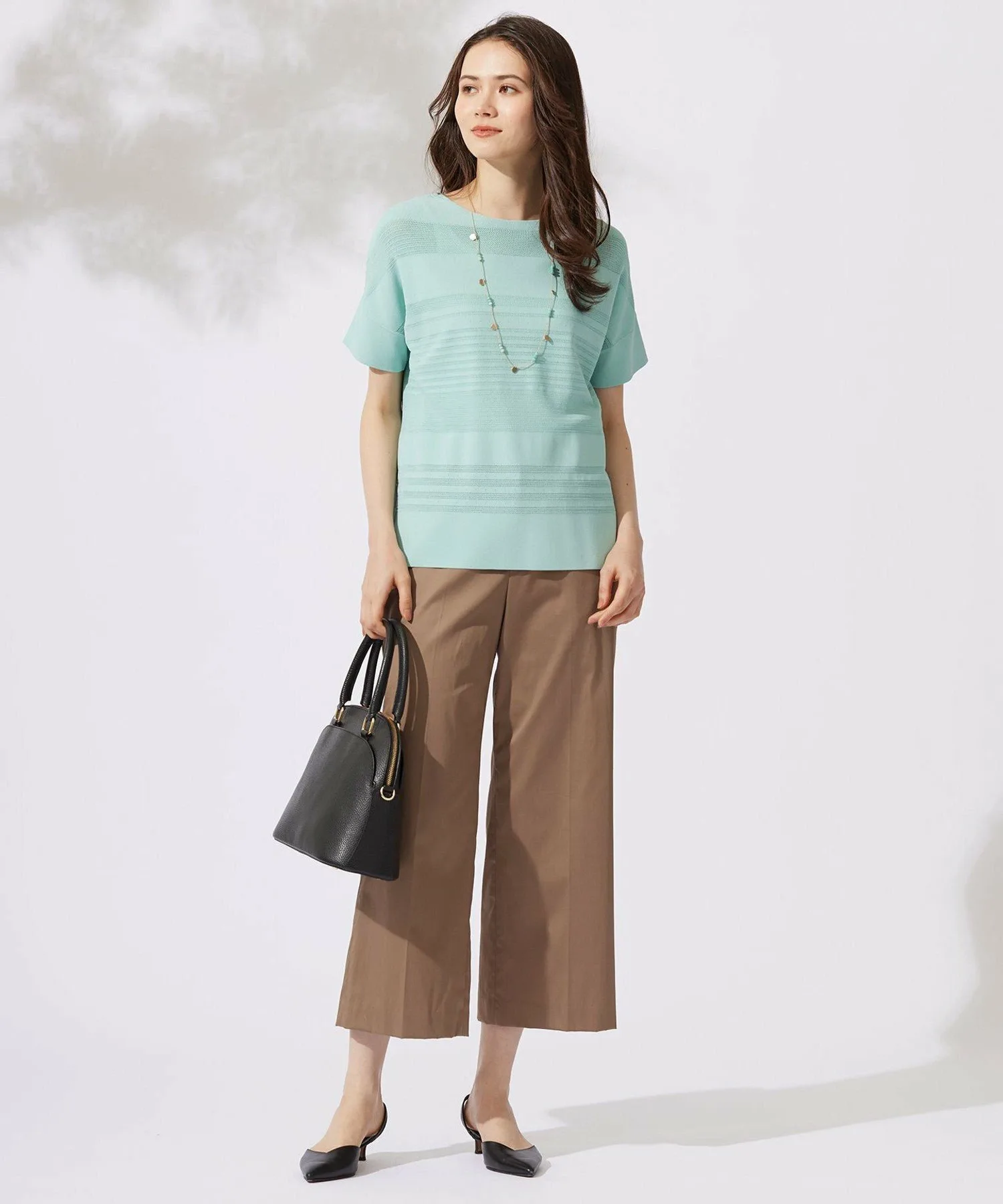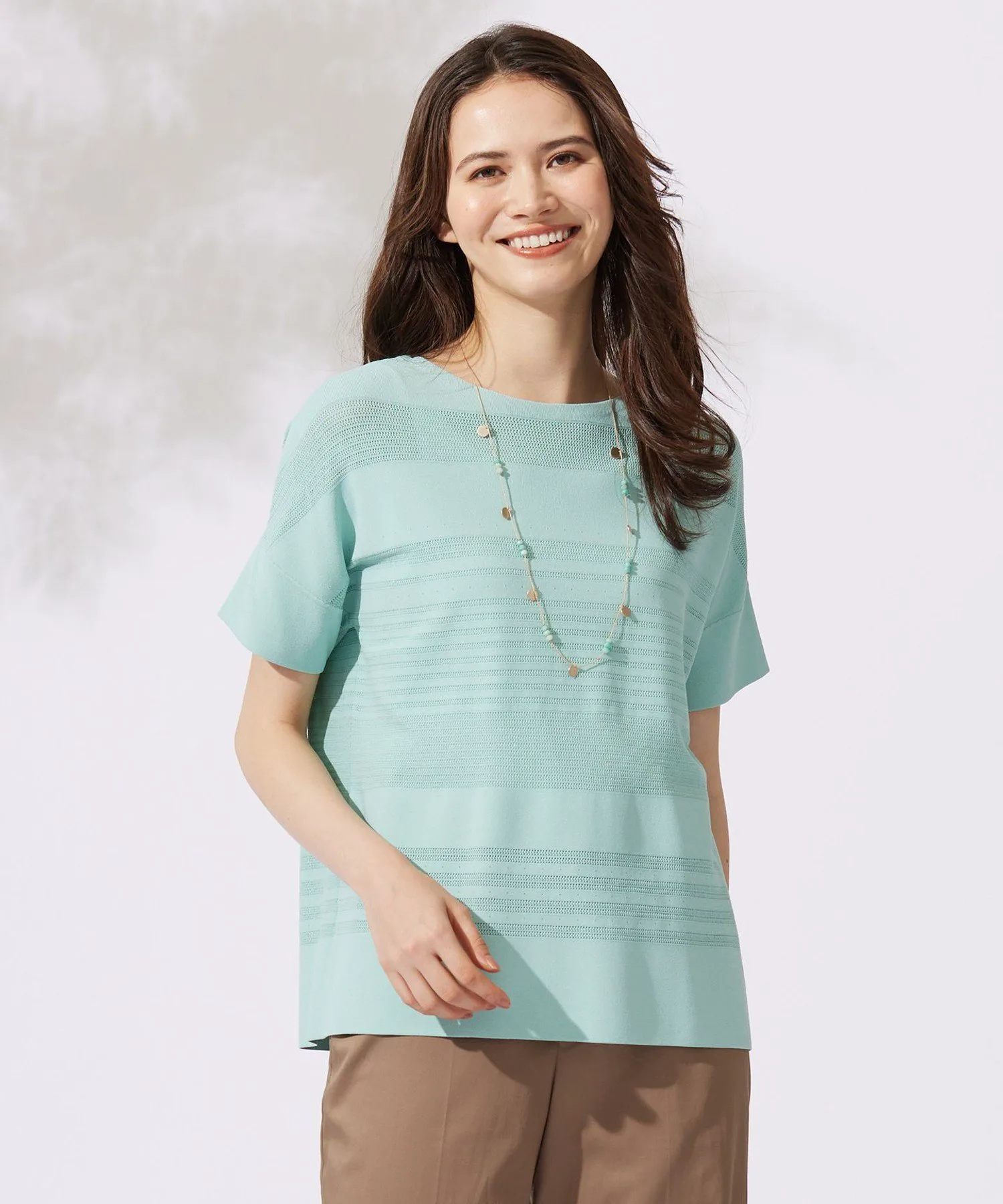 Этот трикотаж отличается стильным и великолепным полосатым узором. Дизайн: В этом трикотаже сочетаются различные узоры и цвета, создавая полосатый эффект. Сохраняя очарование трикотажной одежды, он имеет слегка свободный силуэт и дизайн, закрывающий верхнюю часть рук, что позволяет носить его как футболку. Его легкость и прохлада позволяют легко сочетать его с любыми брюками или юбками. Материал: Изготовлен из скрученной пряжи из вискозы и эластичного полиэстера. Его эластичная текстура обеспечивает свободу движений и облегает тело, обеспечивая комфортную посадку. Плотно скрученная пряжа создает крепоподобную поверхность, придавая материалу сухость, свежесть и освежающую прохладу, а также элегантную драпировку. Он также обеспечивает защиту от УФ-излучения.