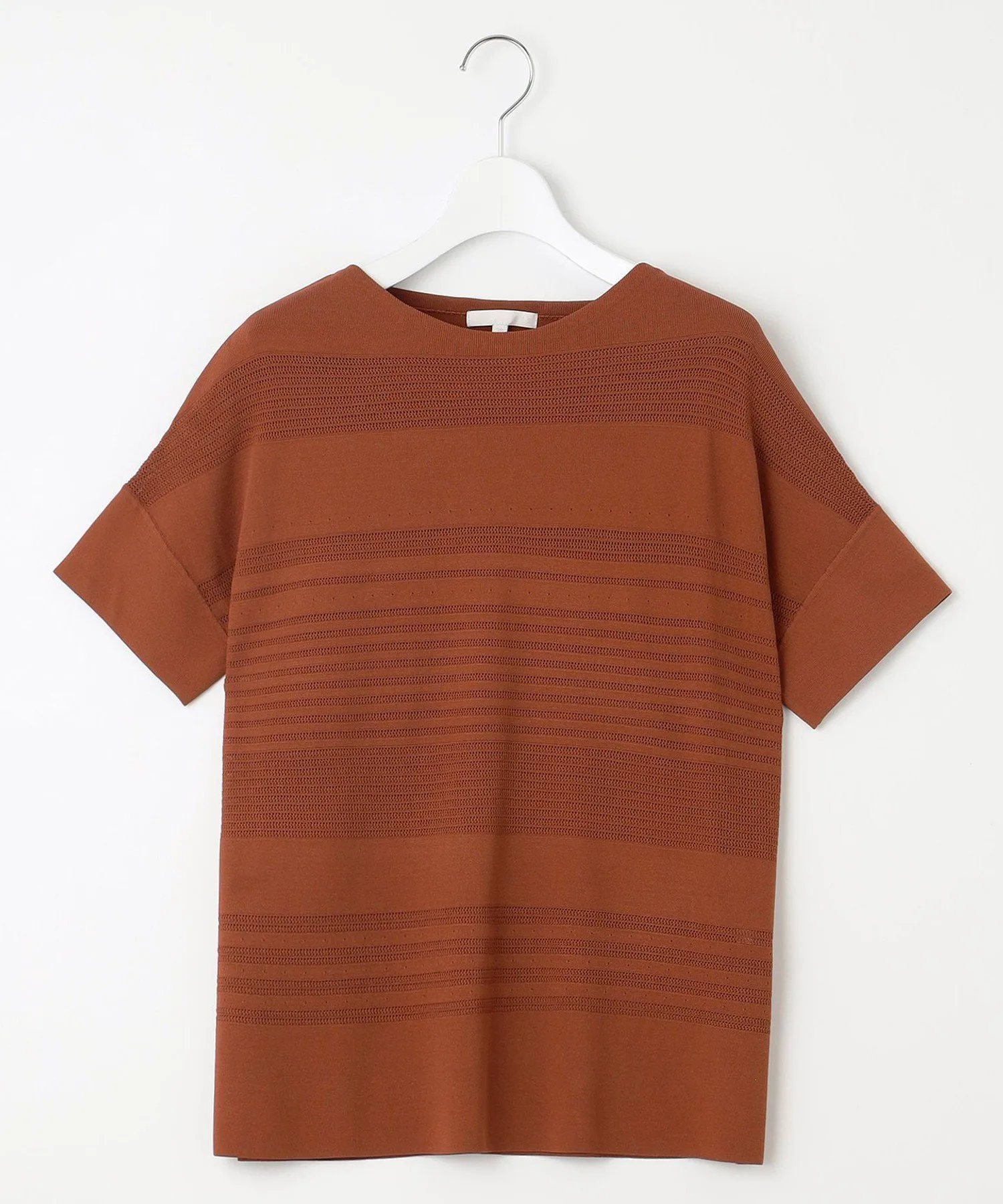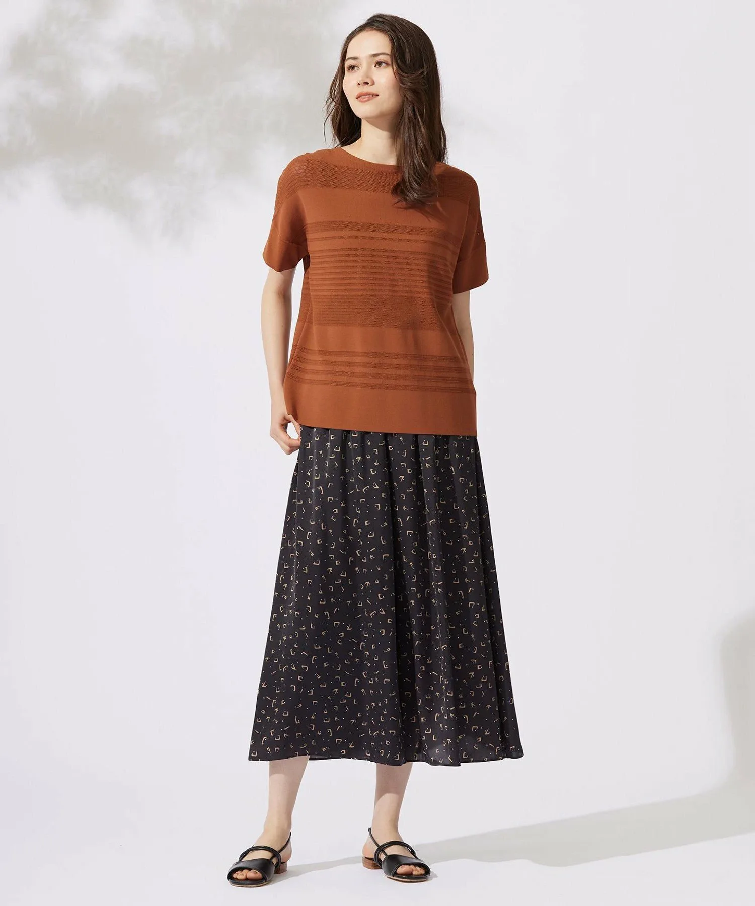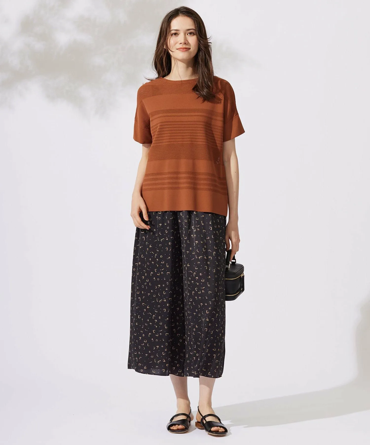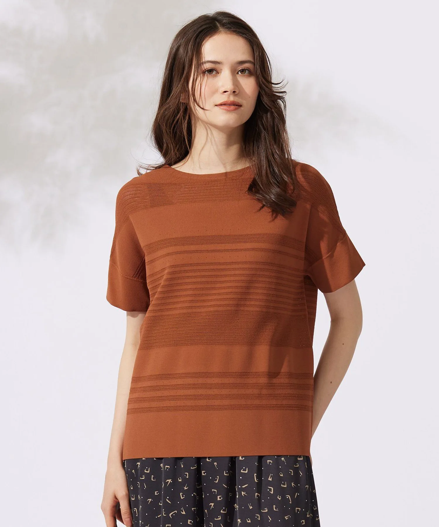 Этот трикотаж отличается стильным и великолепным полосатым узором. Дизайн: В этом трикотаже сочетаются различные узоры и цвета, создавая полосатый эффект. Сохраняя очарование трикотажной одежды, он имеет слегка свободный силуэт и дизайн, закрывающий верхнюю часть рук, что позволяет носить его как футболку. Его легкость и прохлада позволяют легко сочетать его с любыми брюками или юбками. Материал: Изготовлен из скрученной пряжи из вискозы и эластичного полиэстера. Его эластичная текстура обеспечивает свободу движений и облегает тело, обеспечивая комфортную посадку. Плотно скрученная пряжа создает крепоподобную поверхность, придавая материалу сухость, свежесть и освежающую прохладу, а также элегантную драпировку. Он также обеспечивает защиту от УФ-излучения.