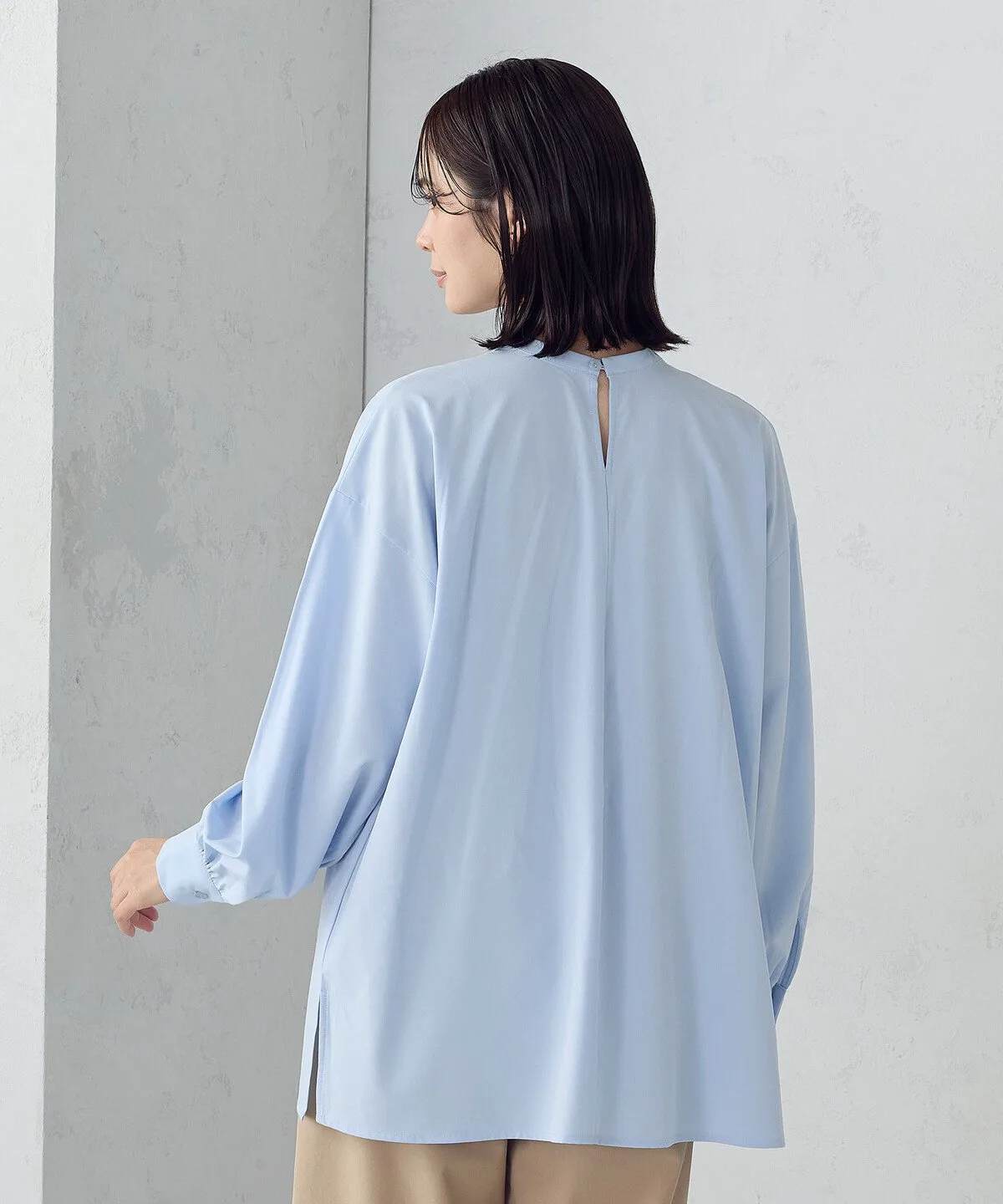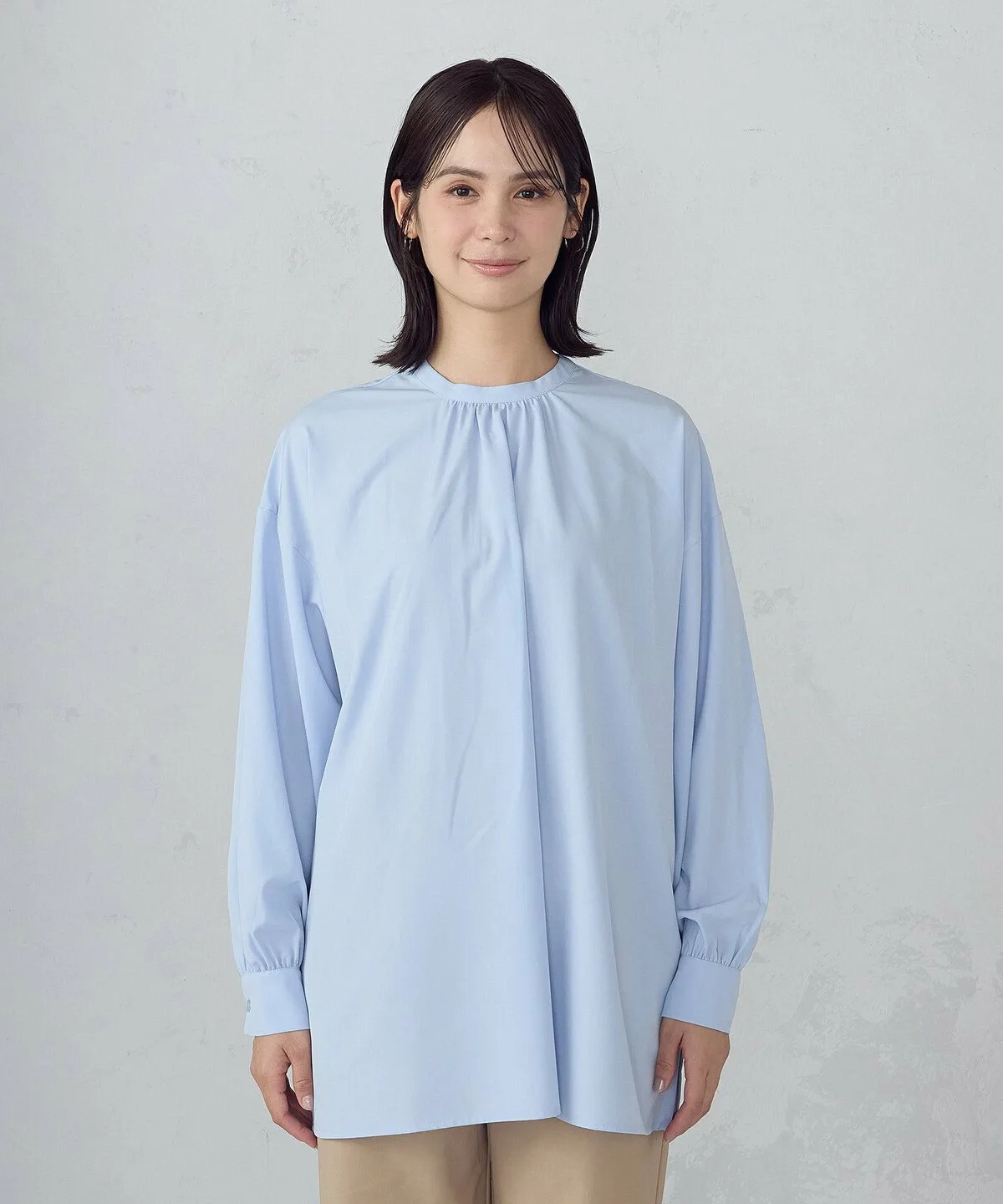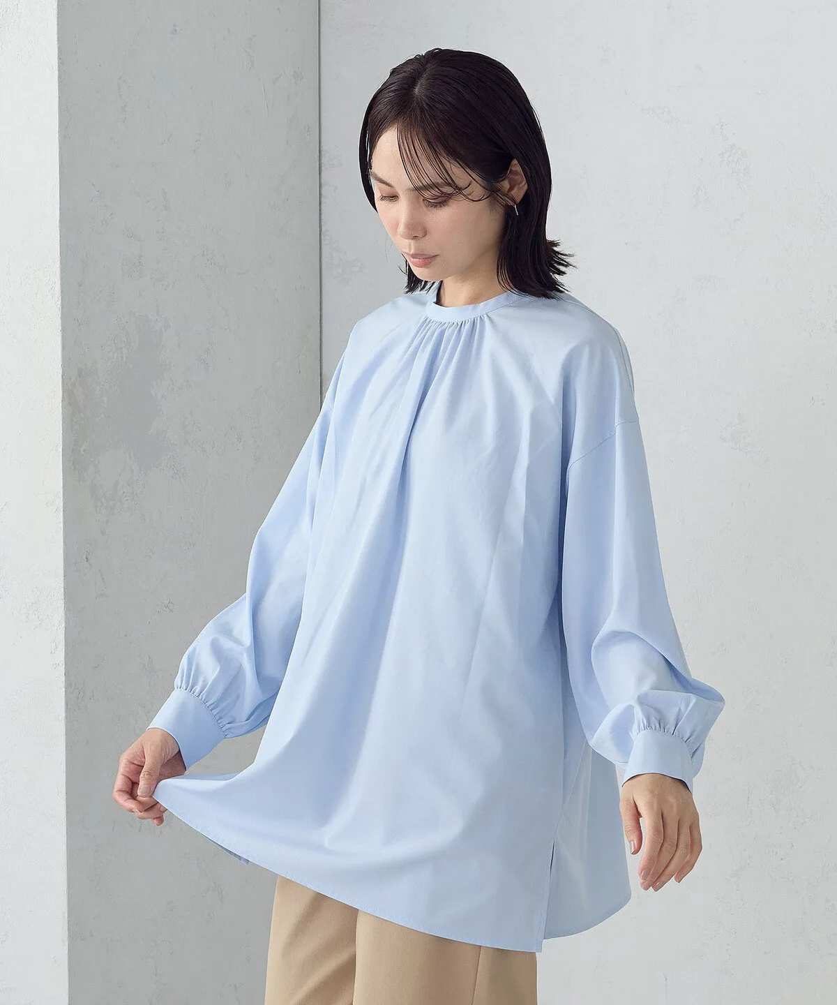 Эта блузка имеет дизайн без воротника и объемные рукава.