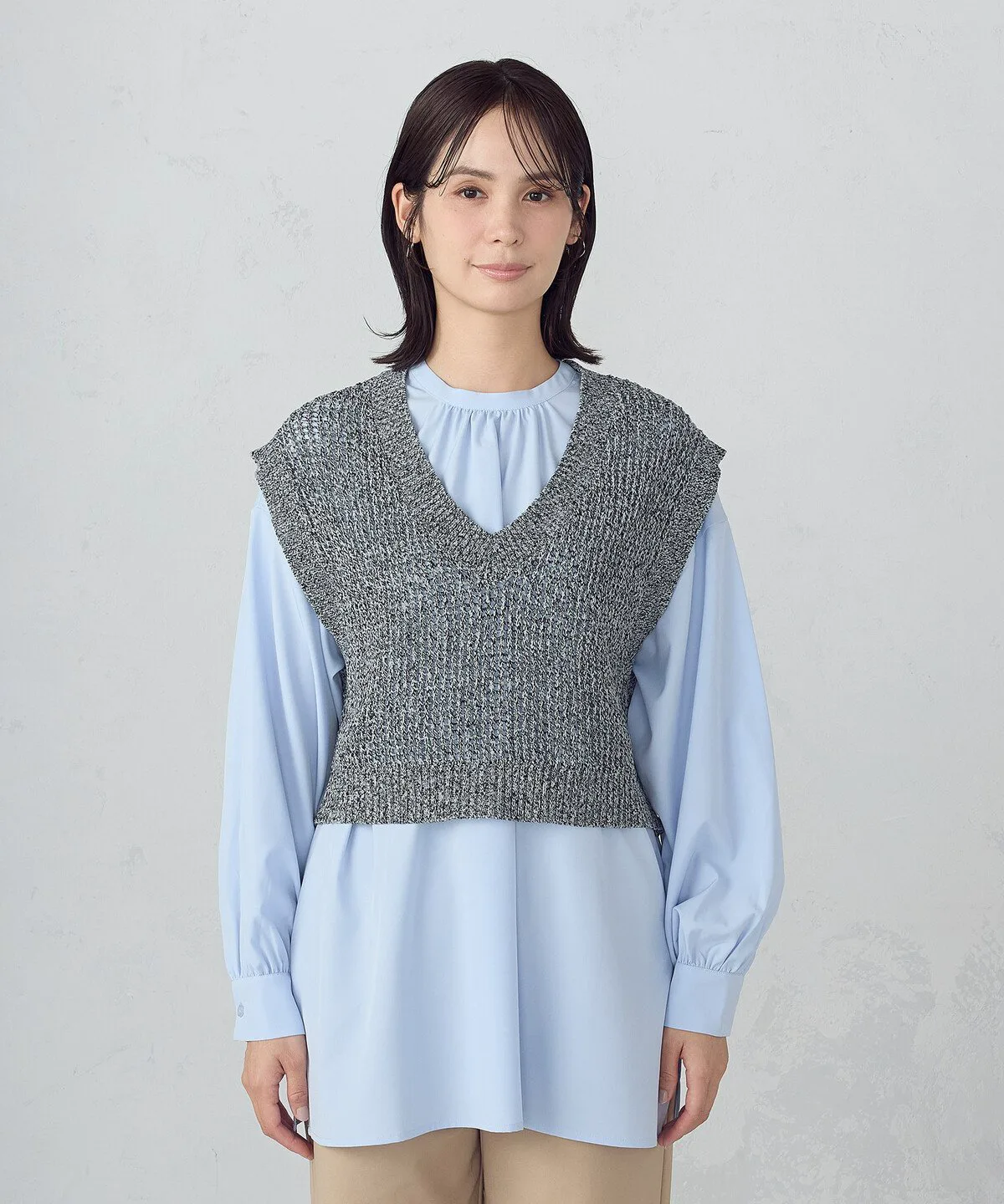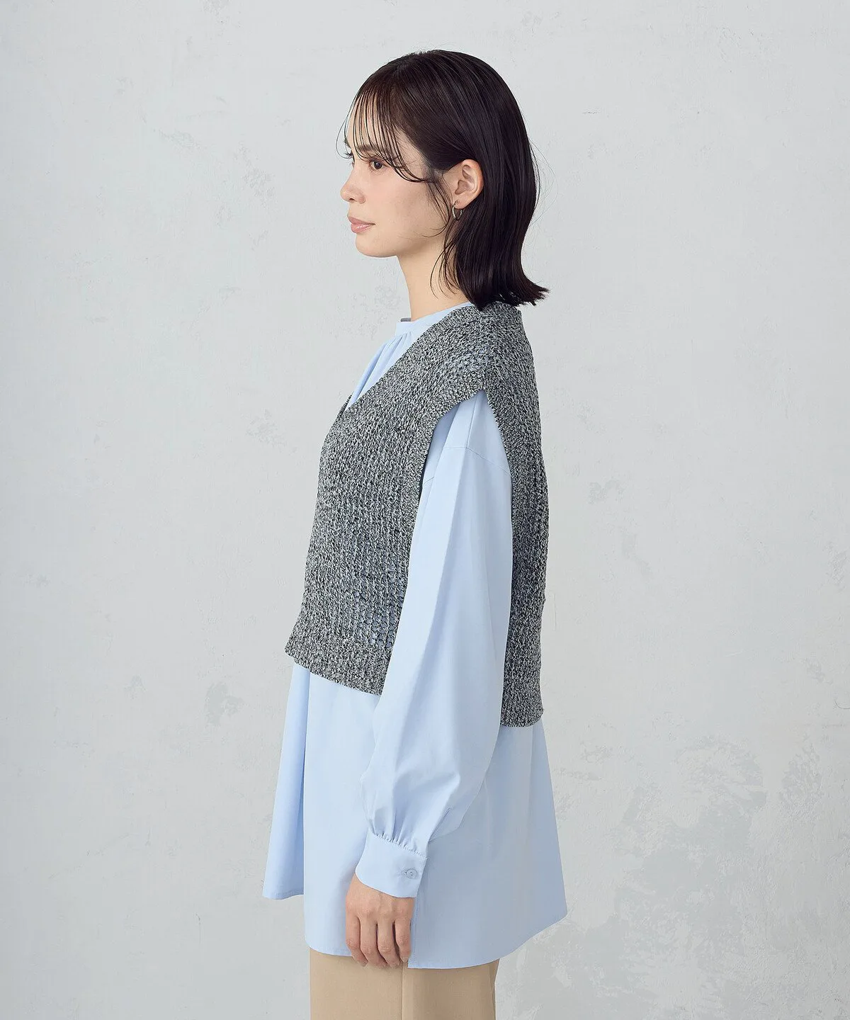 и представляет собой трикотажный жилет с текстурированной сетчатой вязкой.