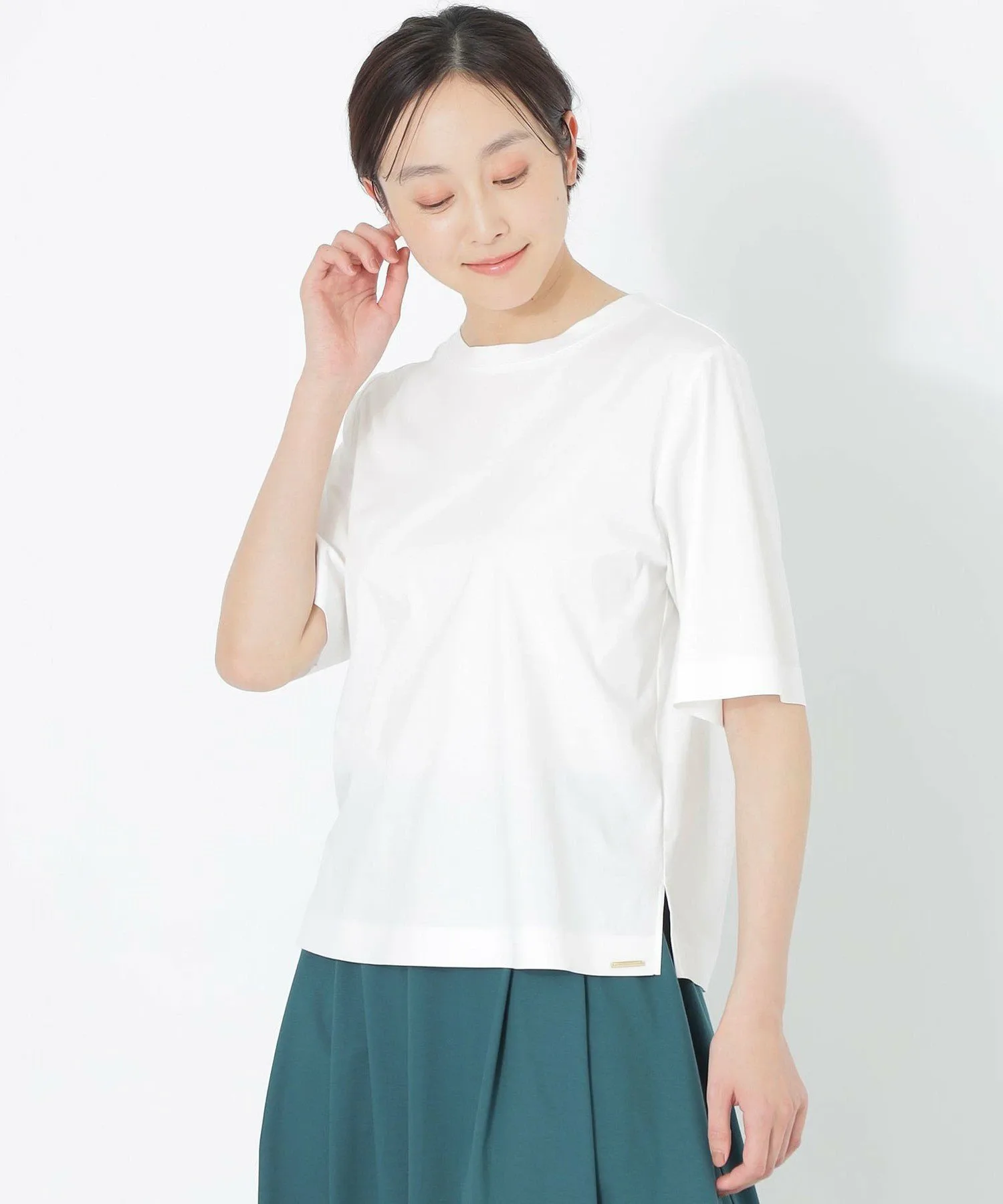 Он обладает охлаждающим эффектом и устойчивостью к пятнам от пота. *Обработка для предотвращения пятен от пота доступна только для темно-синего (29) и зеленого (75) цветов. *Этот товар был сфотографирован на образце. Изображение и характеристики могут отличаться от реального товара. Рост: 163 см, Обхват груди: 80 см, Обхват талии: 59 см, Обхват бедер: 82 см, Размер одежды: 38