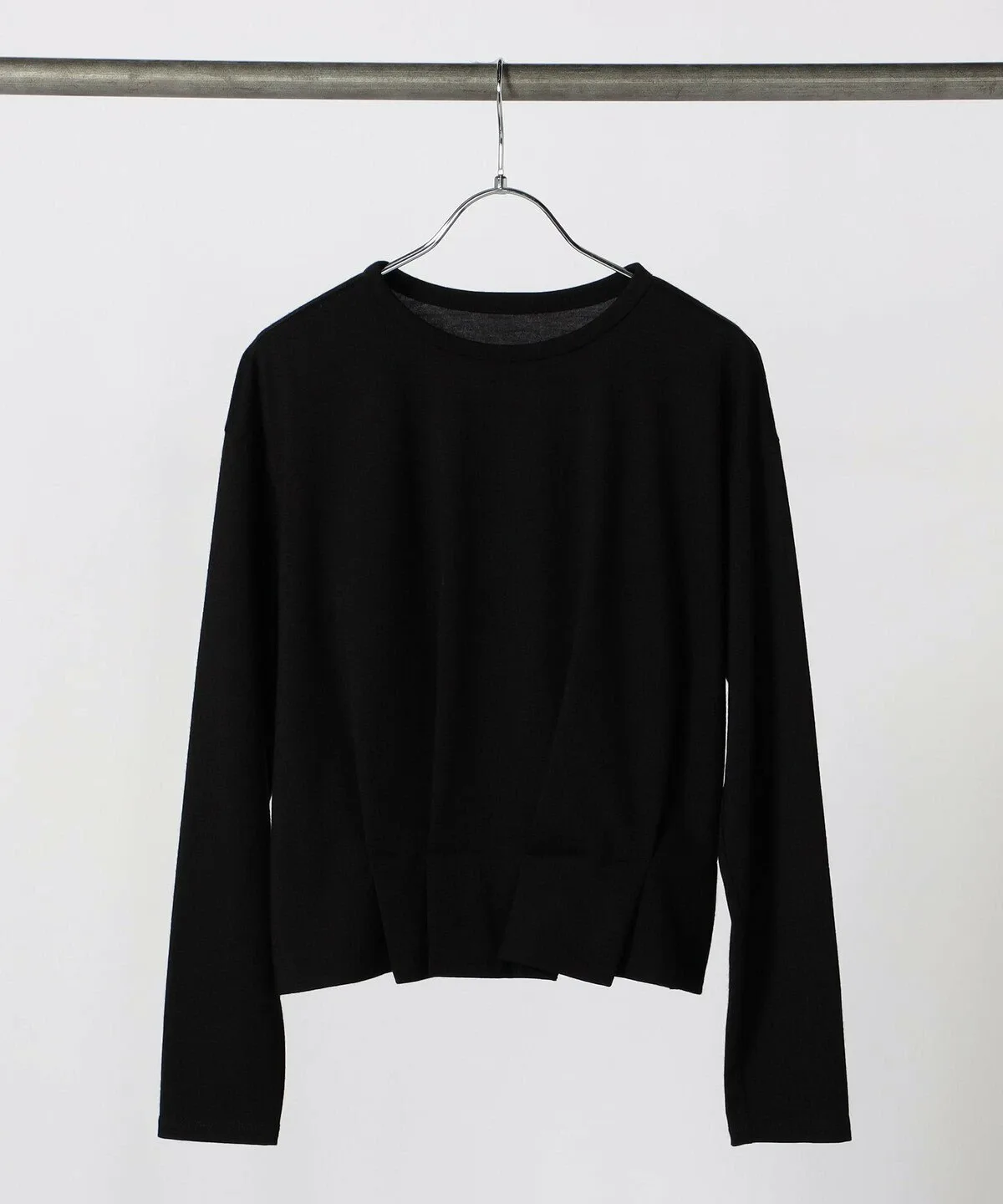 Этот топ из шерсти и полиэстера с декоративными складками — это изящная интерпретация простой футболки с круглым вырезом и длинными рукавами, украшенной складками.