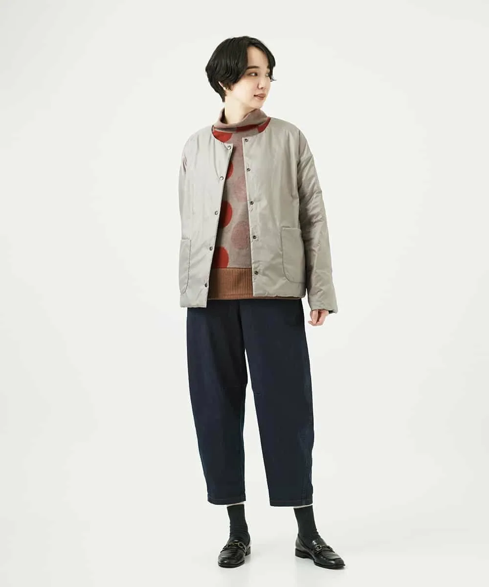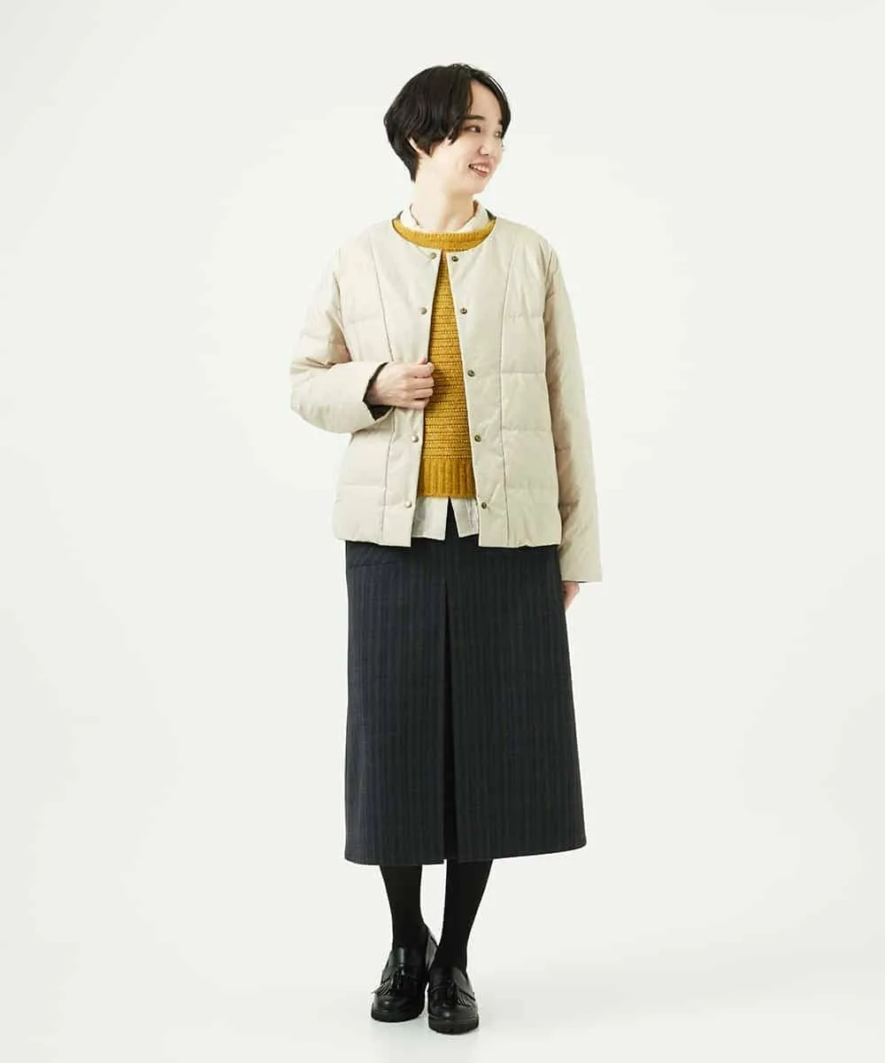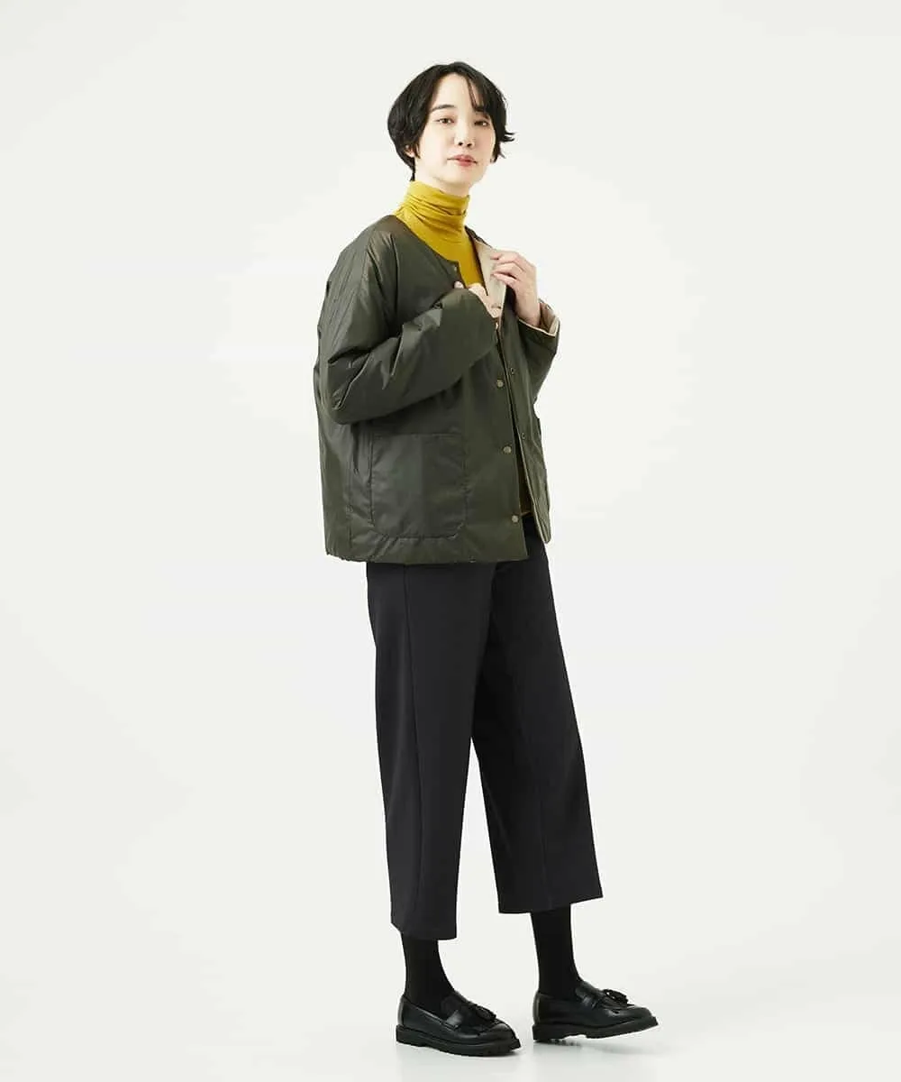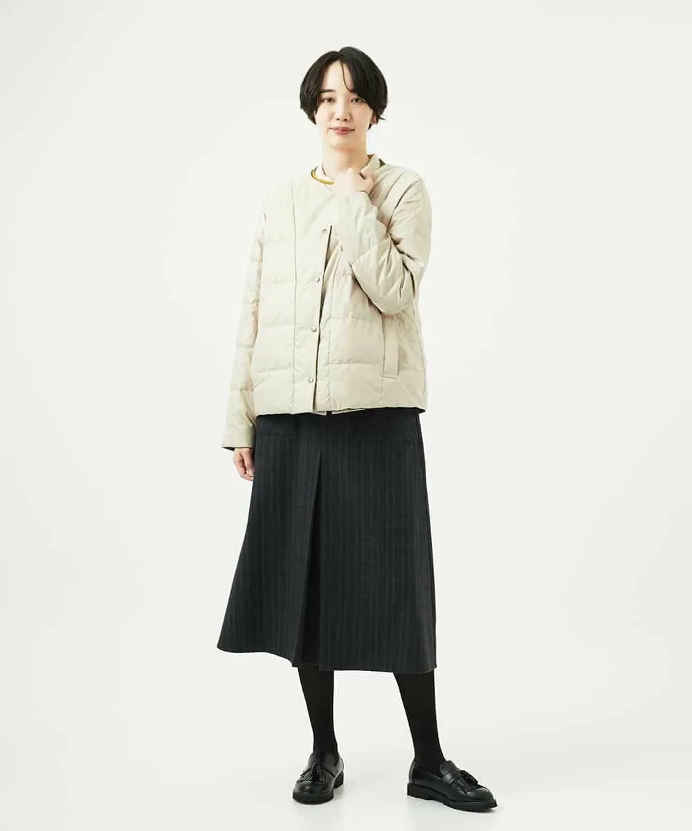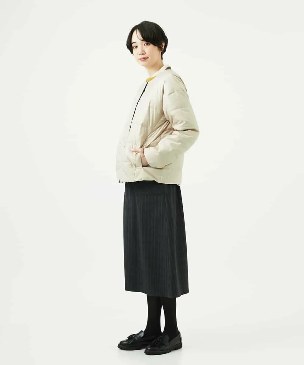 Эта двусторонняя пуховая куртка имеет модную короткую длину и два разных варианта ношения: спереди и сзади. Передняя сторона украшена пуховой строчкой для создания повседневного образа и может сочетаться с джинсами или широкими брюками. Задняя сторона без строчки рекомендуется для более изысканного повседневного стиля. Обе стороны имеют удобные карманы.