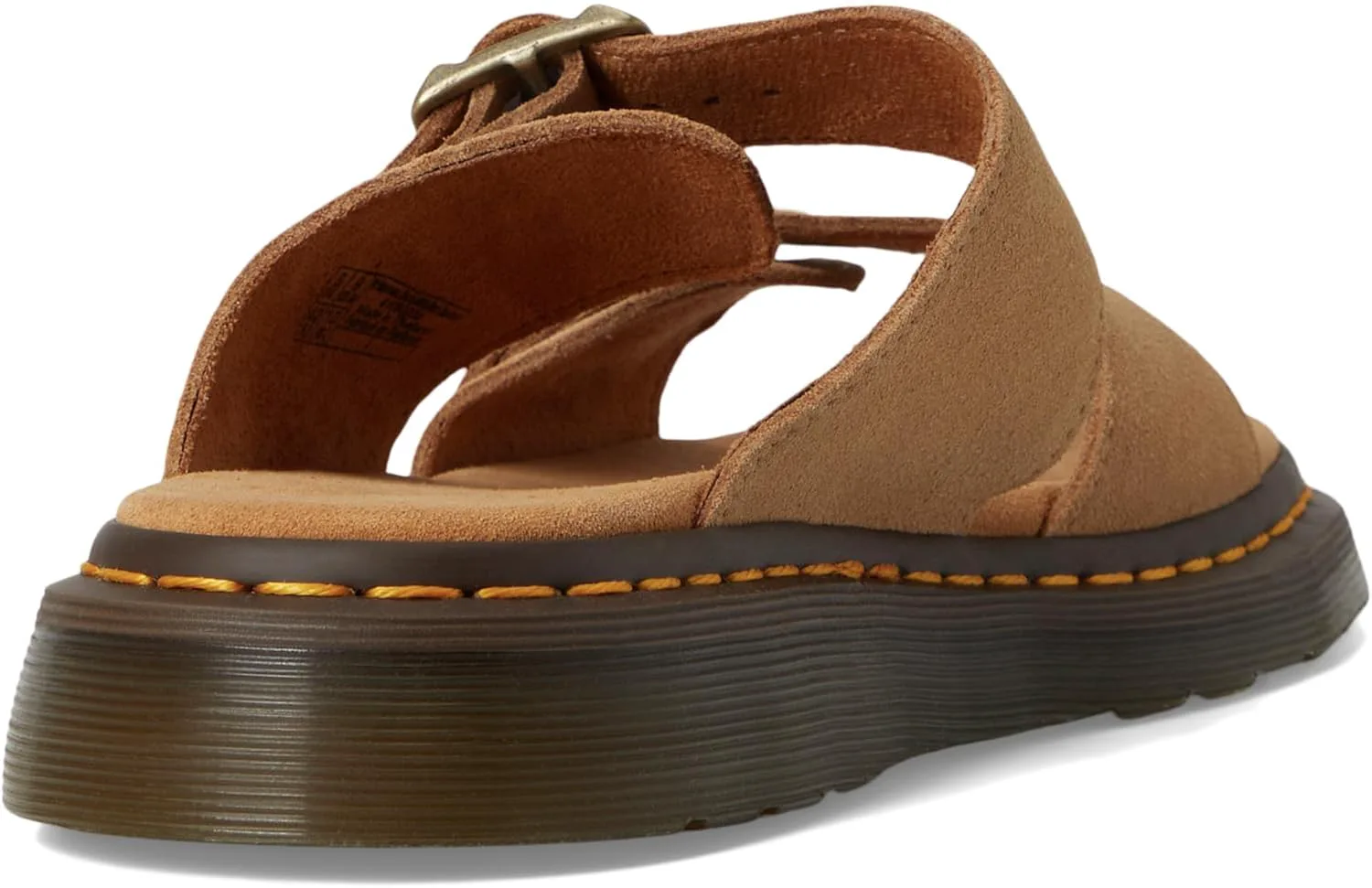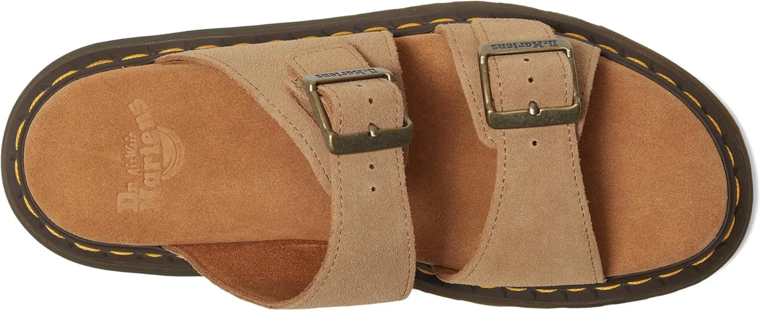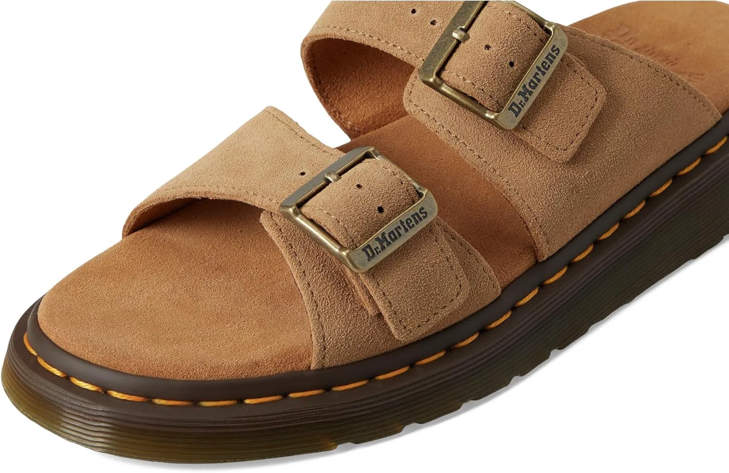 Josef - это универсальные сандалии для любого случая. Легко надевать и просто сочетать с разной одеждой. Оснащены двумя регулируемыми пряжками и стелькой из поролона, покрытой замшей, для комфортного отдыха в летние дни. Кромка подошвы украшена классической канавкой DM и закреплена желтой строчкой.