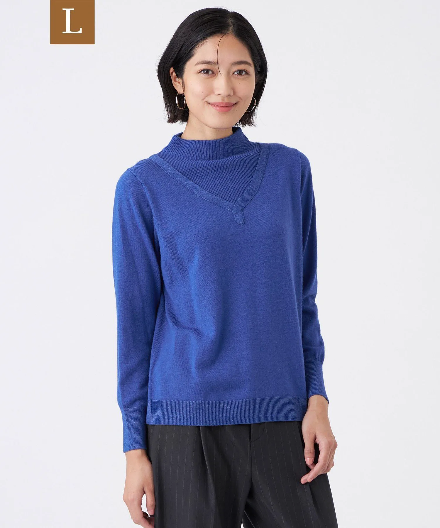 Этот вязаный пуловер имеет многослойный вид благодаря разнообразным узорам вязания на высоком воротнике и основной части.