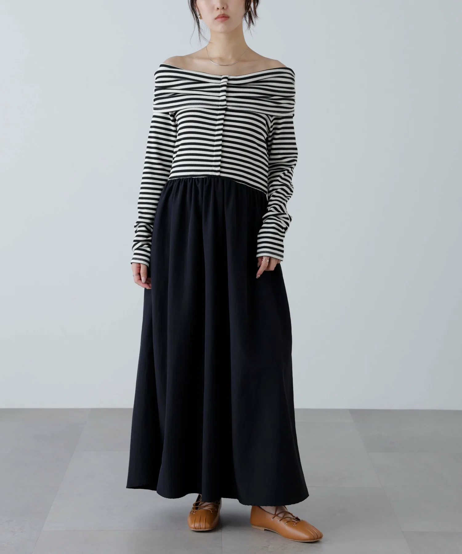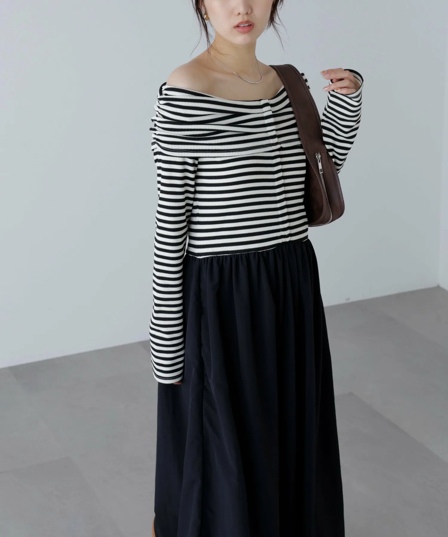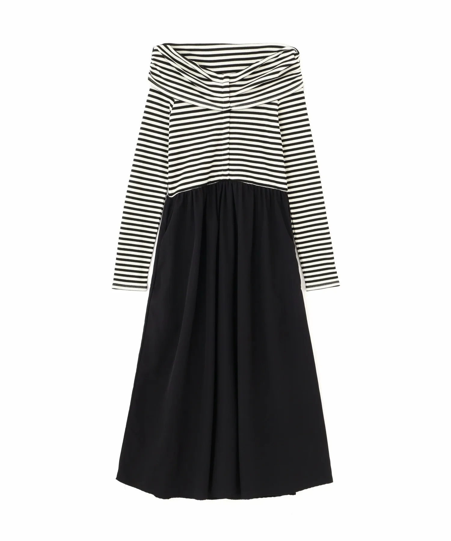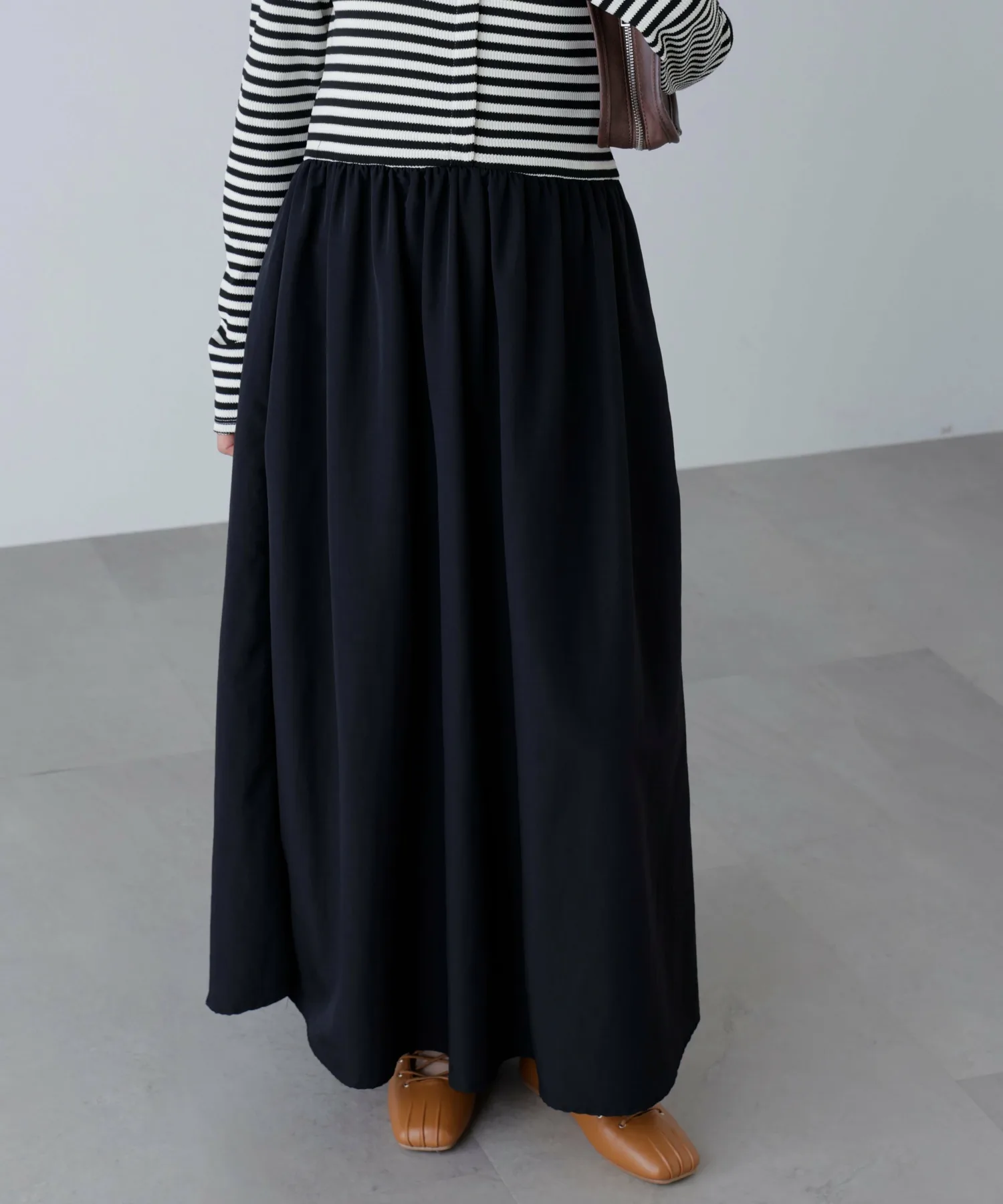 В продаже появилось платье, сочетающее популярный крой и пошив с юбкой! Дизайн сочетает в себе вафельный верх и расклешенную юбку из нейлона. Свободный материал придает платью силуэт «приталенное и расклешенное», который выглядит элегантно. Платье также имеет удобный карман. Это платье отлично смотрится само по себе, но мы также рекомендуем сочетать его с кепкой и кроссовками для создания повседневного образа.