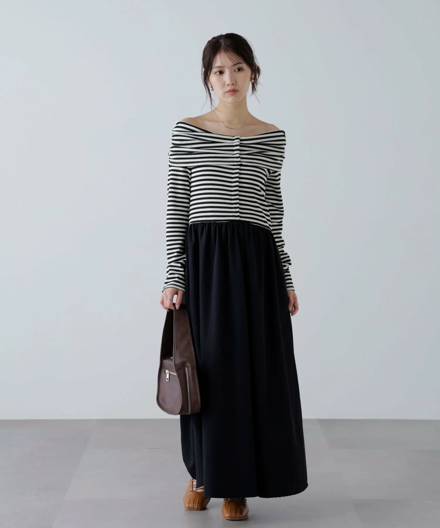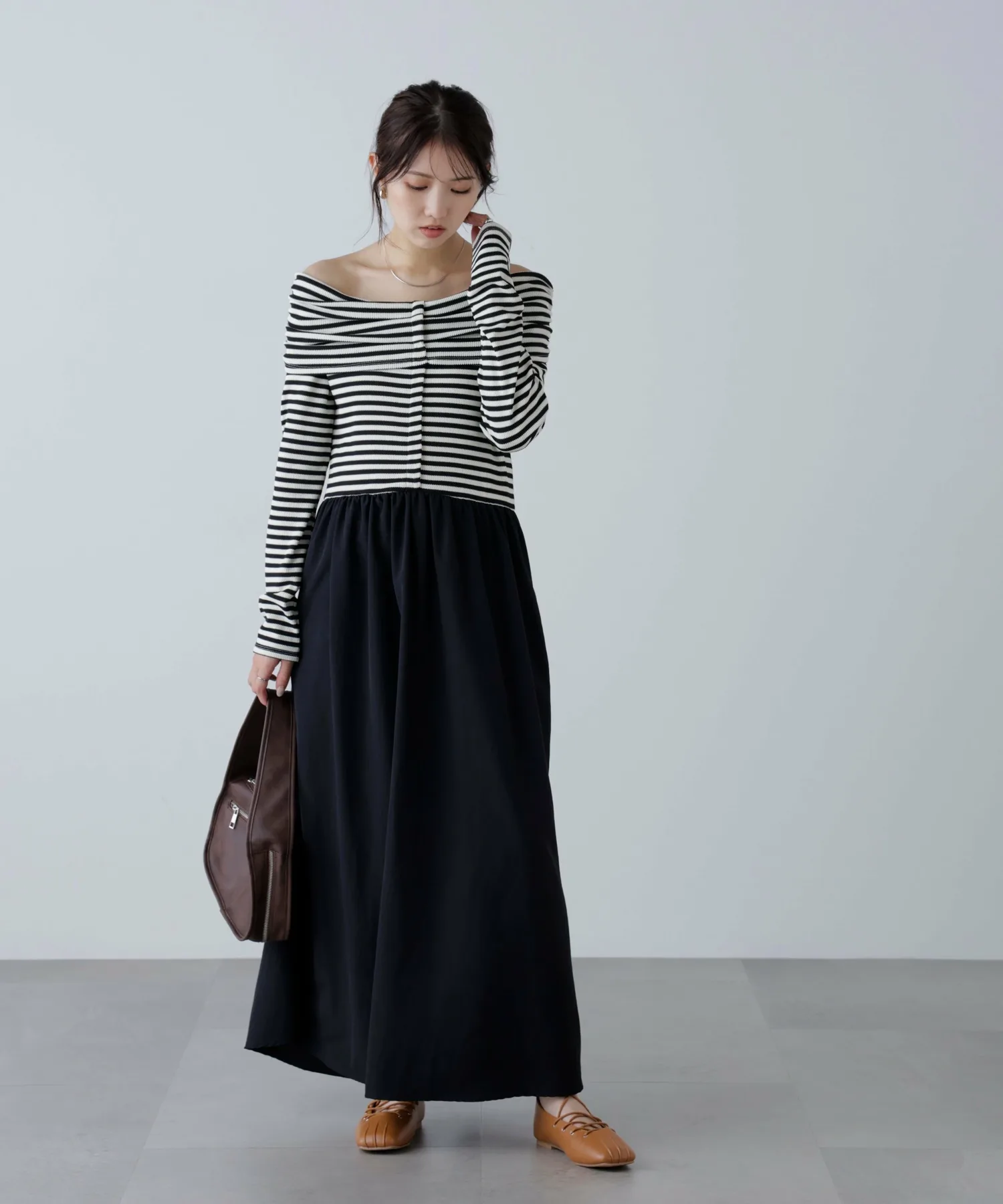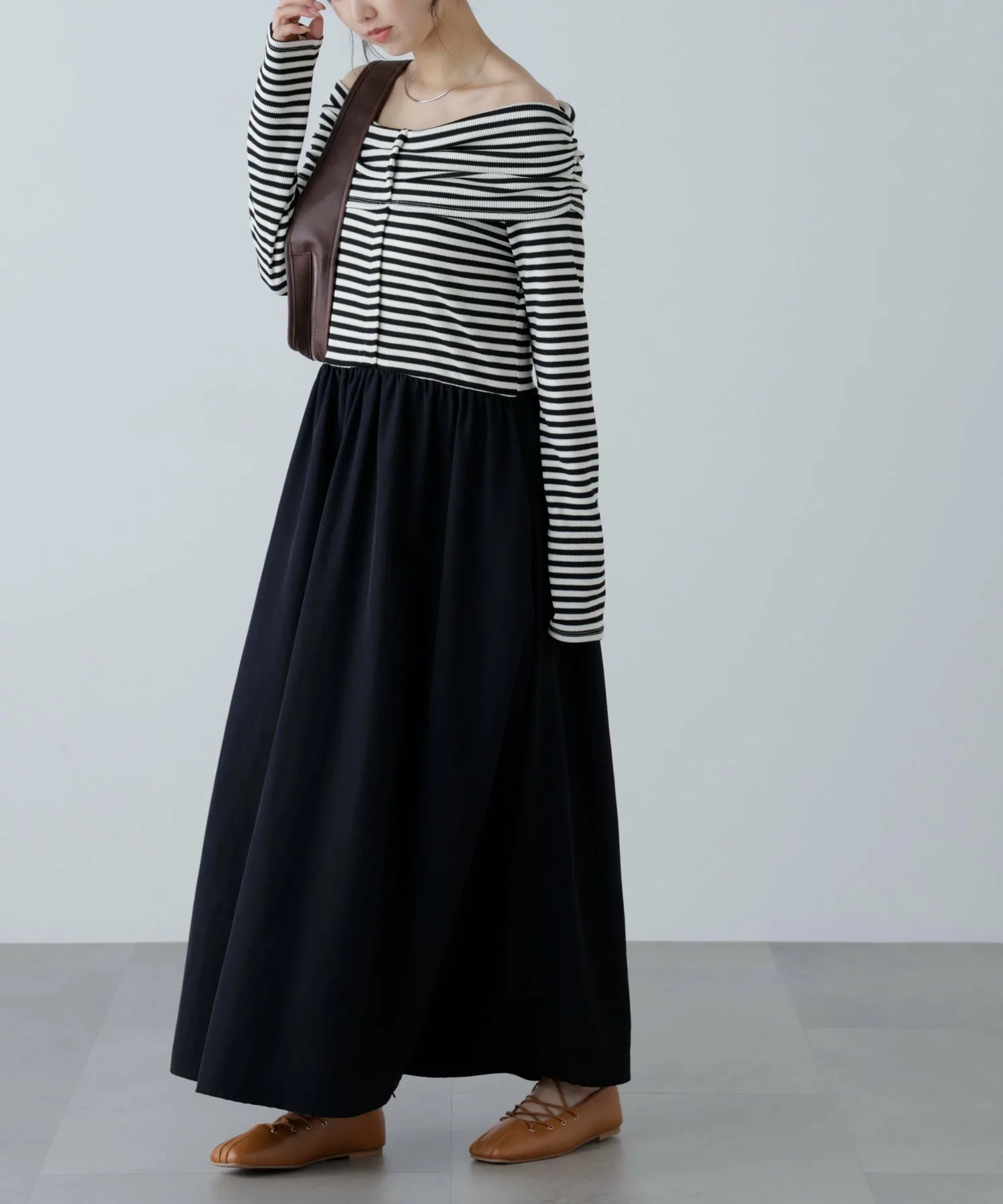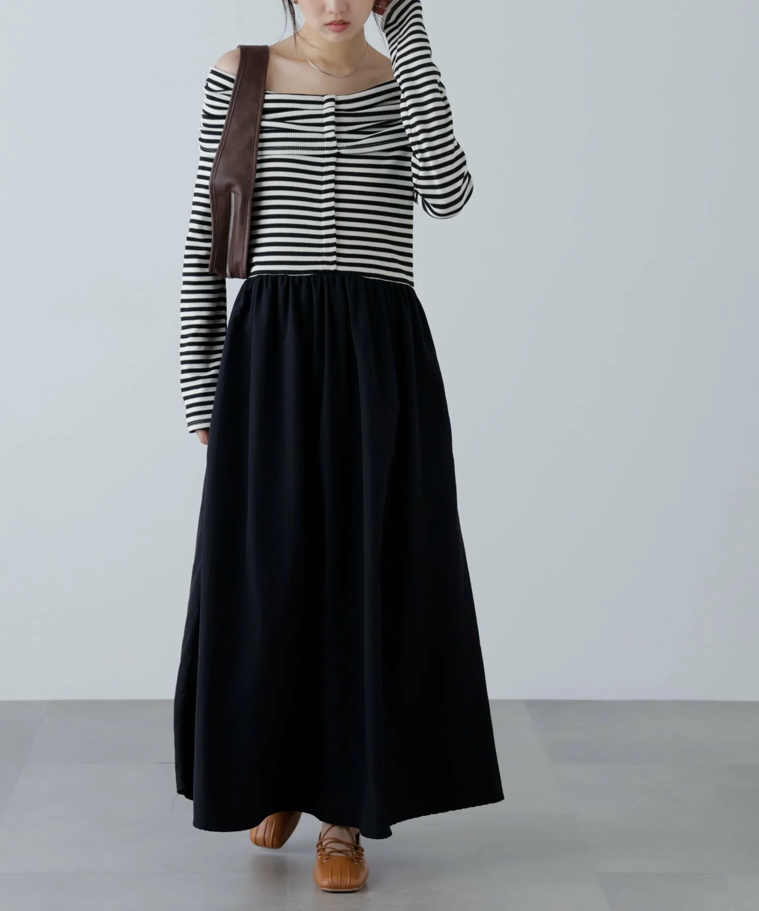 В продаже появилось платье, сочетающее популярный крой и пошив с юбкой! Дизайн сочетает в себе вафельный верх и расклешенную юбку из нейлона. Свободный материал придает платью силуэт «приталенное и расклешенное», который выглядит элегантно. Платье также имеет удобный карман. Это платье отлично смотрится само по себе, но мы также рекомендуем сочетать его с кепкой и кроссовками для создания повседневного образа.