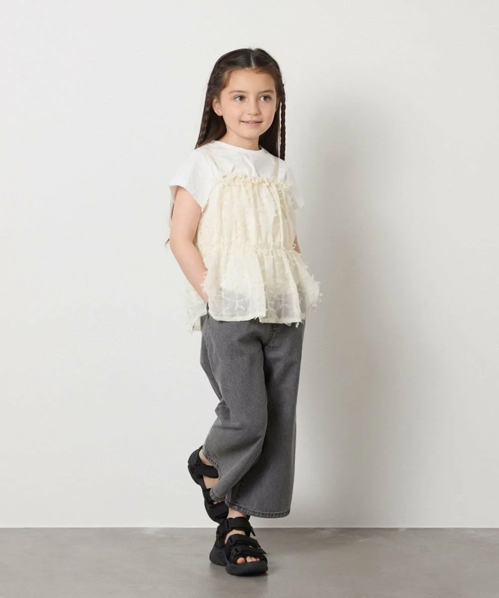 ・Простая футболка, соединенная с майкой из модного в этом сезоне шифона с перьевым тюлем.