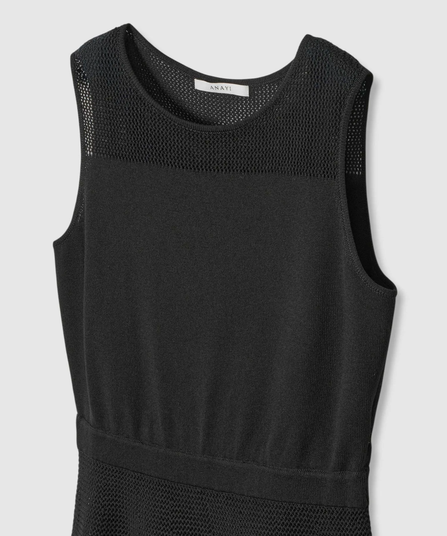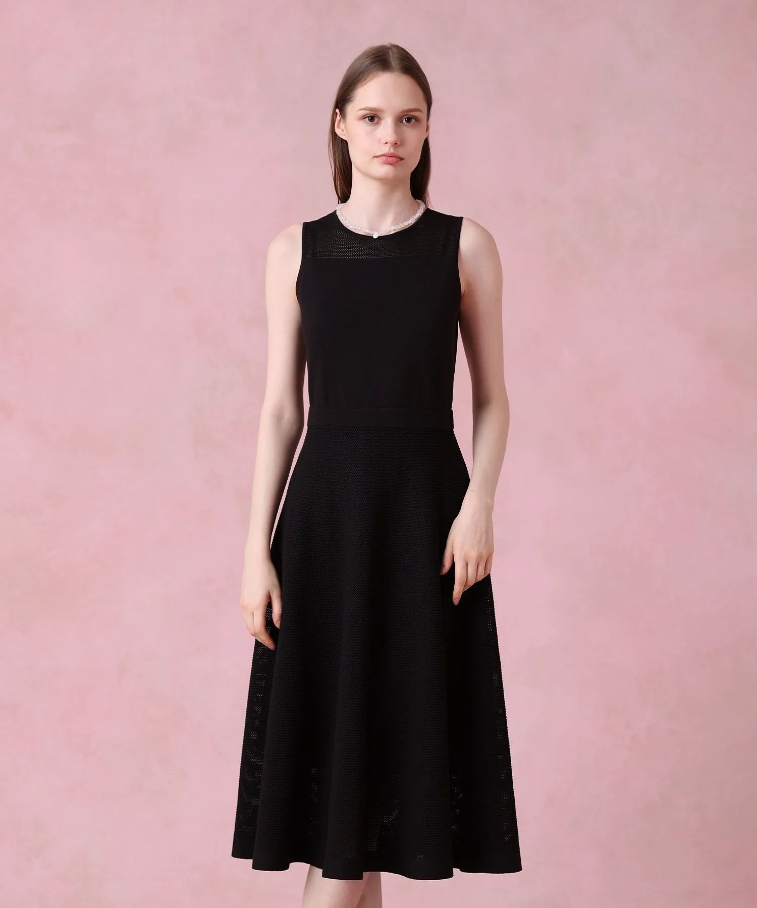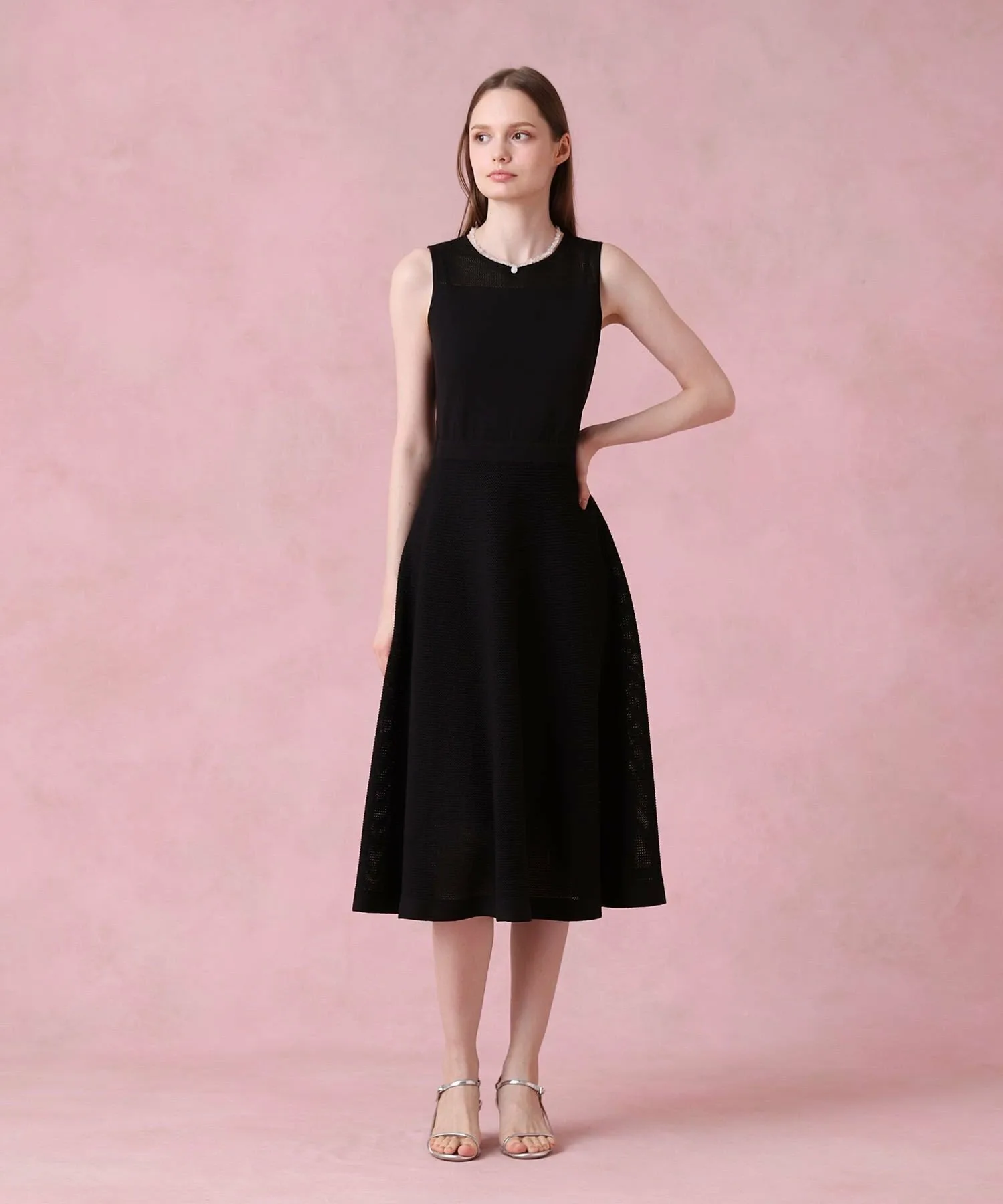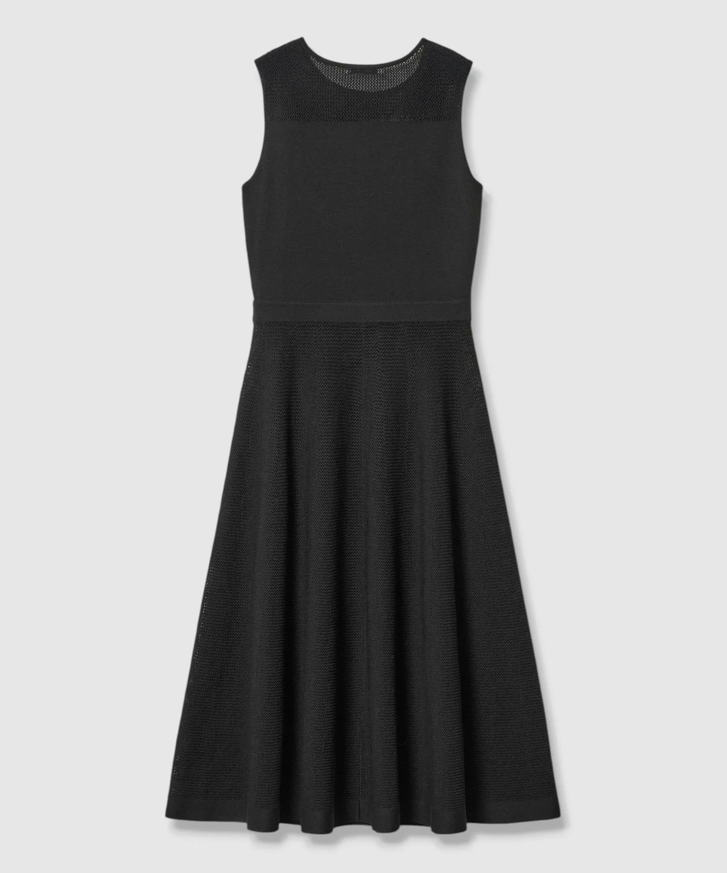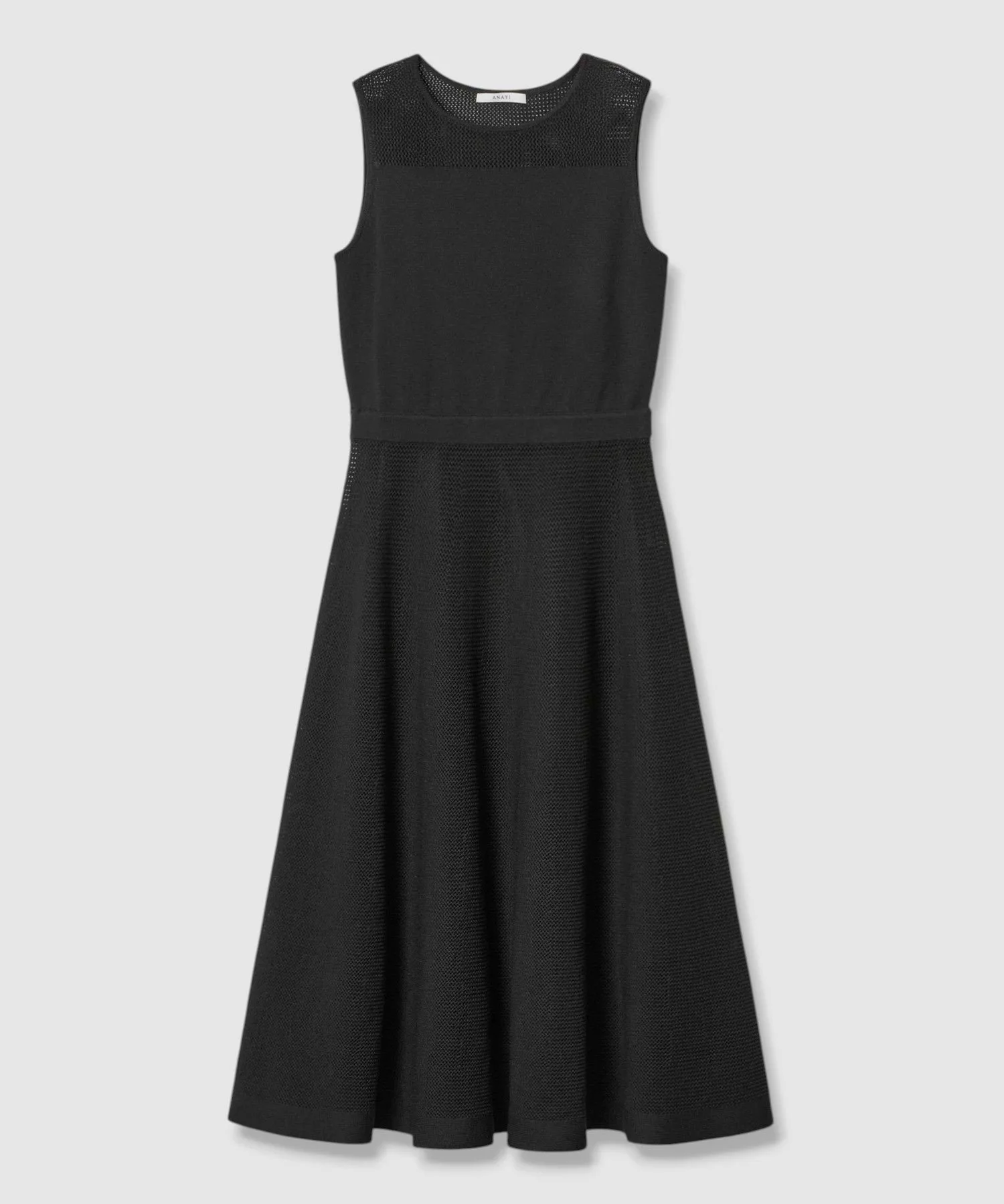 Прозрачное платье с расклешенной юбкой и сетчатыми плечами.