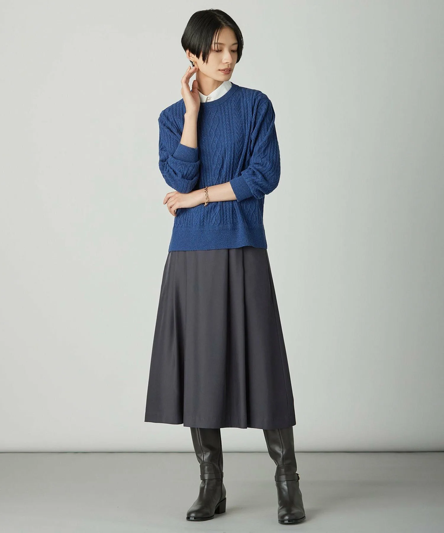 Этот вязаный свитер с круглым вырезом и косами отличается эффектным, смешанным дизайном, идеально подходящим для осени и зимы. Дизайн: Этот свитер с круглым вырезом и косами отличается классическим, но эффектным дизайном. Сохраняя четкий силуэт, трехмерный узор добавляет тепла и элегантности. Он дополняет как традиционные, так и женственные наряды, позволяя создавать разнообразные образы. Доступен в трех цветах: приглушенный светло-серый (#003), натуральный и мягкий бежевый (#033) и изысканный синий (#070). Материал: Эта ткань представляет собой смесь шерсти и шелкового непа, что создает привлекательный смешанный вид. Роскошная текстура шелкового непа дополняет гладкое, нежное прикосновение вискозы, создавая элегантную и комфортную текстуру.