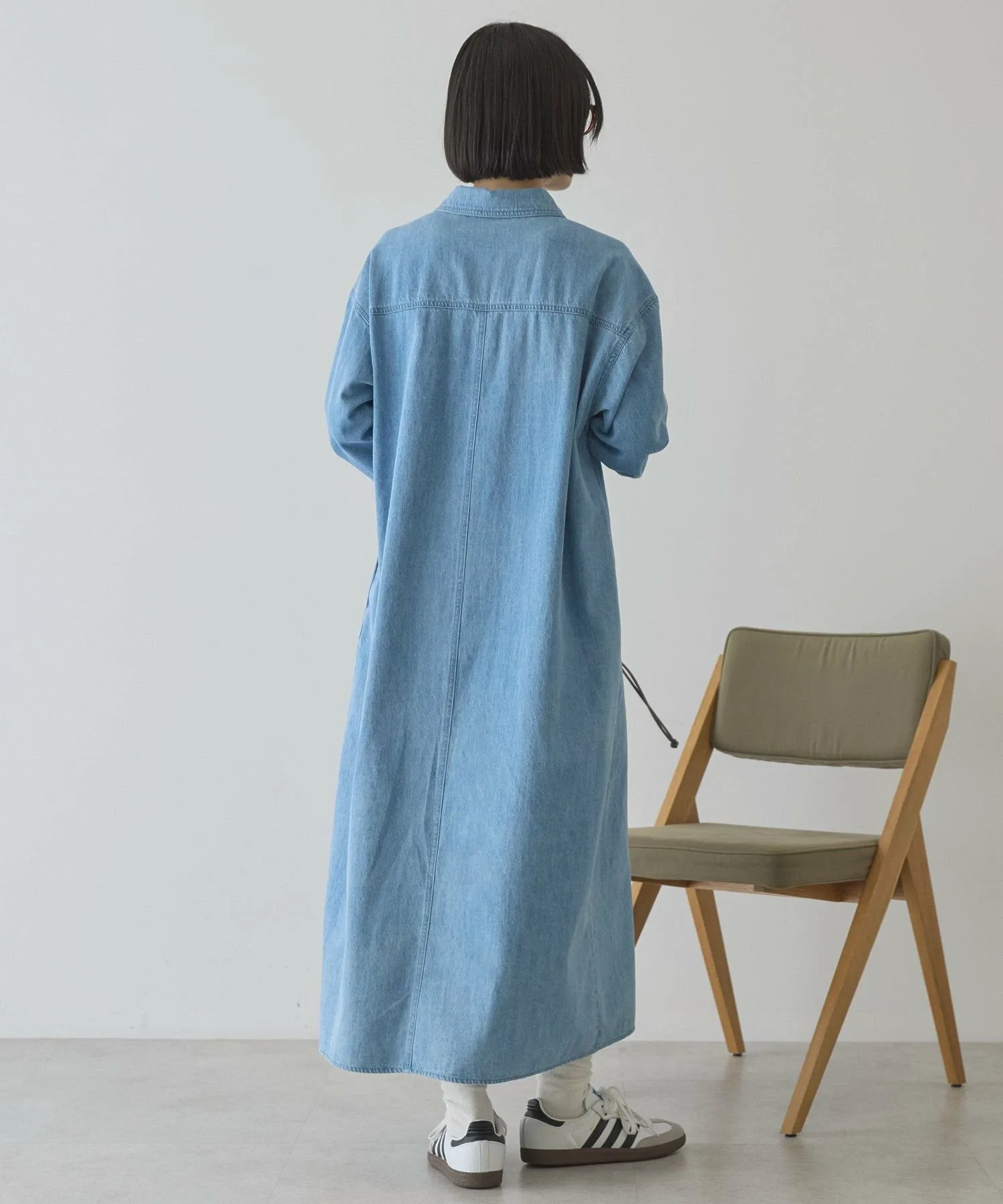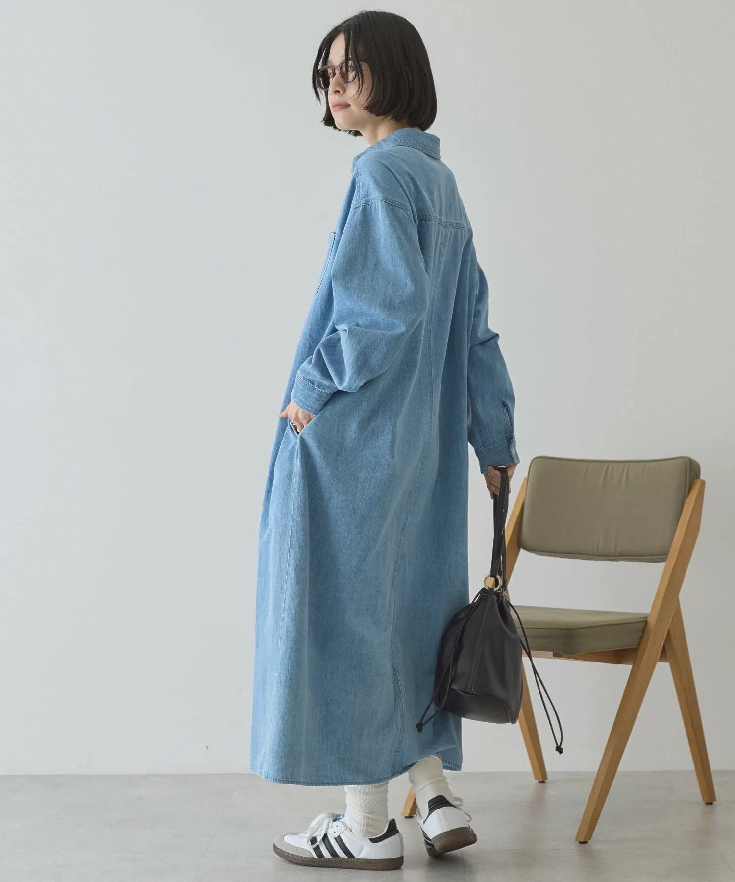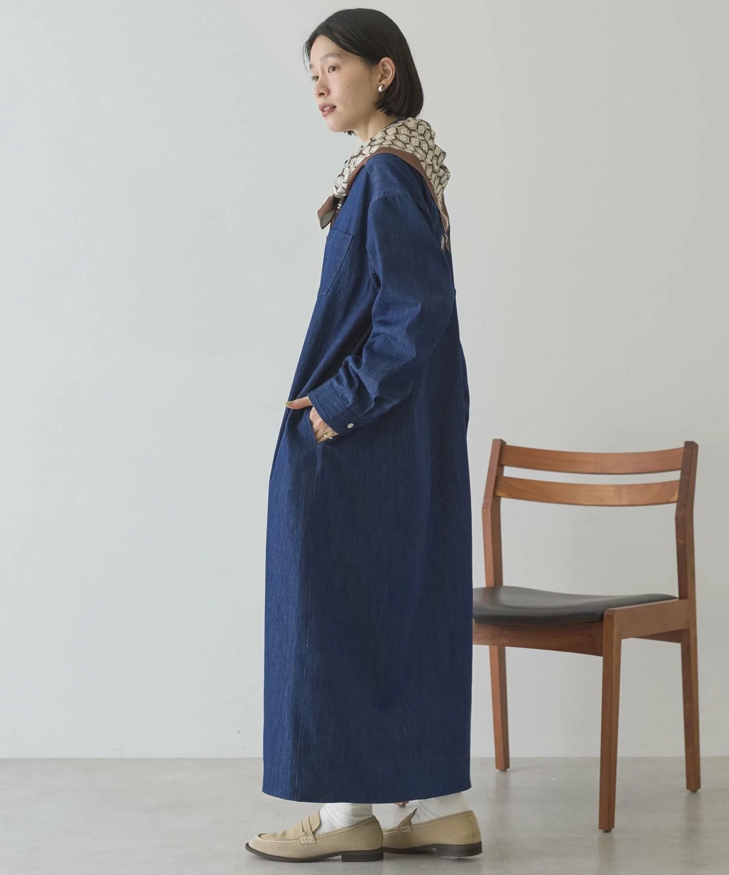 Джинсовое платье длинного фасона с лаконичным дизайном, создающее элегантный образ, не слишком повседневный.