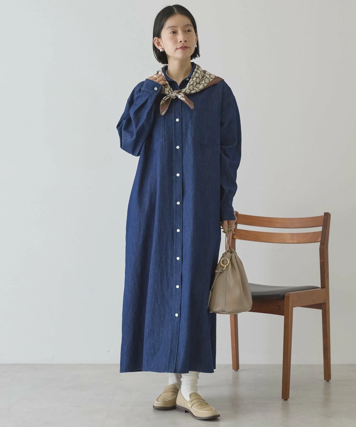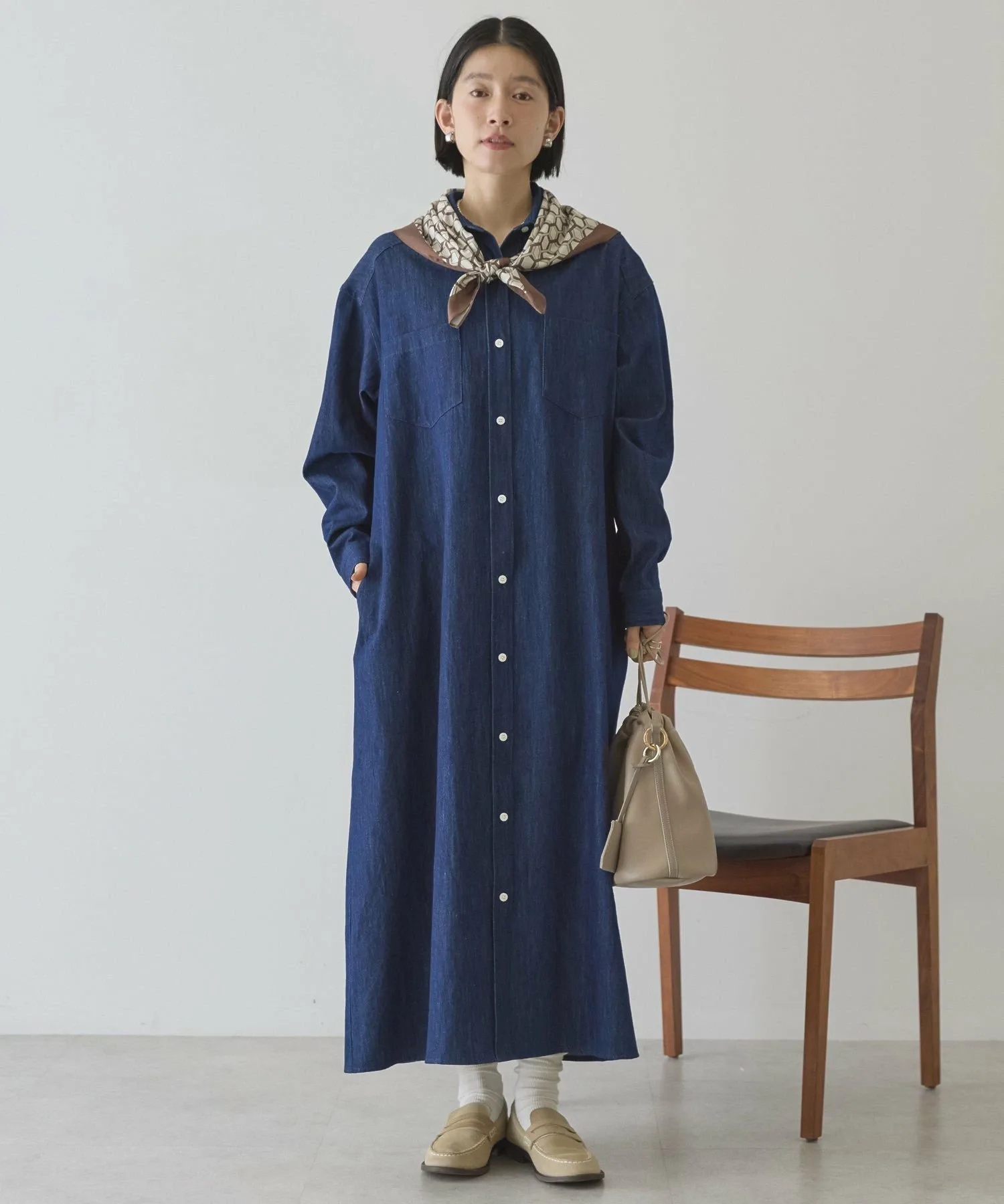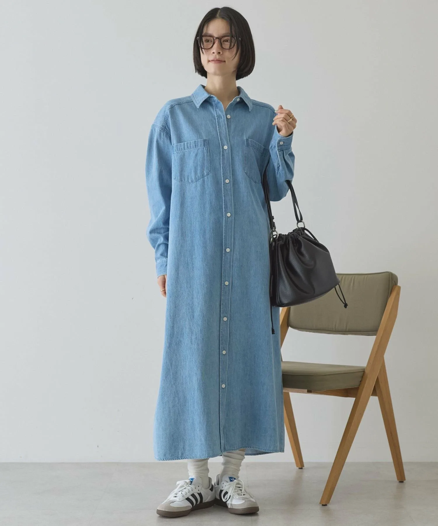 Джинсовое платье длинного фасона с лаконичным дизайном, создающее элегантный образ, не слишком повседневный.