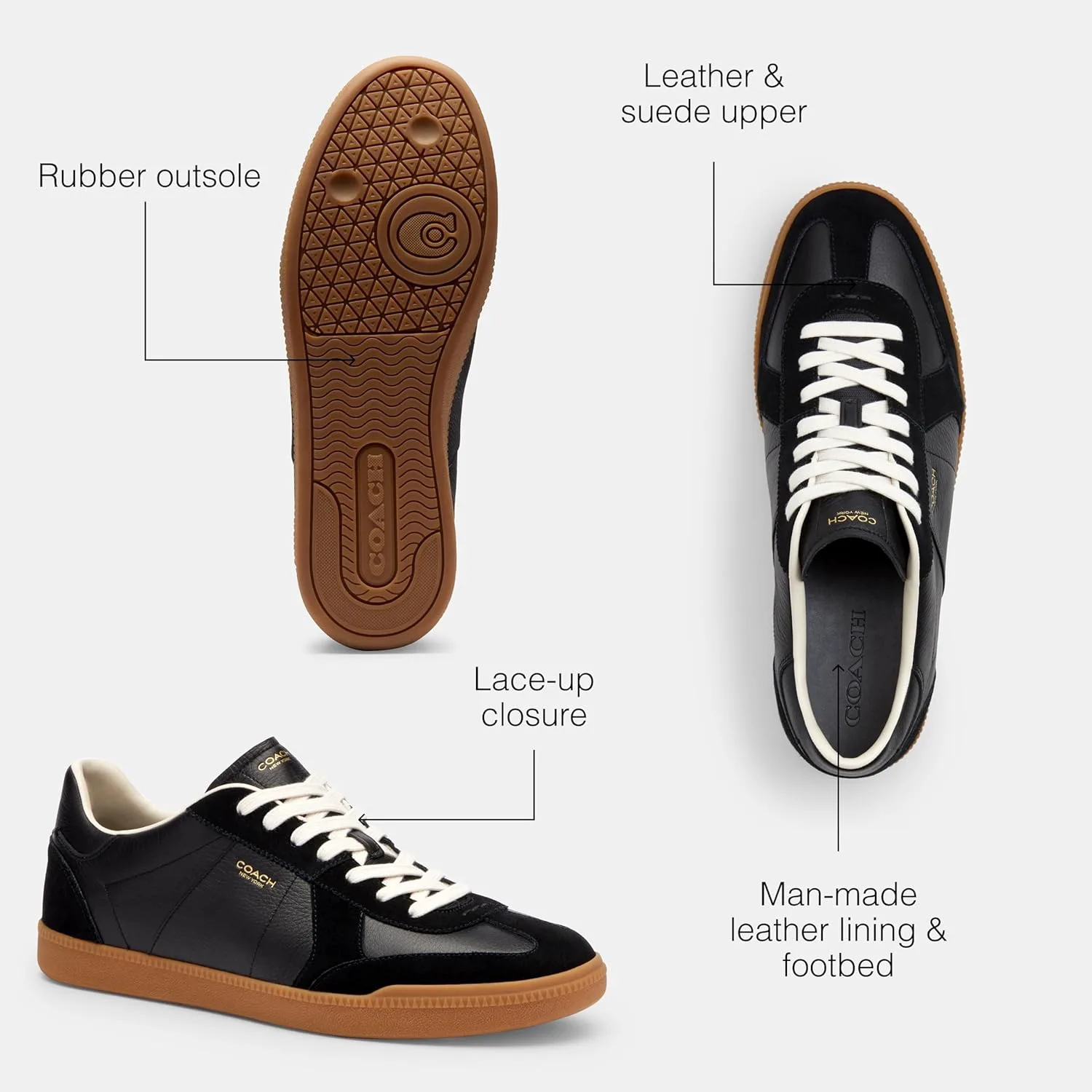 Editor's Notes: Inspired by the effortless cool of New York, the city we've always called home, our Ellis sneaker is a sleek design for everyday Leather & Suede Upper: The upper on these low top men's fashion sneakers is crafted of our soft suede and smooth leather Rubber Outsole: These stylish, casual men's sneakers feature a flat rubber outsole for sturdy traction - perfect for all of life's adventures It's All in the Details: Leather and suede upper, man-made leather lining and footbed, rubber outsole, lace-up closure This is COACH: Having the courage to be real since 1941. COACH is the Original American House of Leather - with a legacy of craft and a community that champions the courage to live authentically