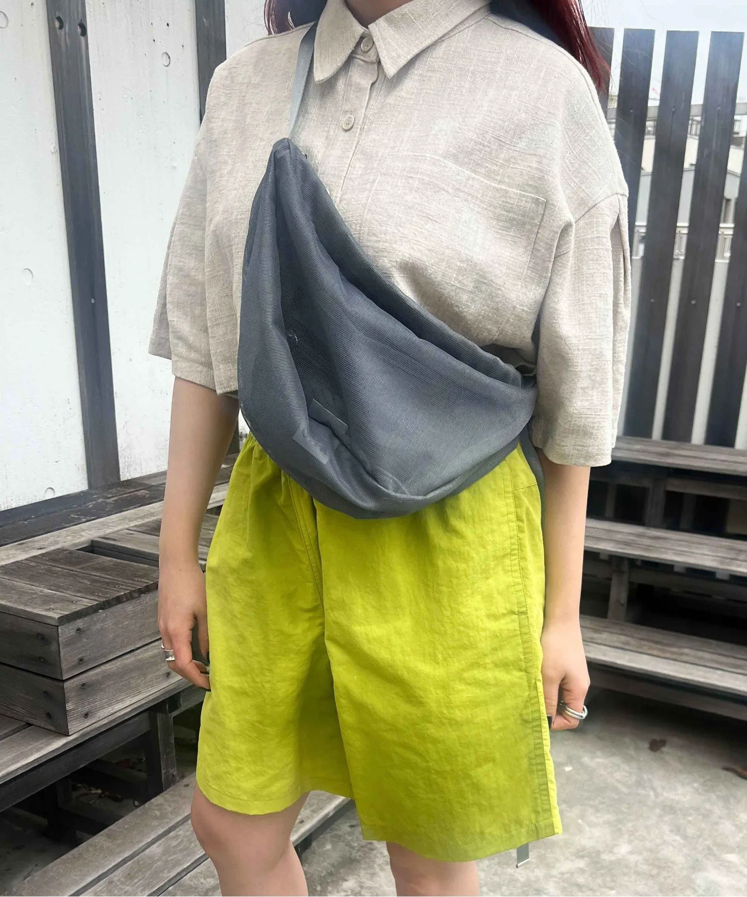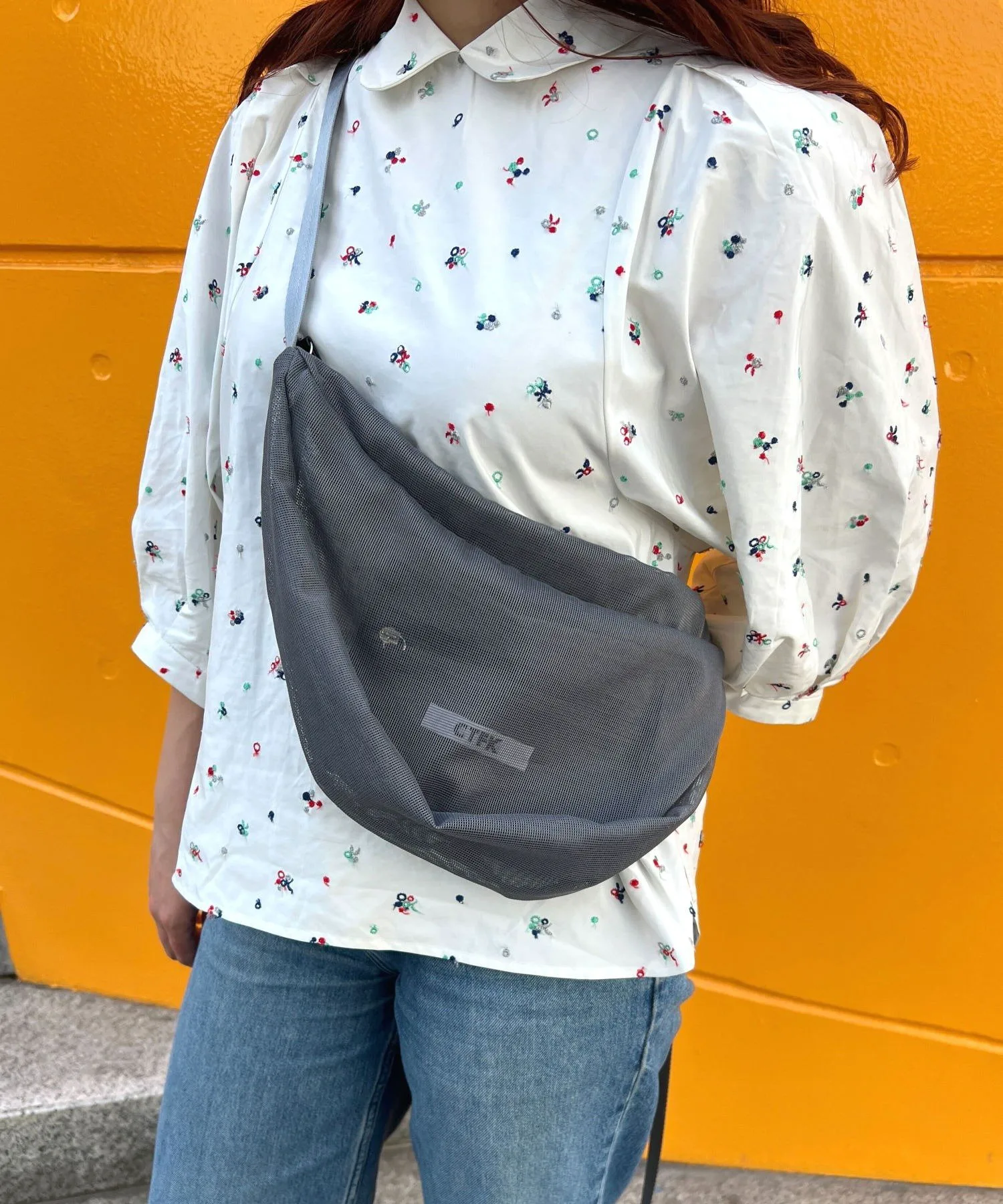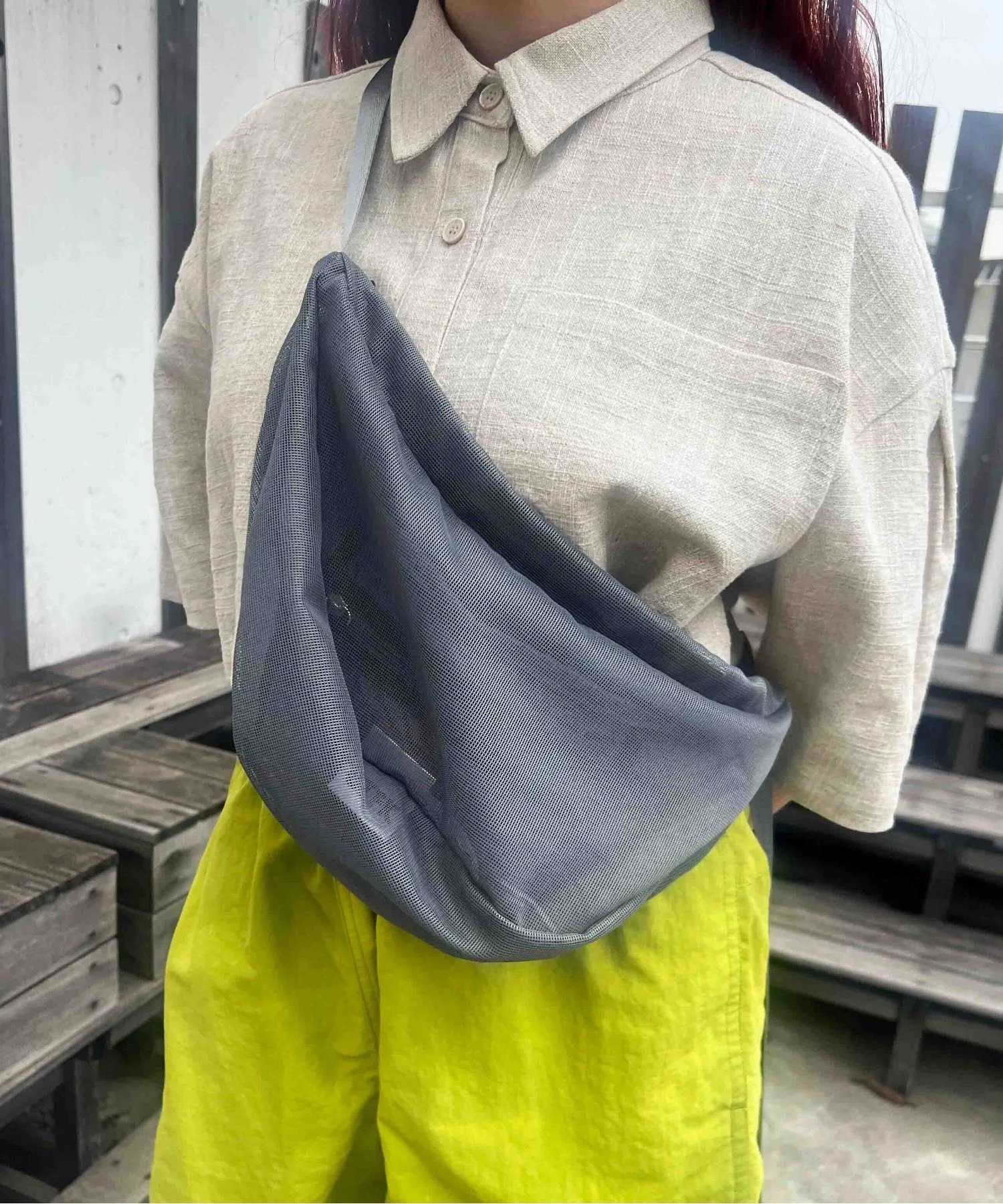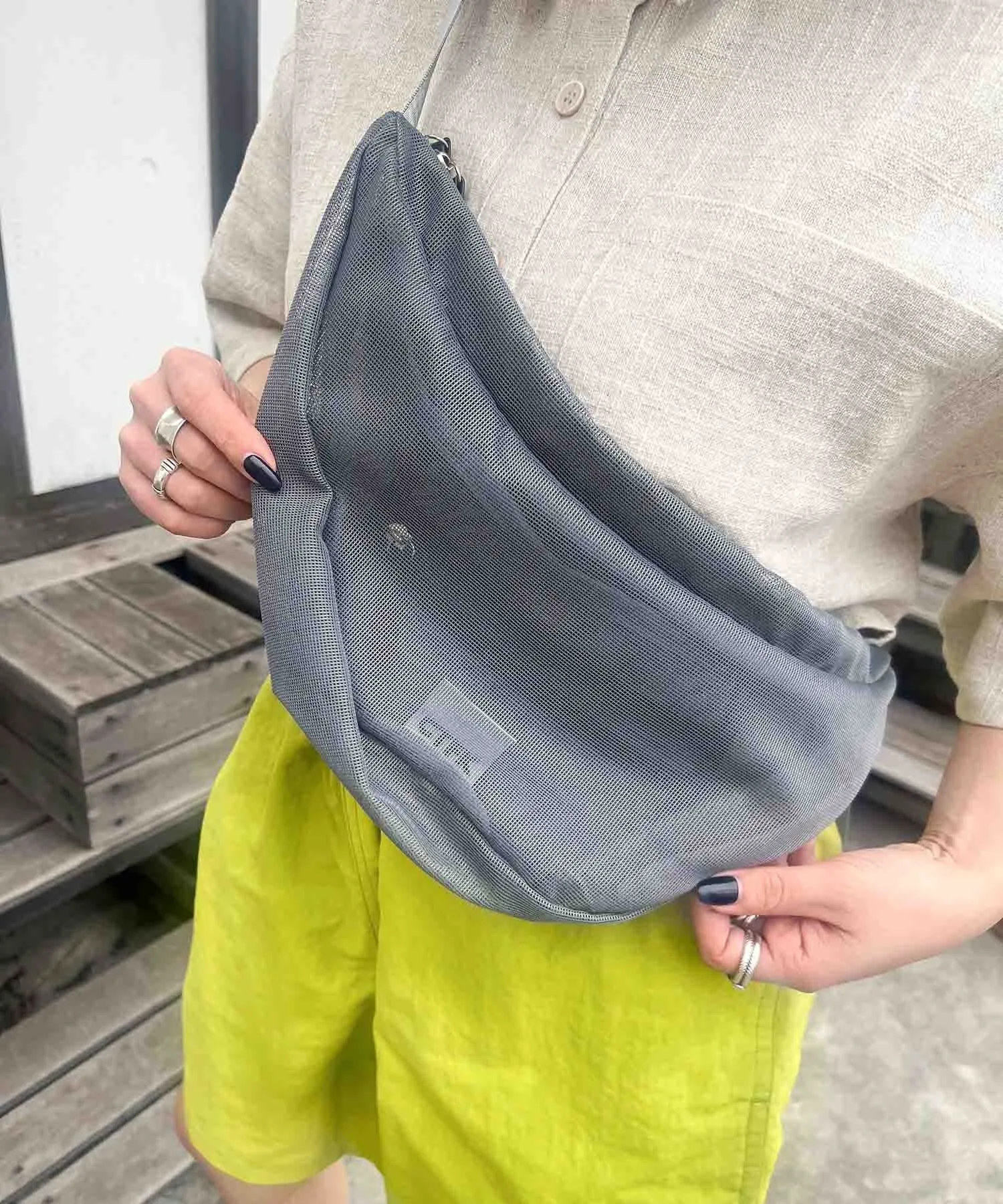 Сумка через плечо в форме полумесяца из прозрачной сетчатой ткани.