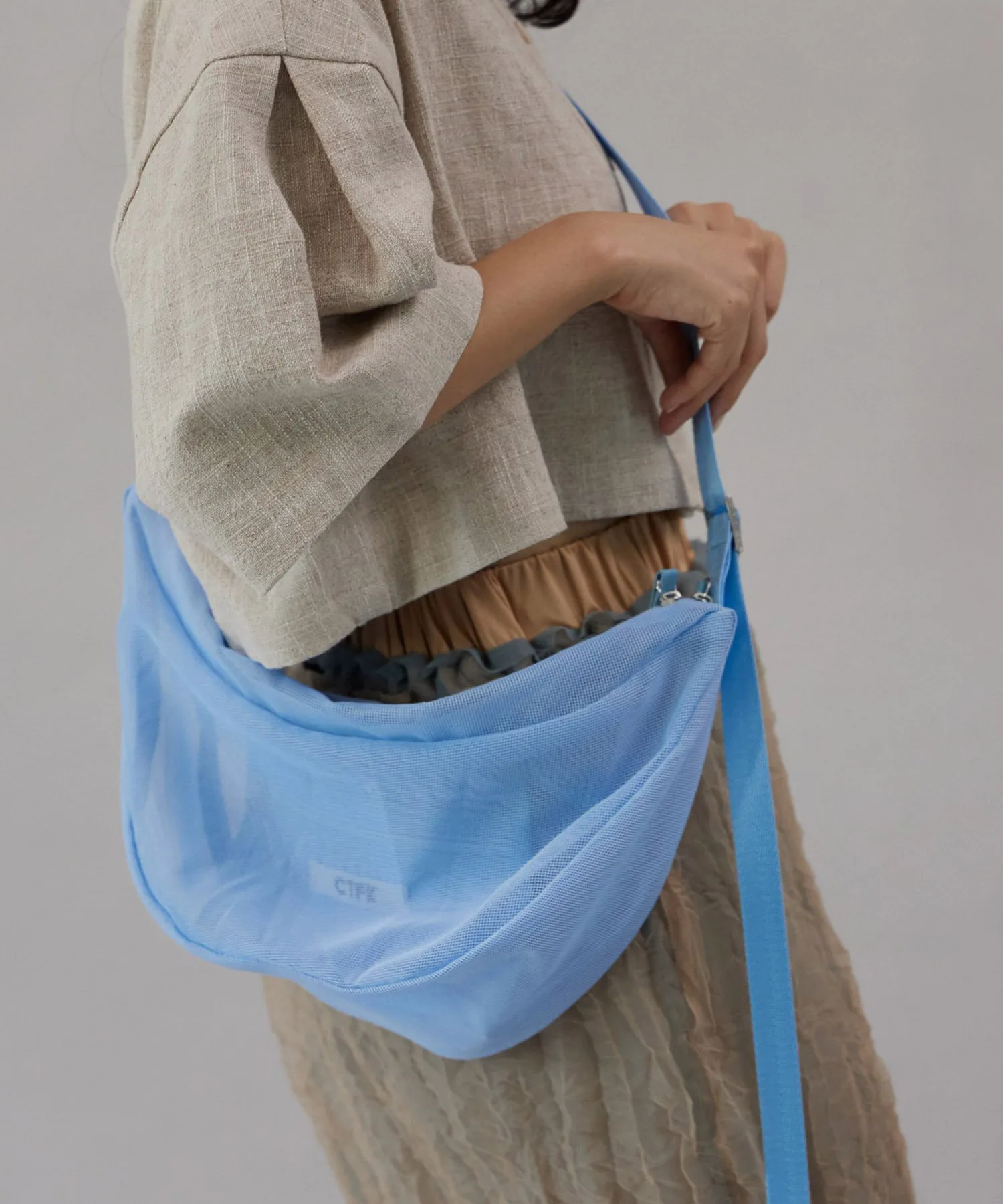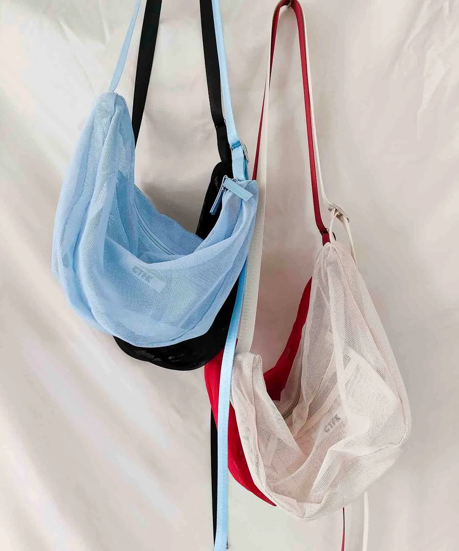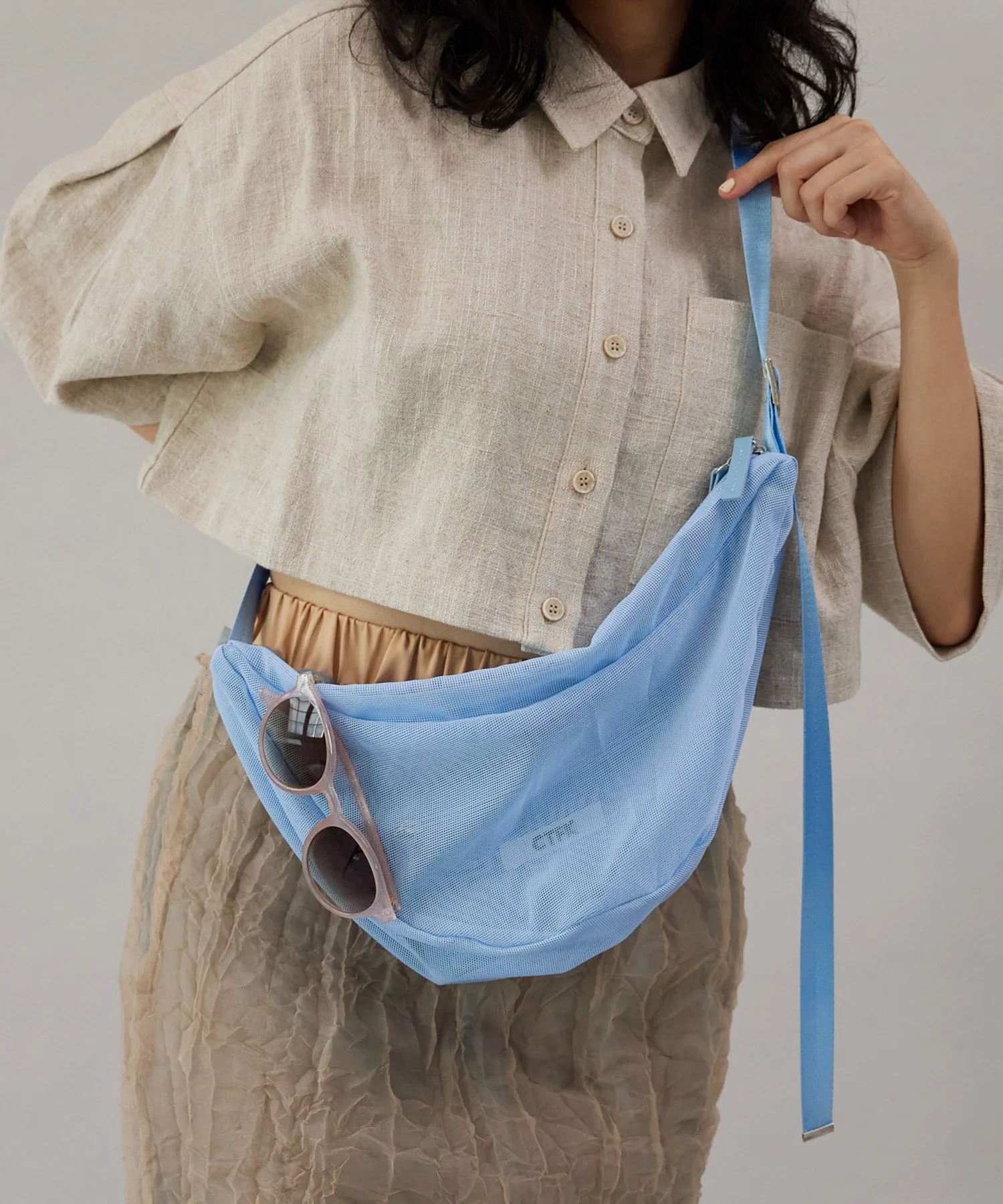 Сумка через плечо в форме полумесяца из прозрачной сетчатой ткани.